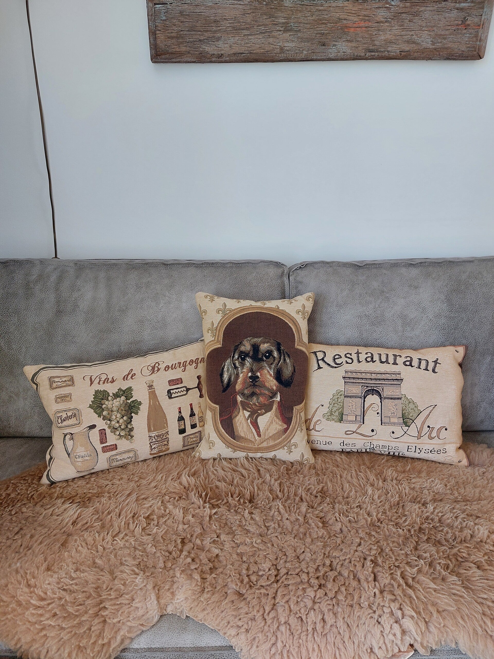 Te leuk zijn deze Vintage Gobelin kussens gevuld met een veren binnenkussen. Prachtige decoraties van een Teckel, wijn, en paris decoratie. Alle 3 op elkaar afgestemd