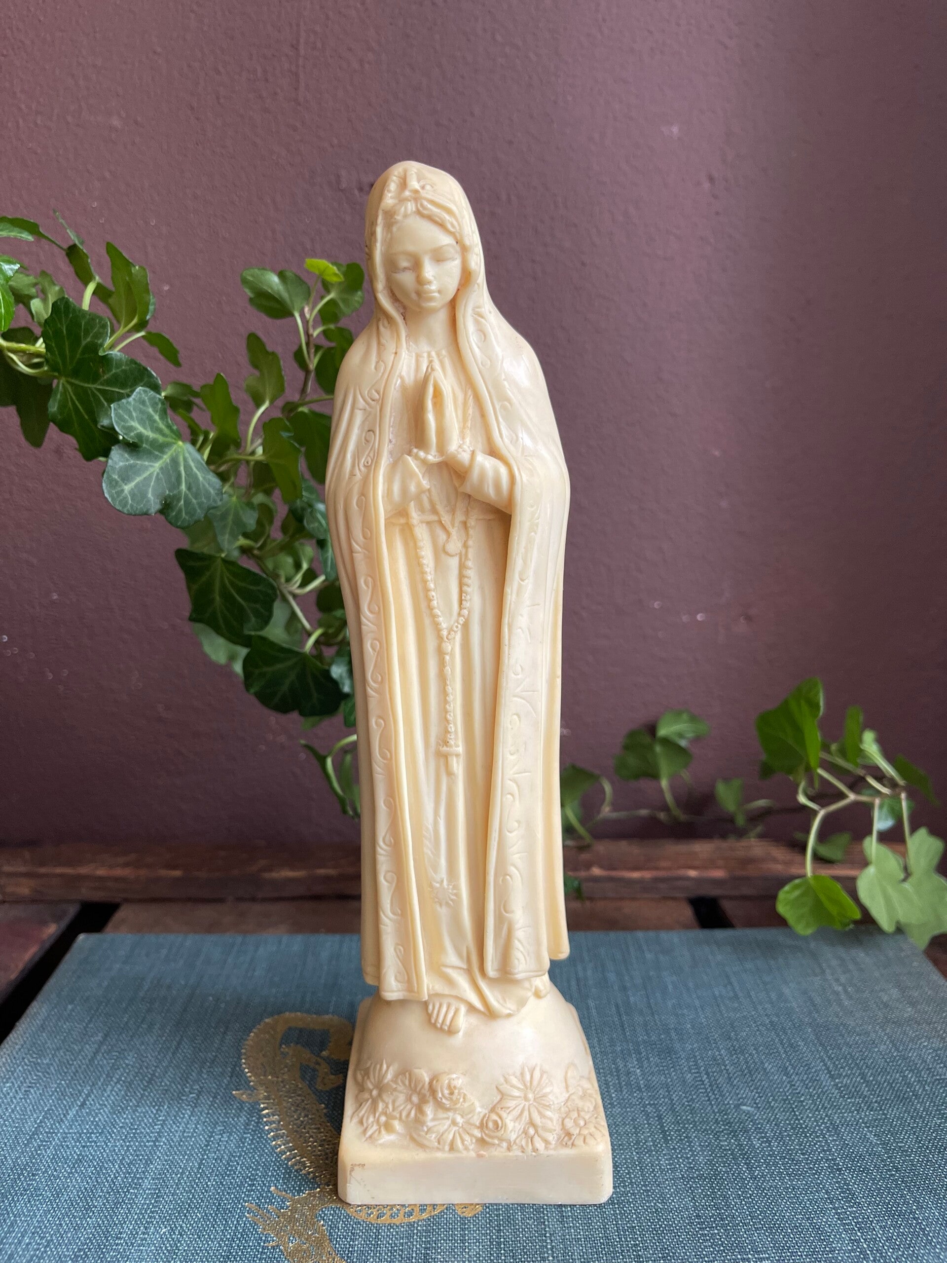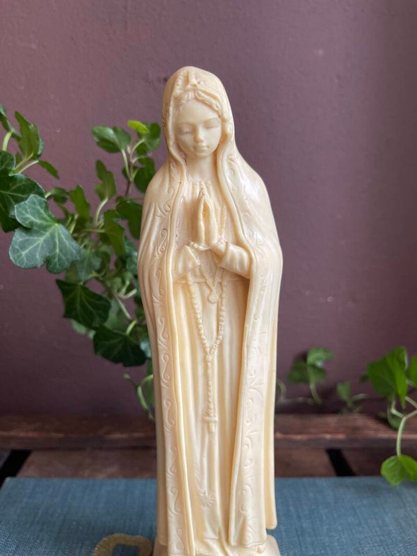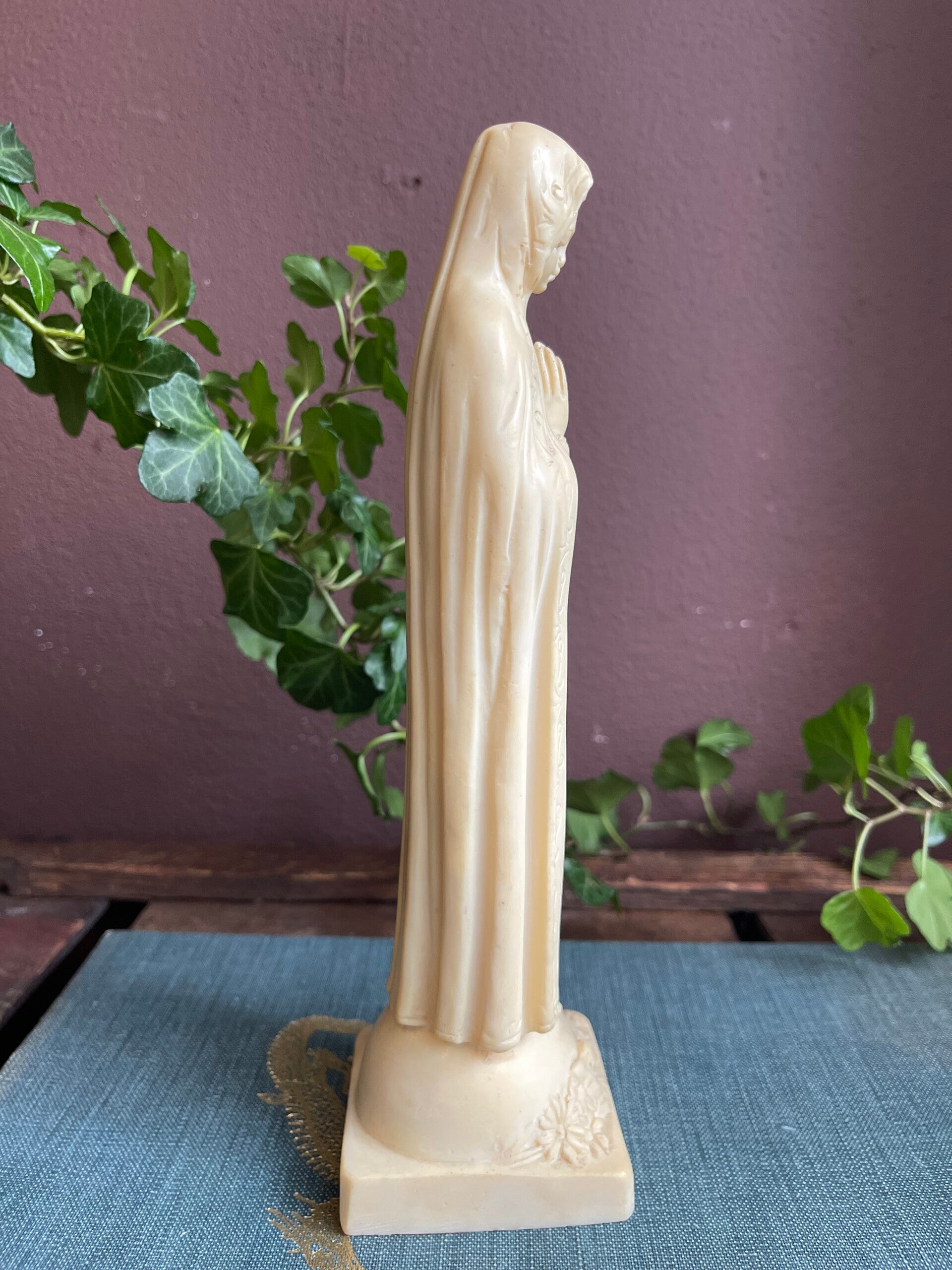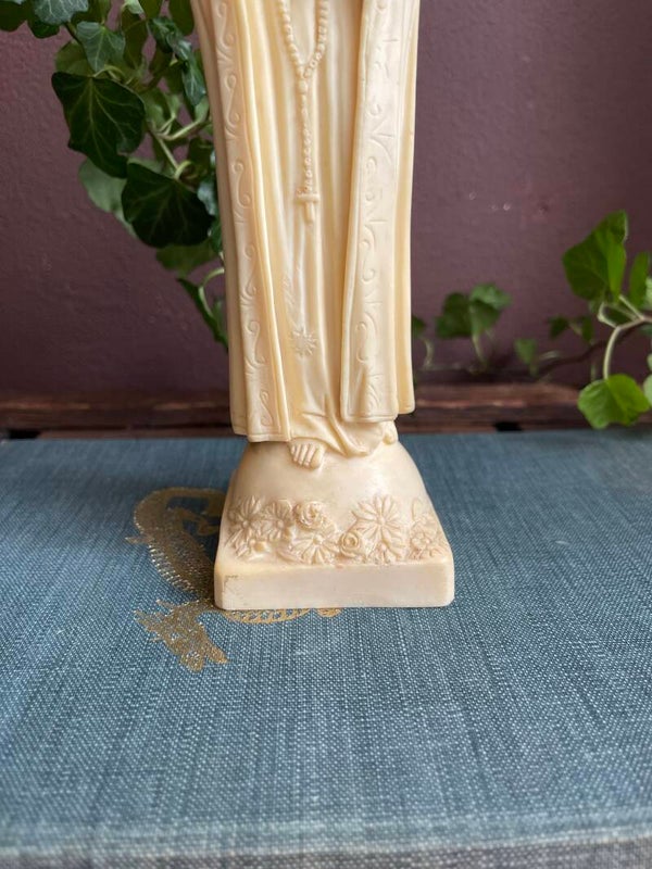 Prachtig sereen Mariabeeld van - waarschijnlijk - ivorine. De details zijn werkelijk prachtig uitgesneden! Onderop te zien dat dit beeld afkomstig is uit Rome.