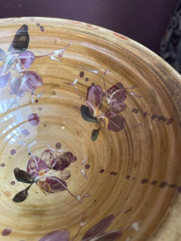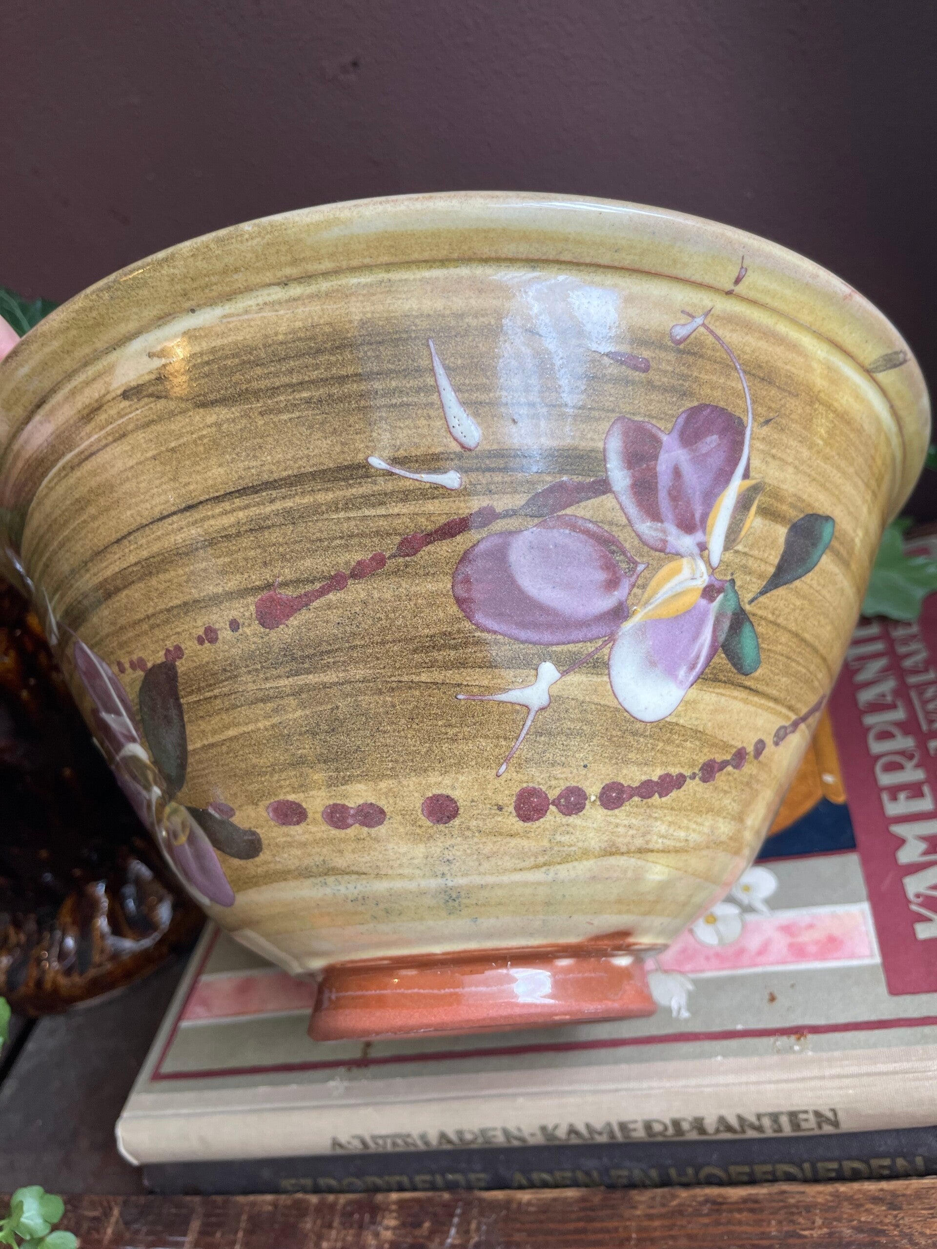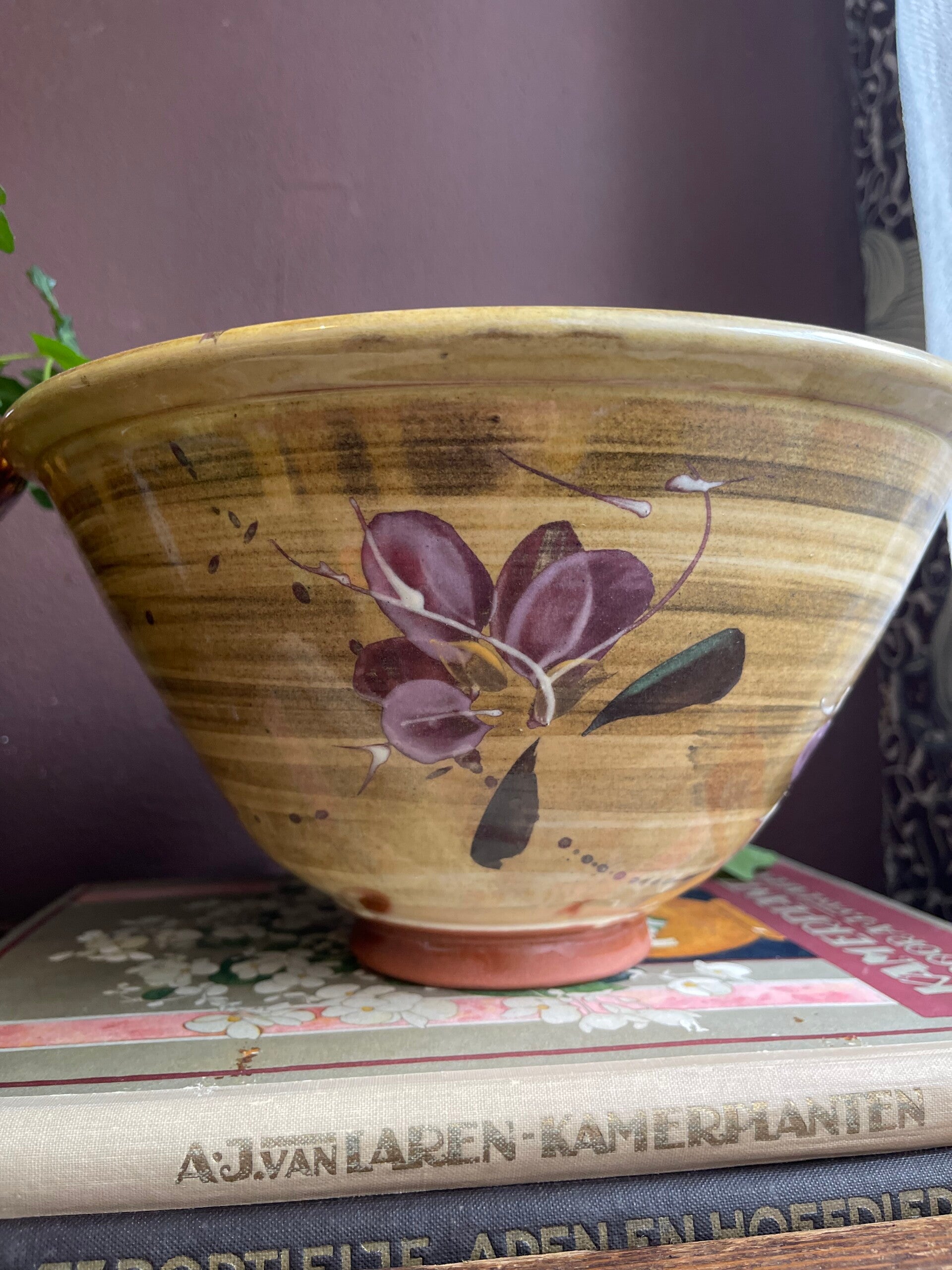 Prachtige grote kom gemaakt van aardewerk. Beschilderd met bloemen welke prachtig uitkomen in de beige ondergrond. Plaatje voor op tafel!