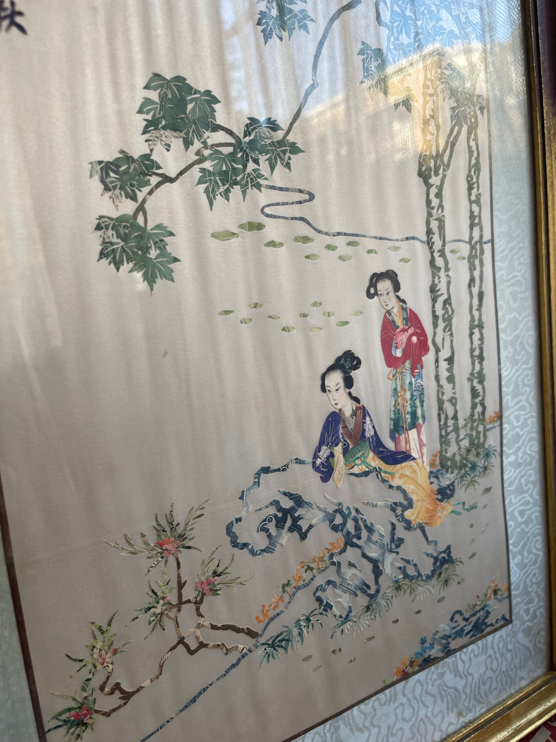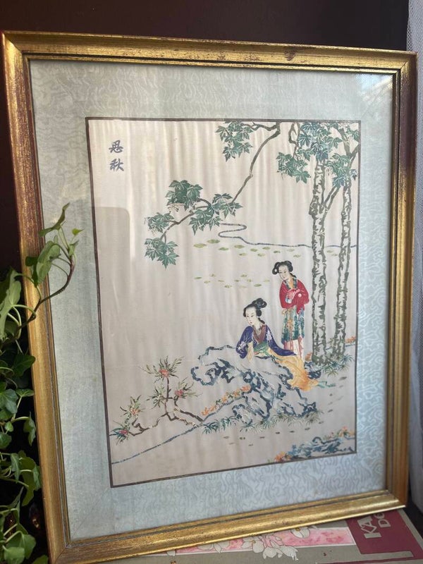 Prachtig Oosters kader van borduur op zijde. Een Oosters tafereel van geisha's in de natuur. Prachtig sereen plaatje in goudkleurige lijst!