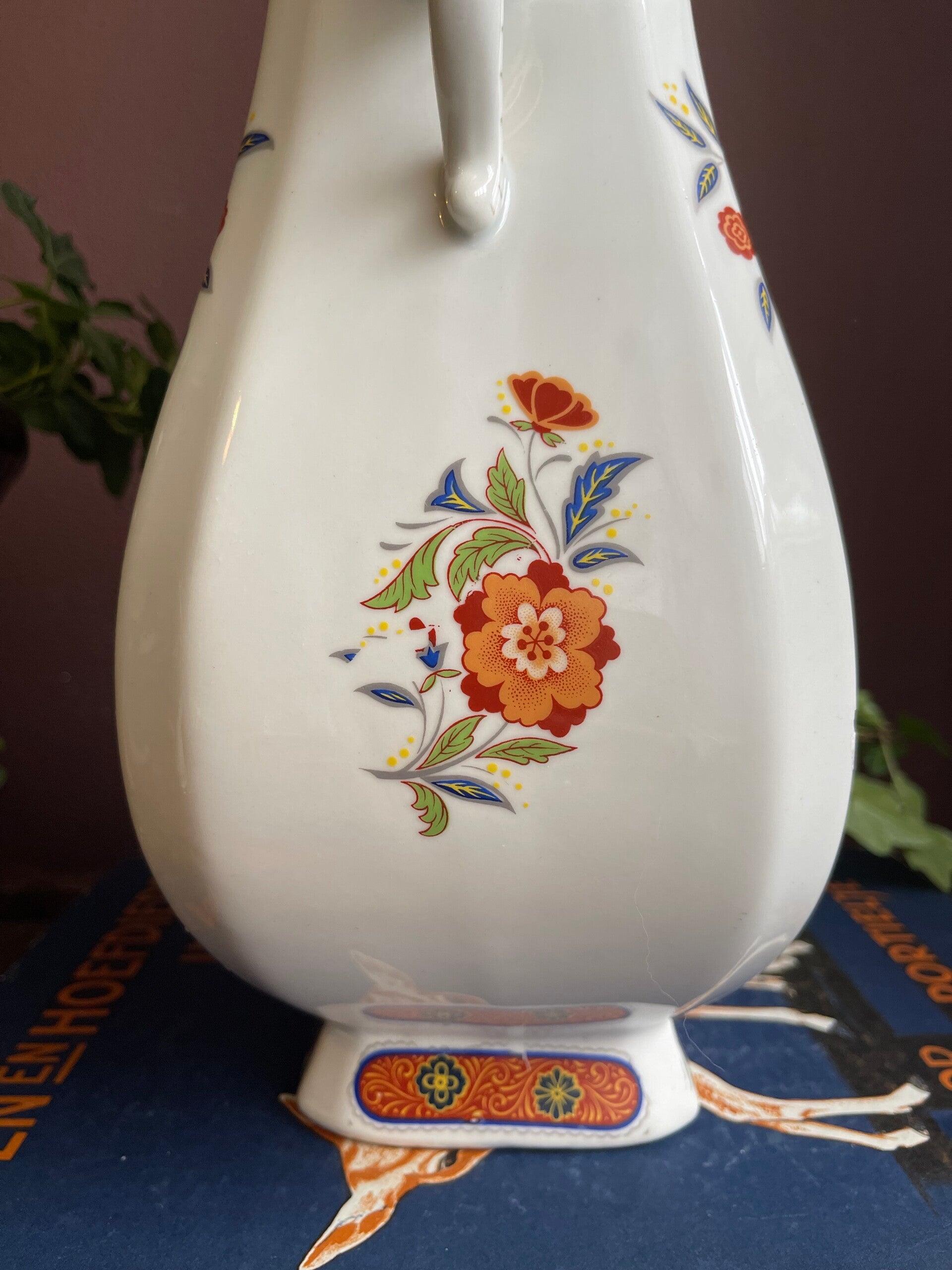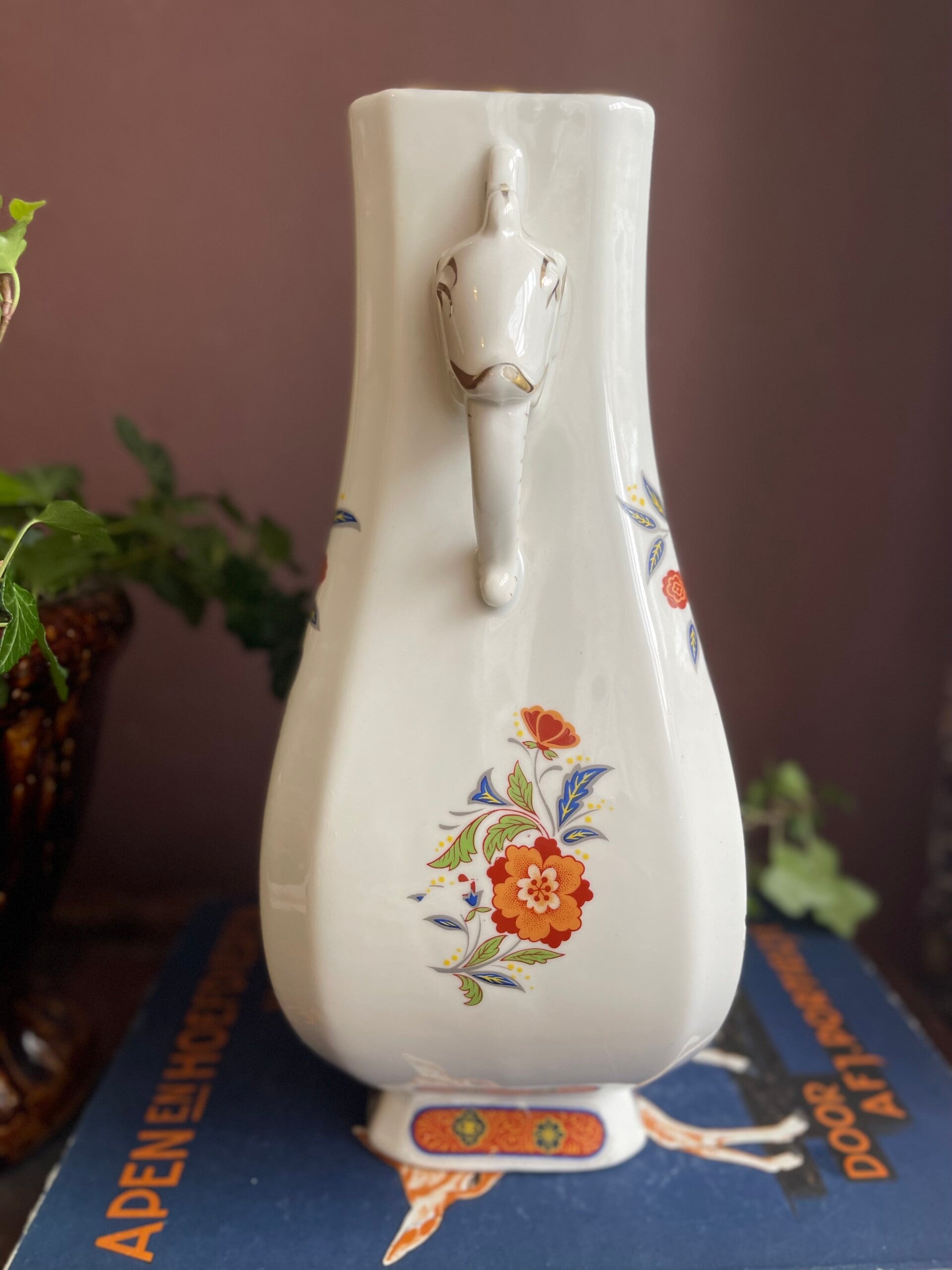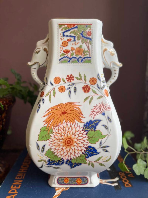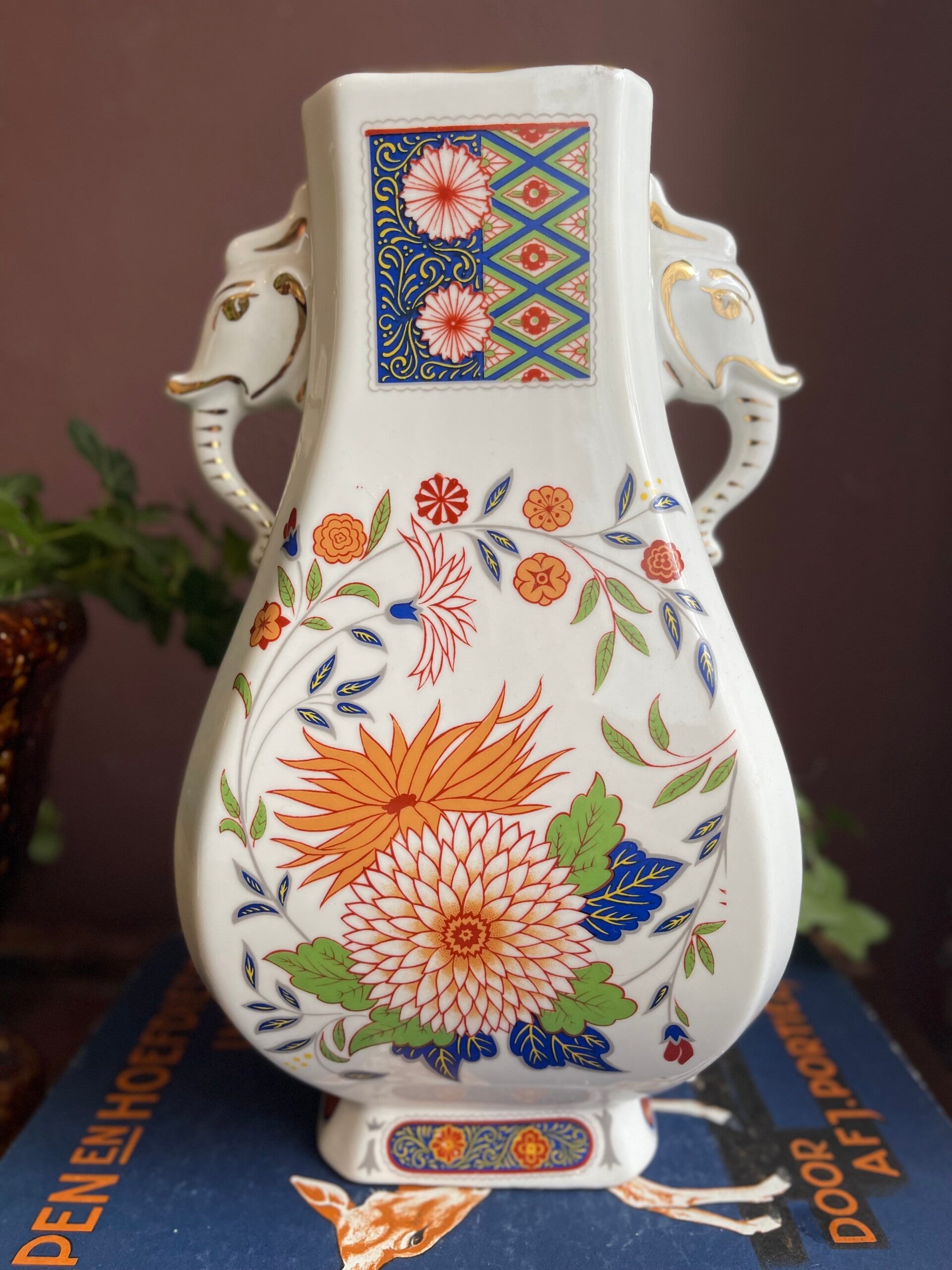 Hoe kek is deze vaas! Uniek door de oren in de vorm van olifanten. Aan de voor- en achterzijde met bloemenprint. Aan beide kanten een andere print, leuk ter afwisseling! Onderop genummerd.