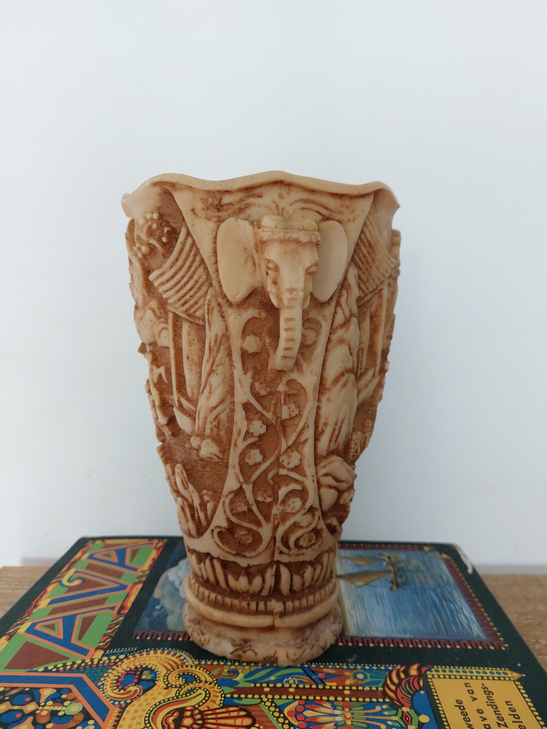 Wat een plaatje is deze zware Ivorine olifanten vaas met verschillende Chinese taferelen in reliëf. De olifanten dienen als de oren van de vaas. Vintage oneffenheid aan de hals van de vaas. Zie laatste foto. Meegenomen in de prijs.