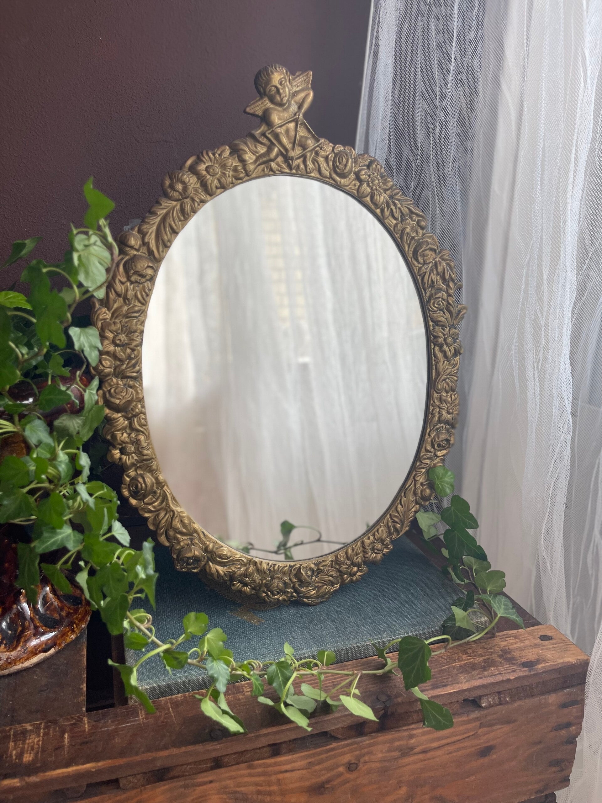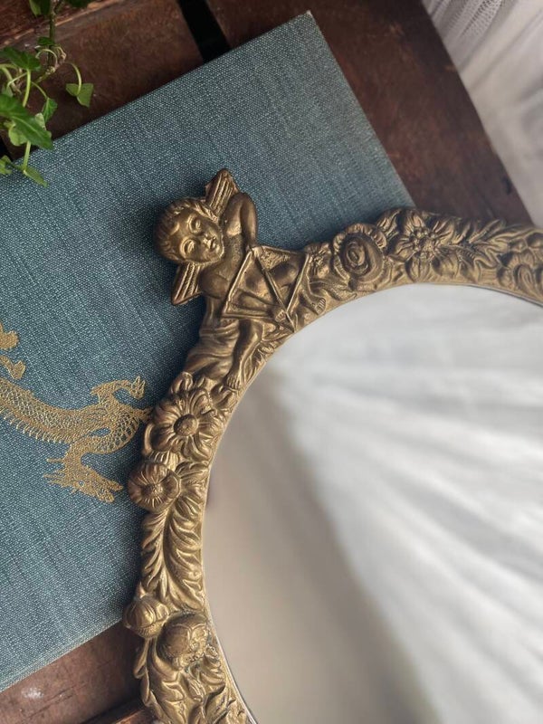Prachtige messing spiegel met bloemenrand en op de kop een engeltje. Op te hangen aan het haakje aan de achterkant. Kortom, een parel!
