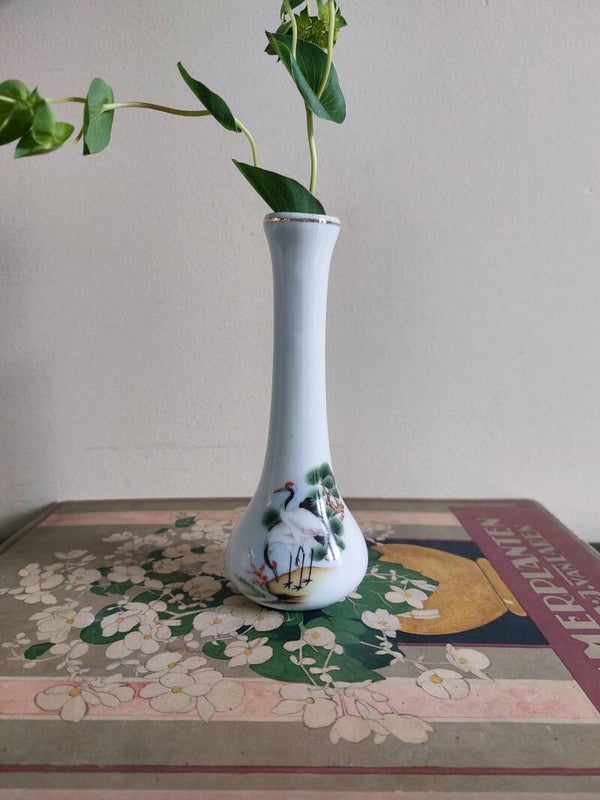 Wat een cute porseleinen vaasje. Mooi gedecoreerd met kraanvogels. Leuk om veld bloemetjes in te zetten of een enkele bloem.