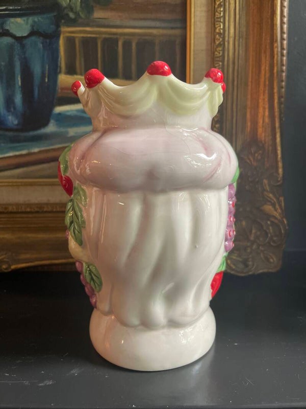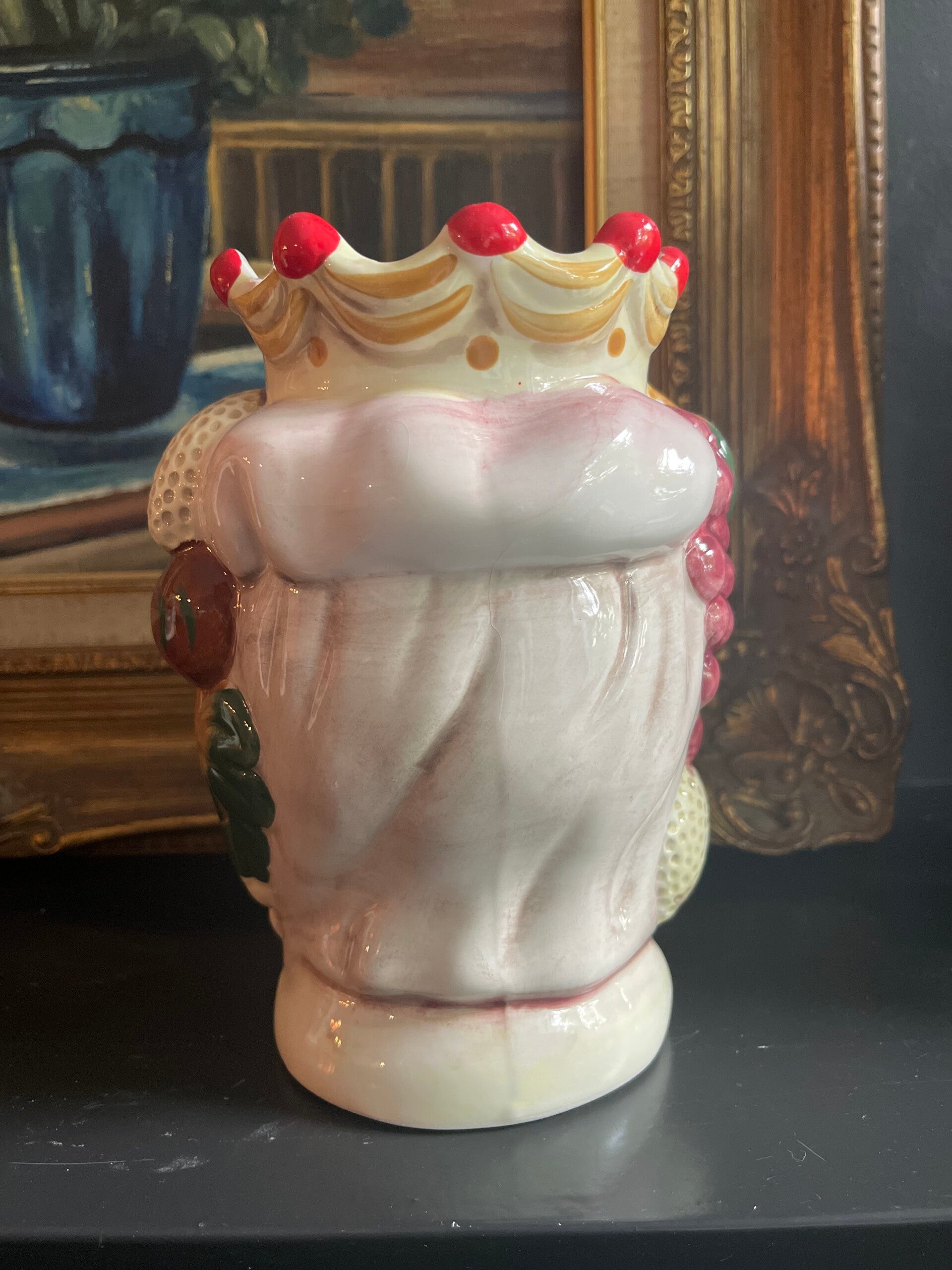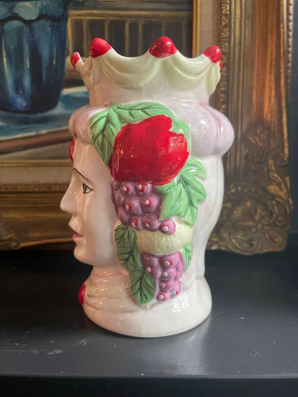 Prachtig Teste di Moro koppeltje met fruit. Wat een kleurrijk geheel! Gemaakt van porselein en te gebruiken als vaasje. Al zijn ze zonder kapsel van bloemen ook al enig!