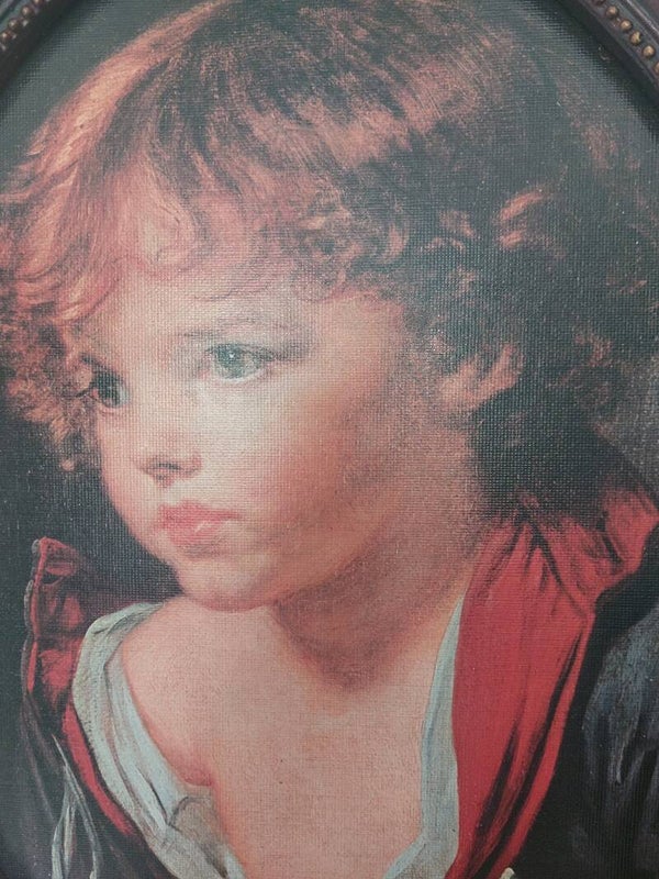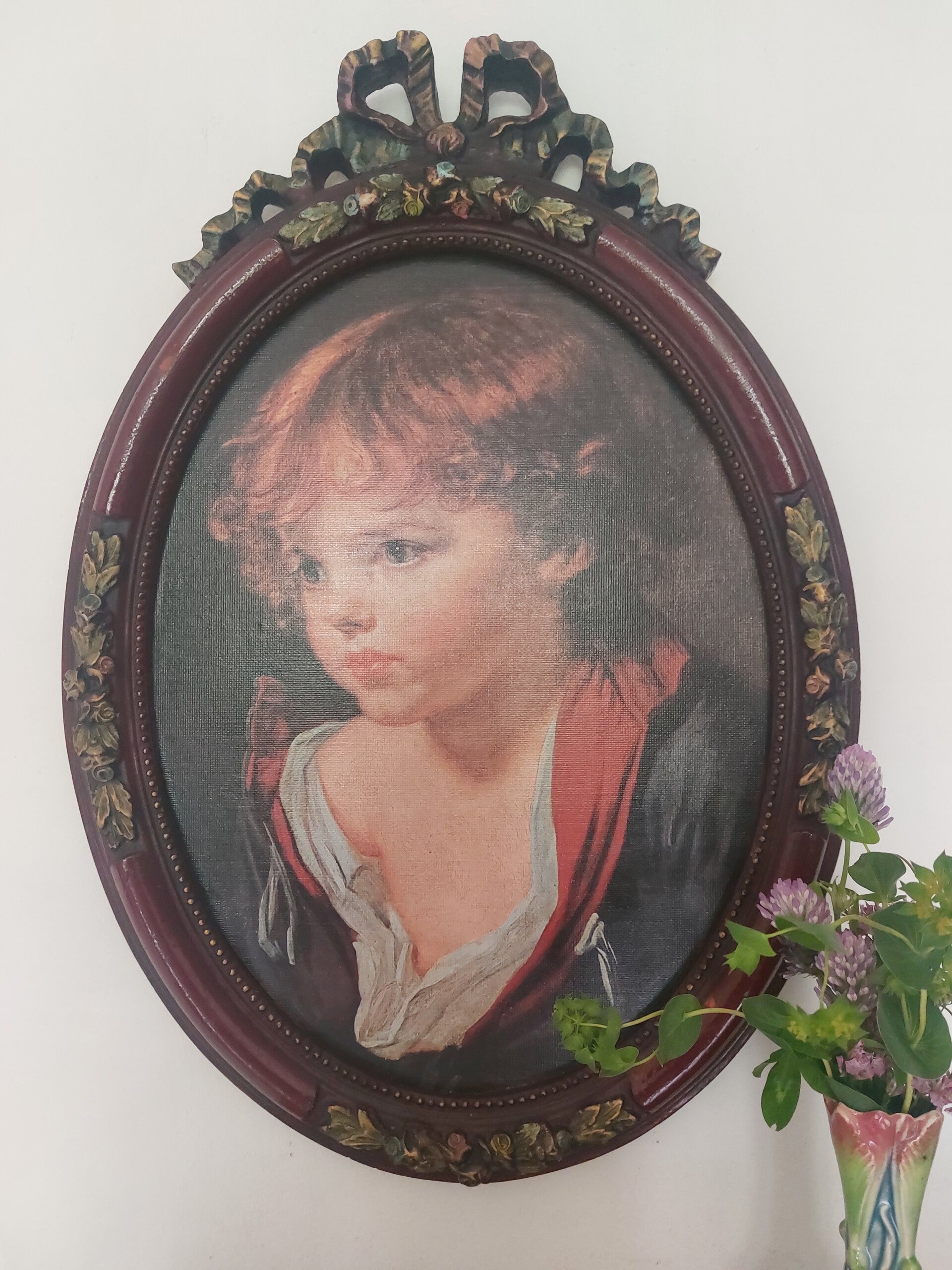Het blonde kind van Jean-Baptiste Greuze (Franse kunstschilder) gezet in een adembenemende ovale lijst. Een reproductie in de Renaissance stijl. Prachtige oude lijst versierd met floral.