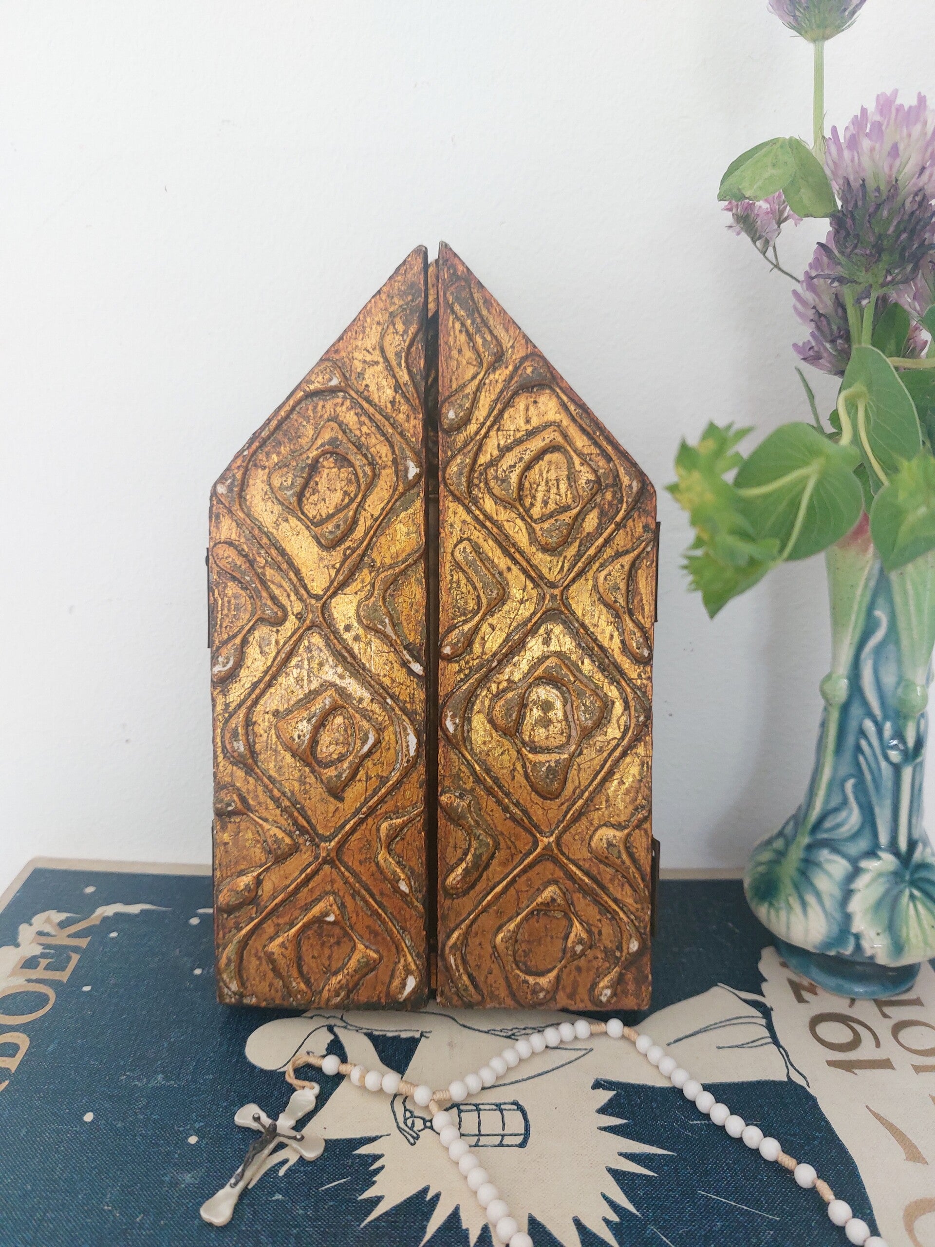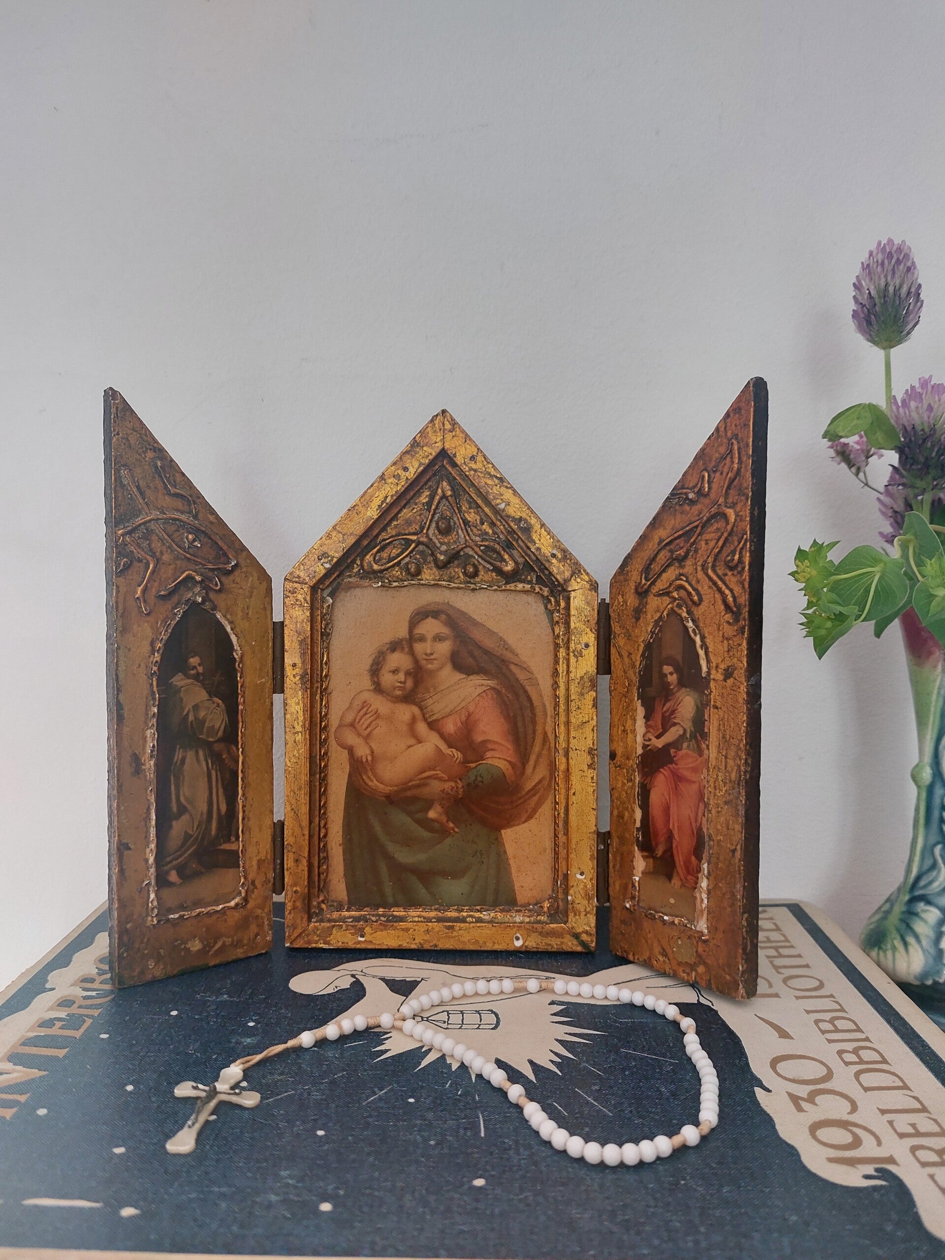 Oud religieus drieluik. Prachtige afbeeldingen van religieuze figuren. Gemaakt van hout. Mooie versieringen op het hout. Vintage oneffenheid op de rechterkant.