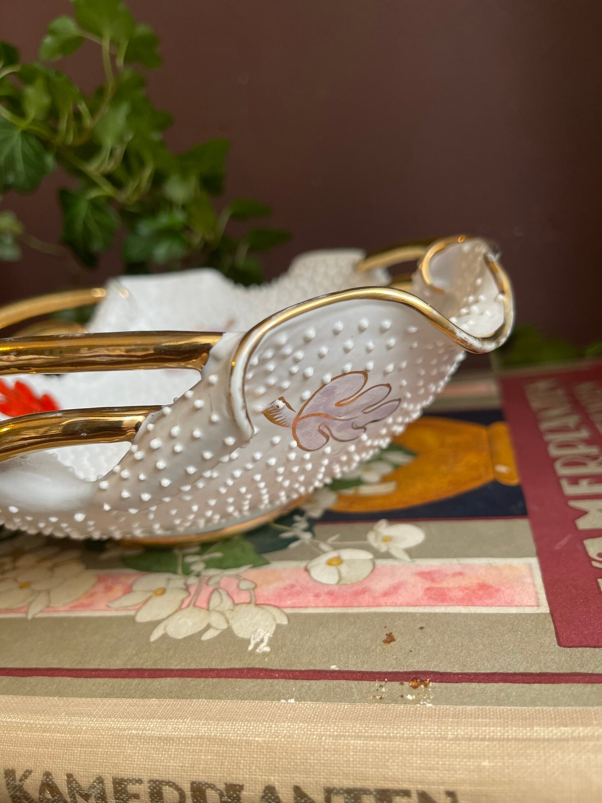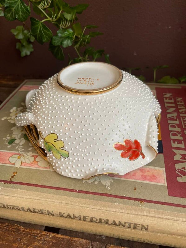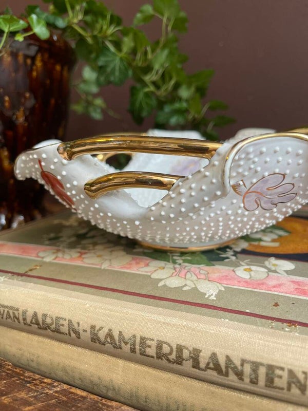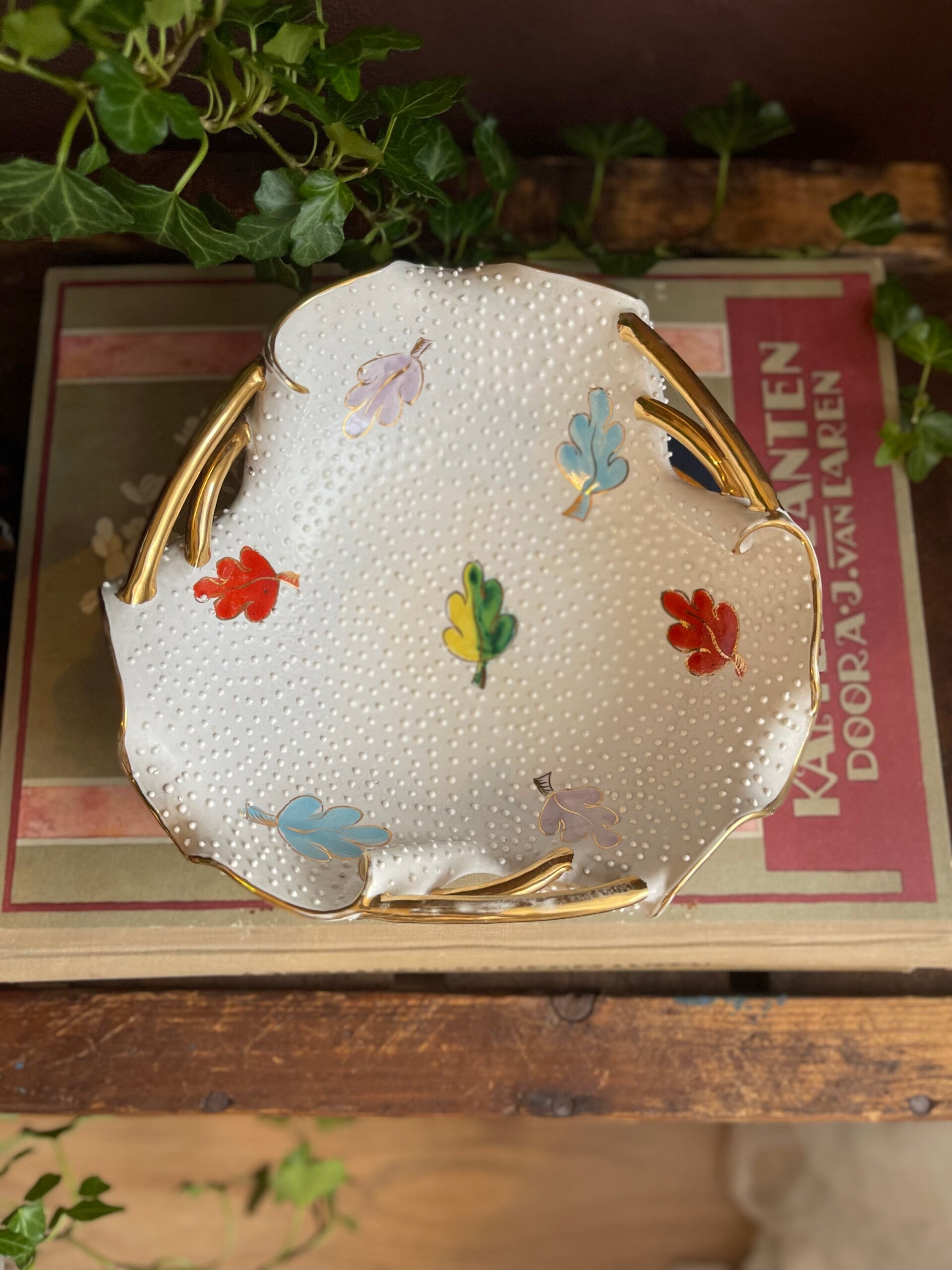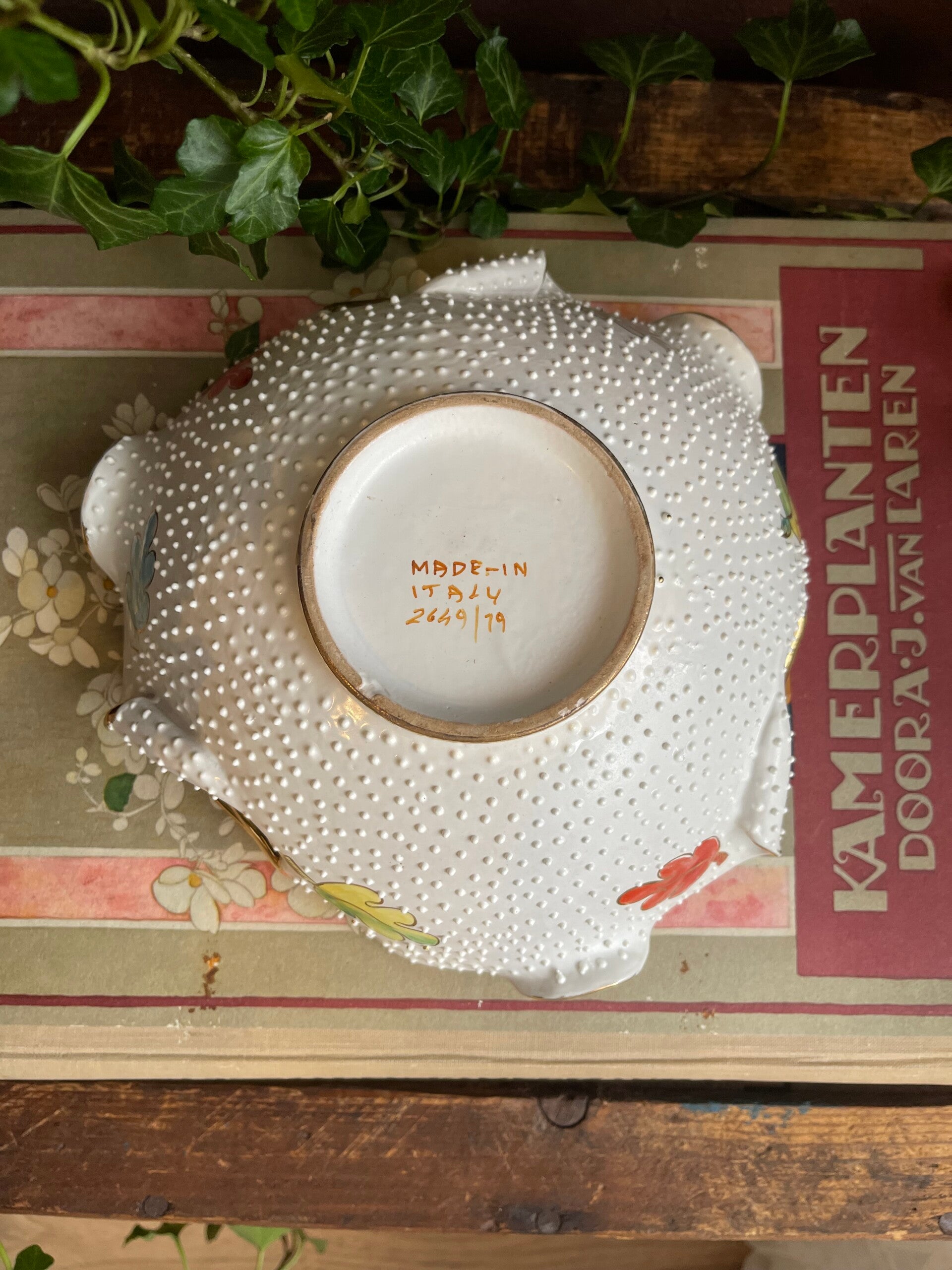 Prachtige schaal van Italiaanse makelij. Bewerkt met filigrain en beschilderd met bladeren en gouden randen. Wat een pareltje is dit!