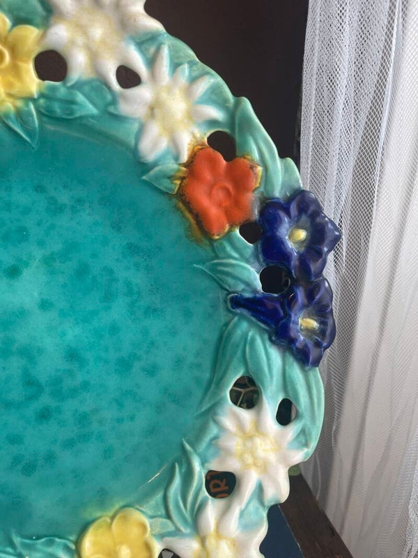 Mooie aqua blauwe schaal. Wat een feestje op tafel met de prachtige kleuren. Hoe bijzonder is de bloemenrand verwerkt in het aardewerk. Prachtig!
