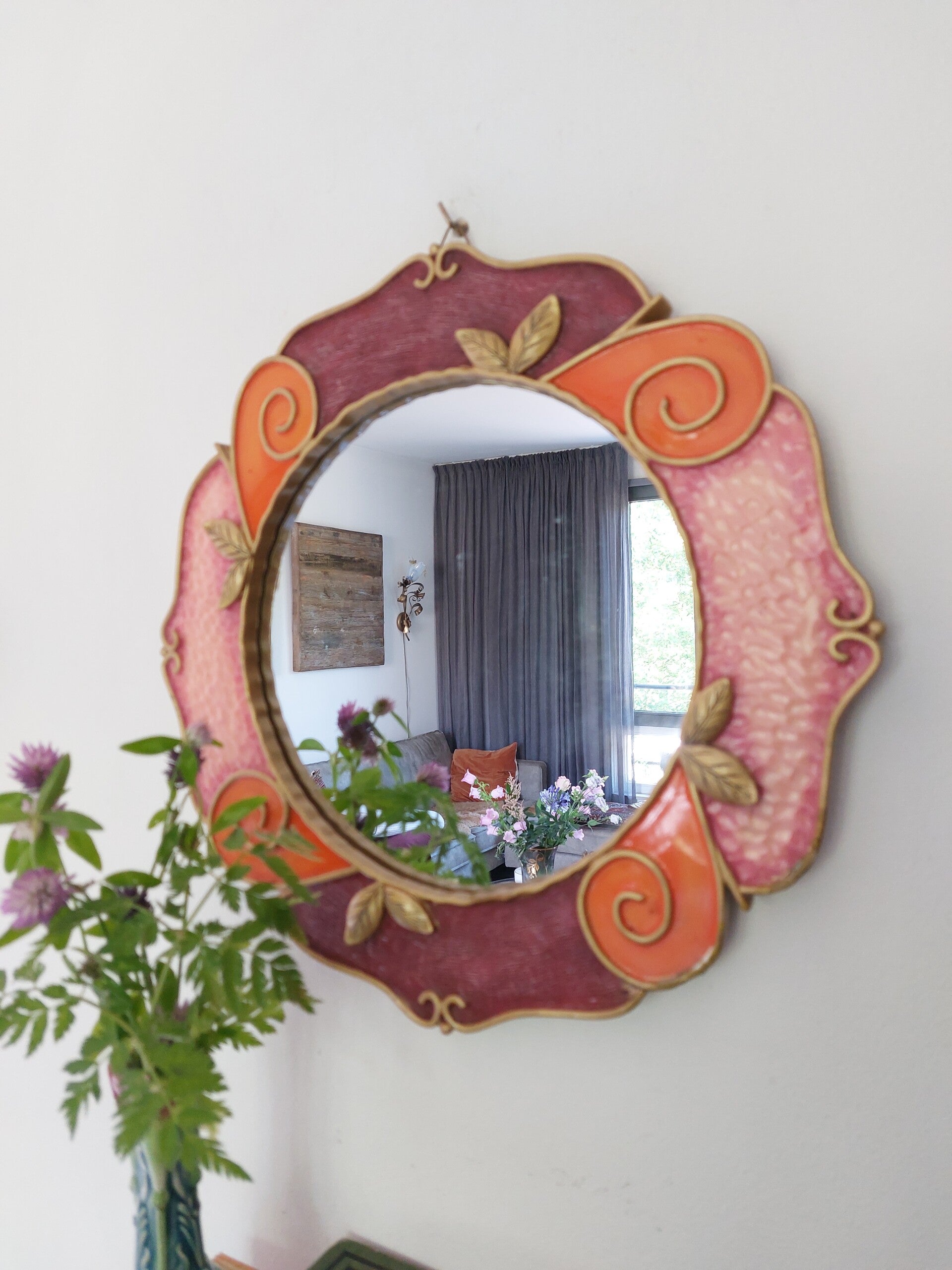 Wat een beauty is deze prachtige Vintage spiegel uit France. Wat een mooie kleuren en leuke details op de randen. Zo komen wij ze niet vaak tegen.