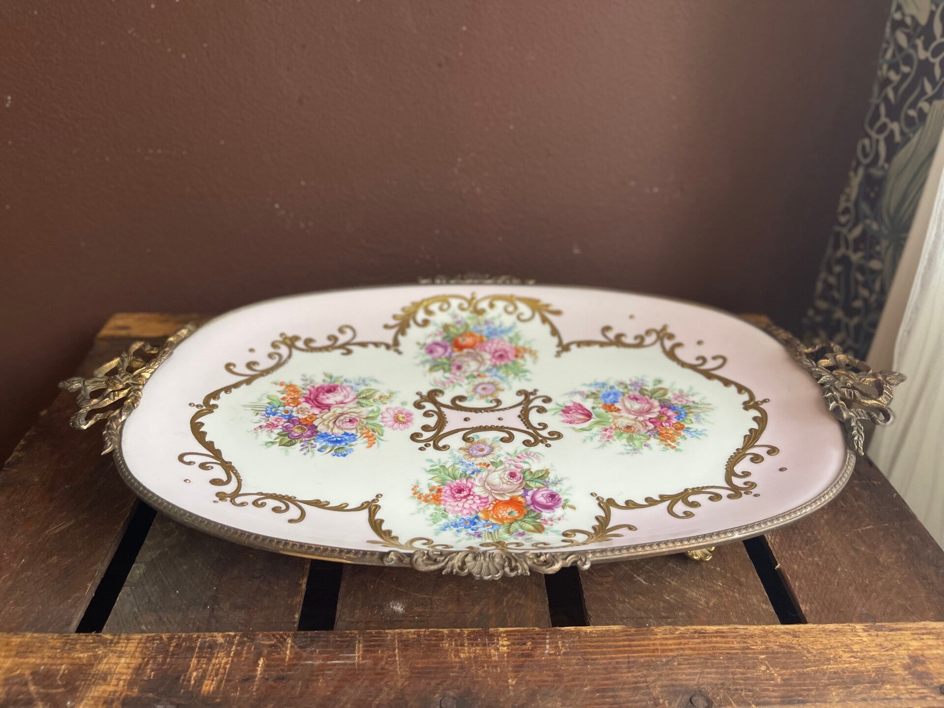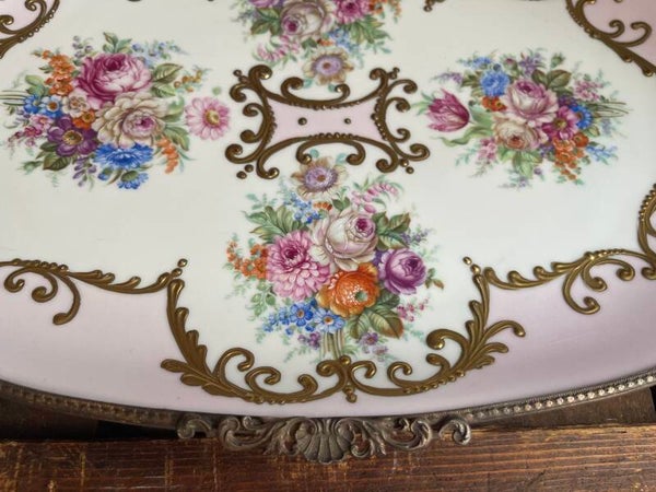 Prachtige Limoges serveerschaal met roze en bloemen. Afgewerkt met goudkleurige sierlijke randen. De schaal staat op goudkleurige pootjes, een vintage pareltje.