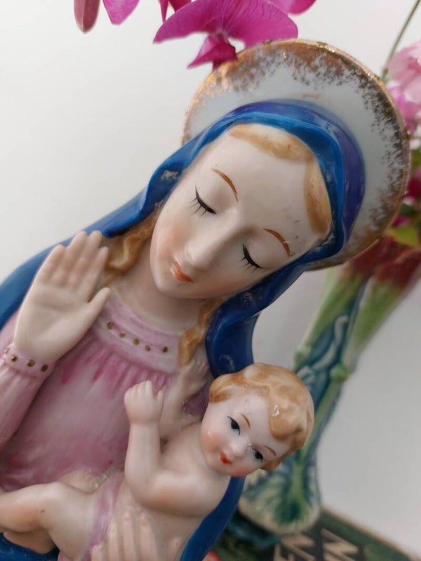 Wat een mooi Vintage Maria&kind beeld gestyled op een Antieke console. Maria is van porselein en opvallend detail zijn de roosjes. Prachtige kleuren. De gouden console is gemaakt van polystone en heeft mooie versieringen.