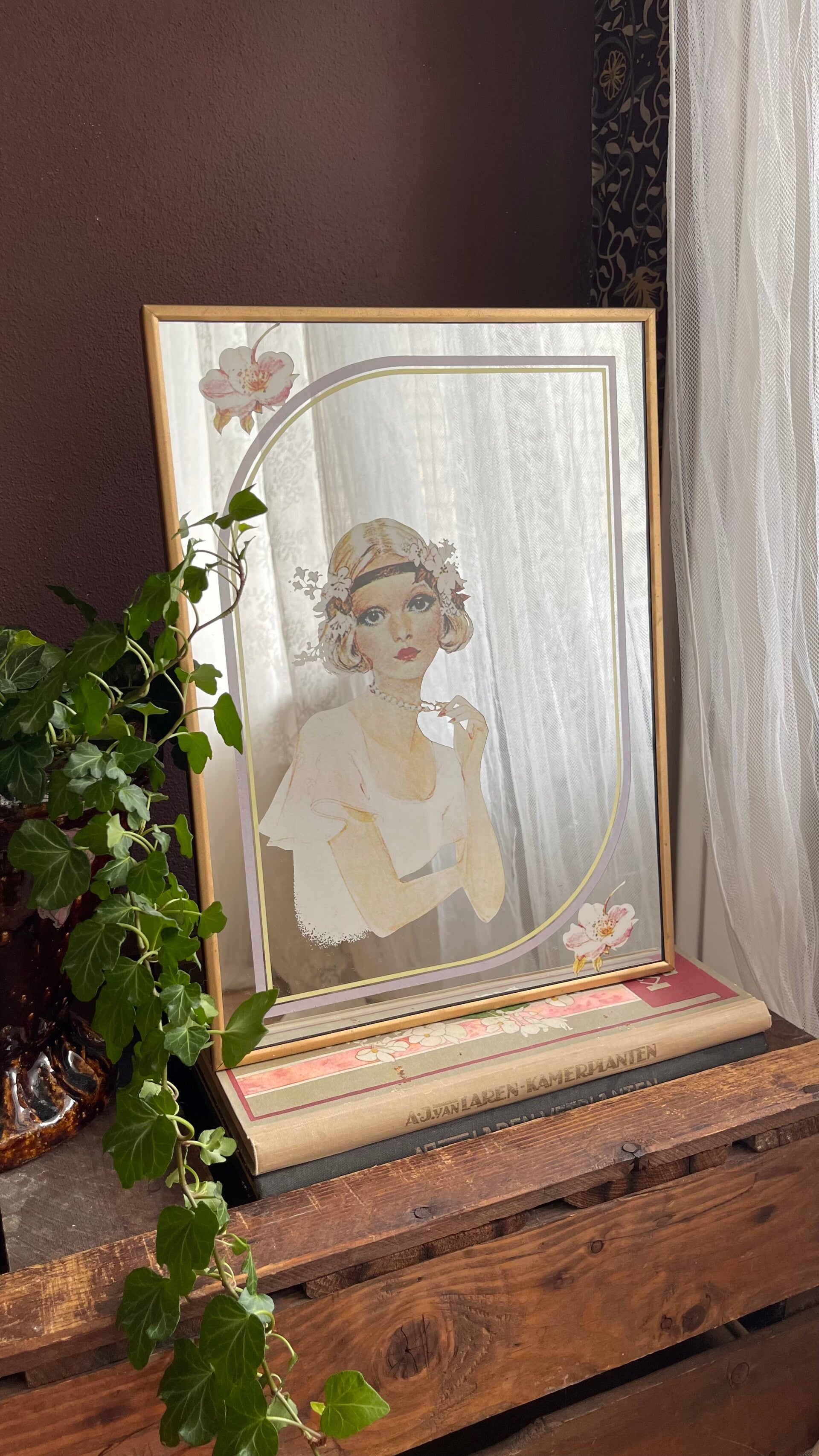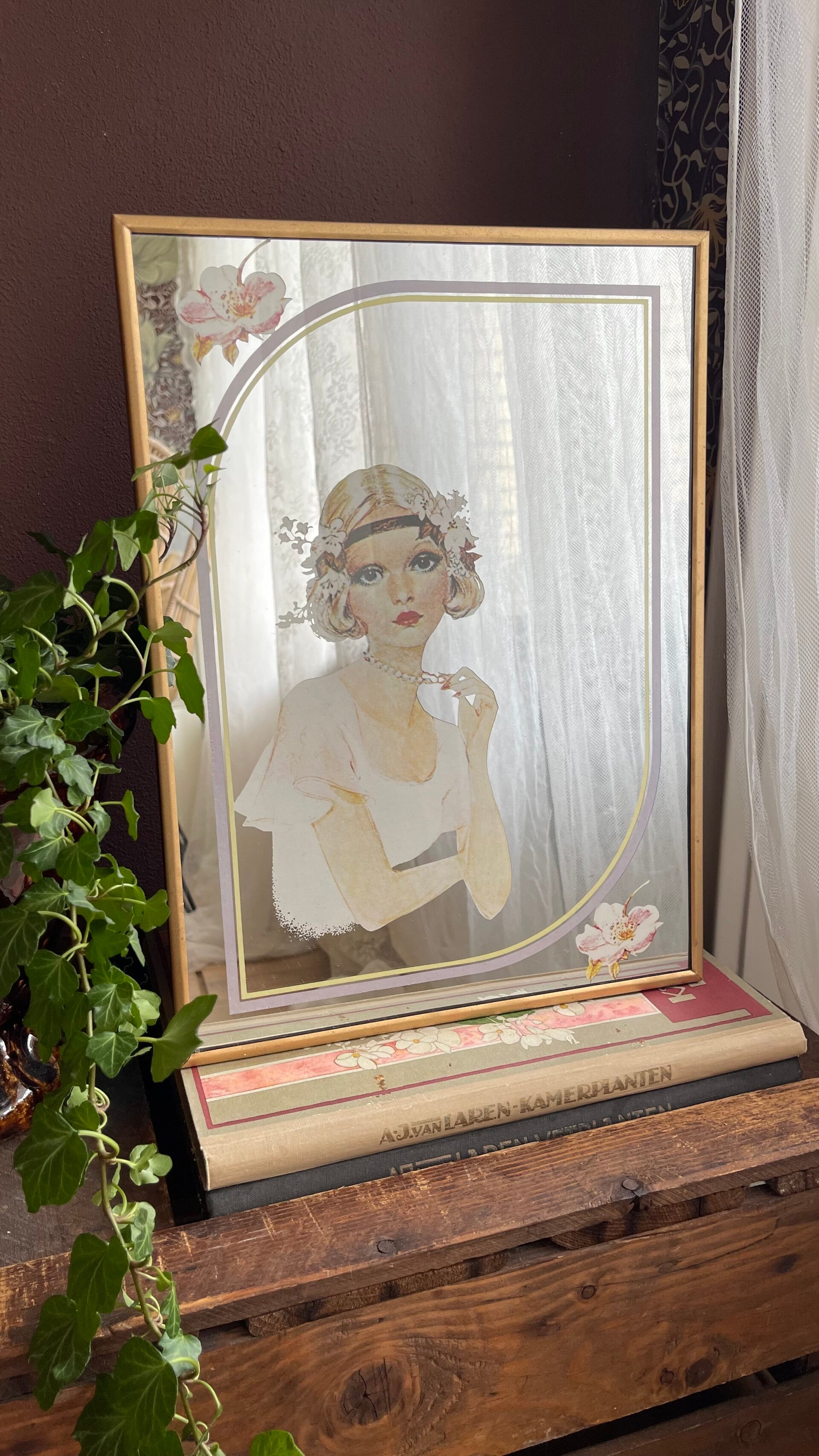 Art Nouveau stijl spiegel. De afgebeelde vrouw is chique en in art nouveau stijl. Hoe leuk deze te stylen op een foto wand tussen allerlei andere lijstjes. Of op een mooi klein plekje, bijvoorbeeld in inloopkast of toilet.