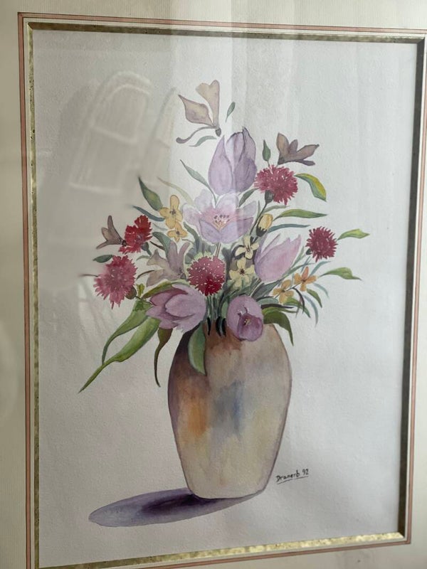 Mooie aquarel in lijst. De zachtroze kleuren geven het geheel een mooi beeld. Gezet in passé partout met gouden rand.