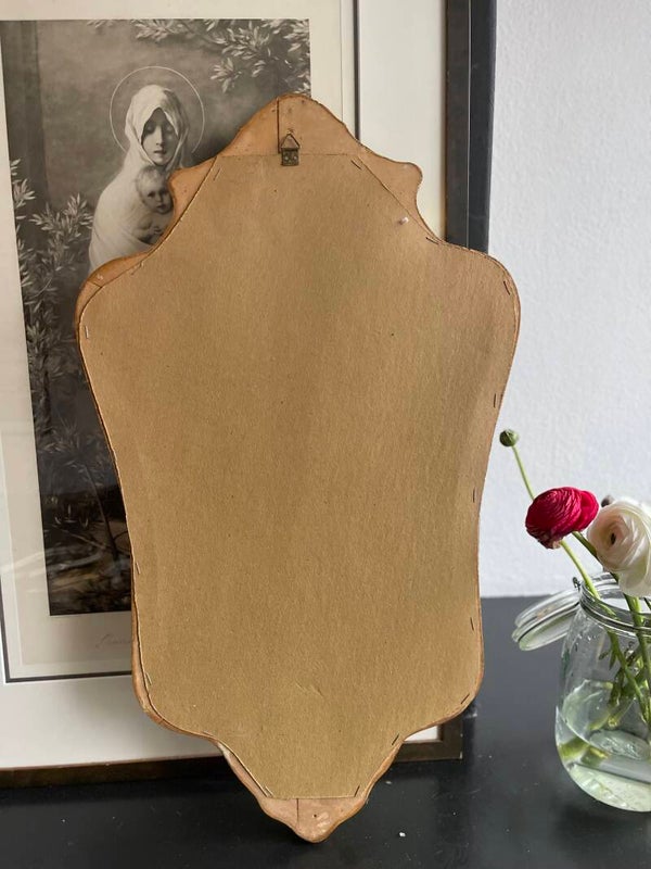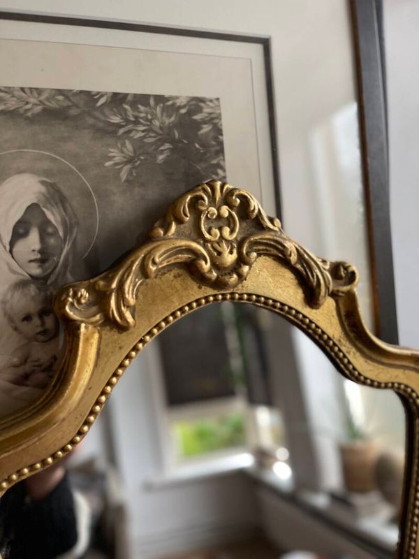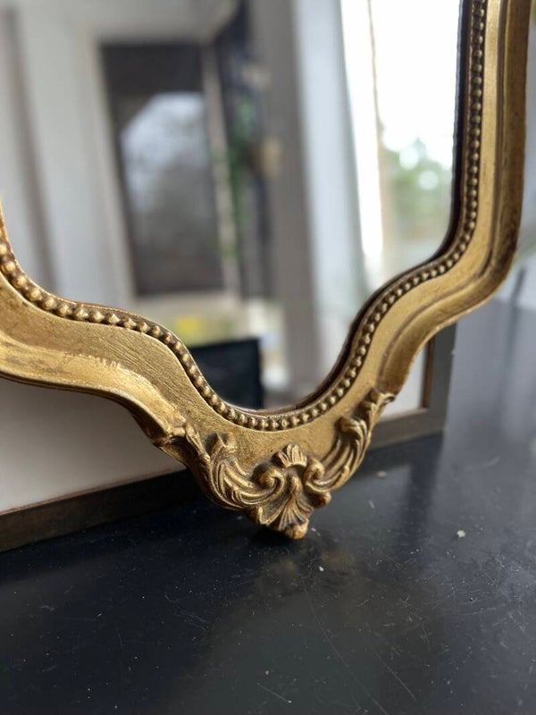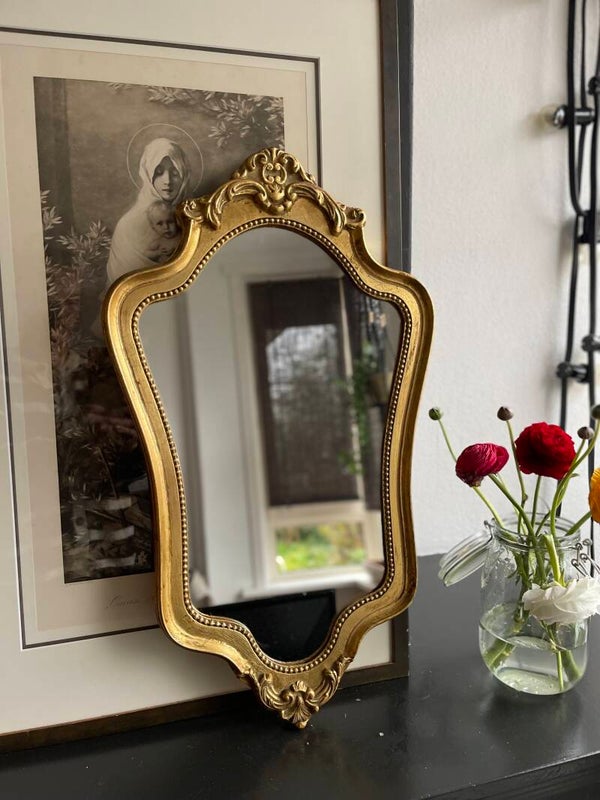 Klassieke goudkleurige spiegel. Gemaakt van hout en met mooi versierde lijst. Weer een pareltje van de bovenste plank!