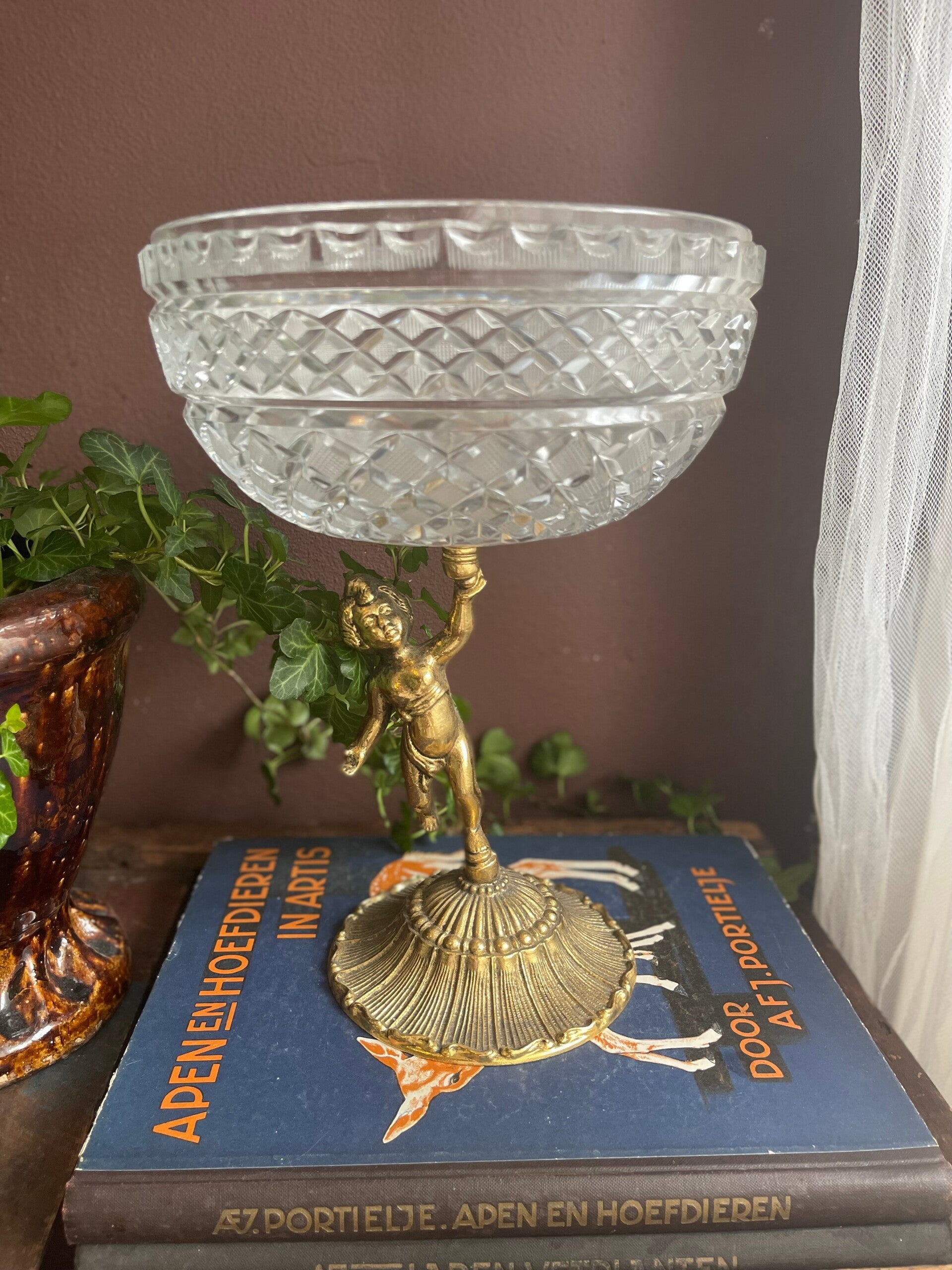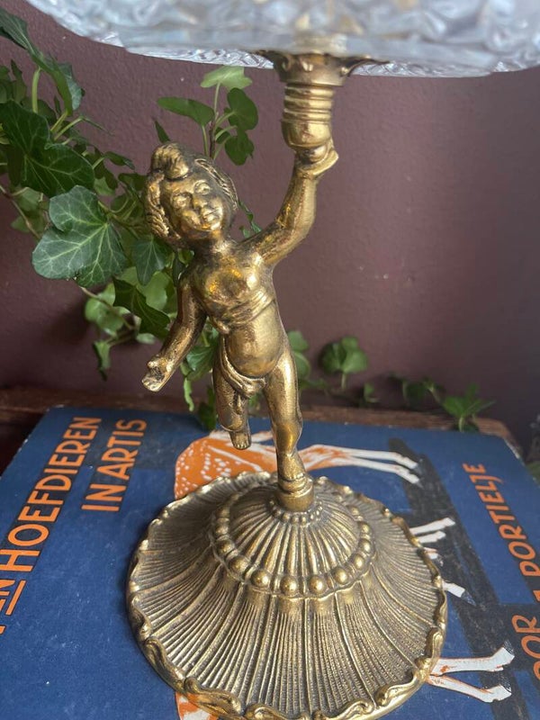 Wauw! Kristallen schaal op hoge voet. En wat voor voet... De schaal wordt vastgehouden door een engeltje. Wat een mooi item voor op tafel! Het is een zware schaal is bewerkt in patroon en in de schaal een echtheid sticker.