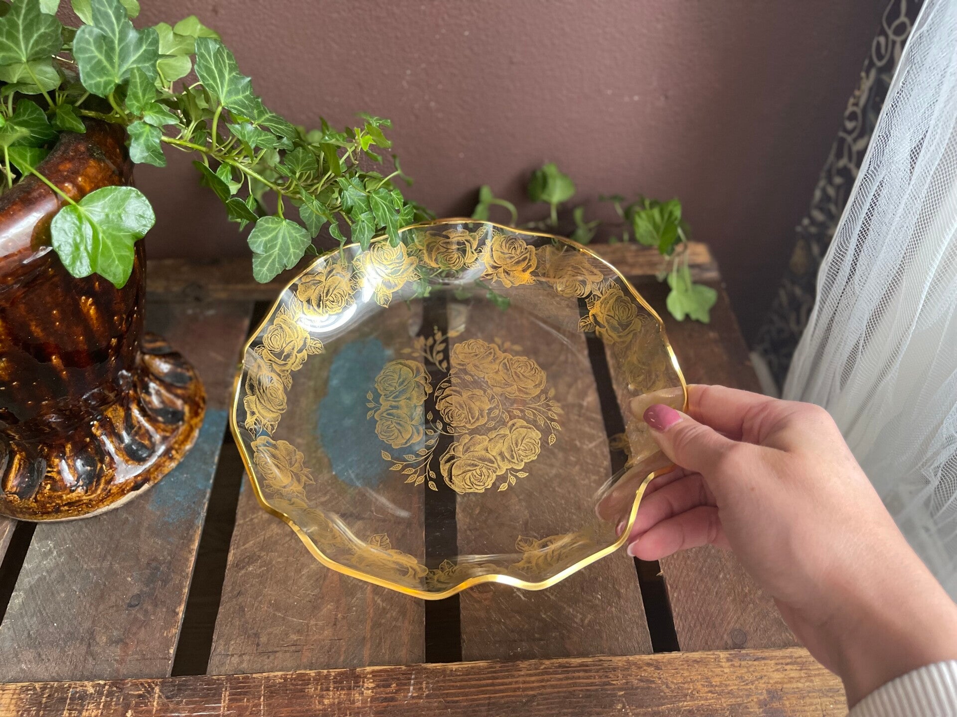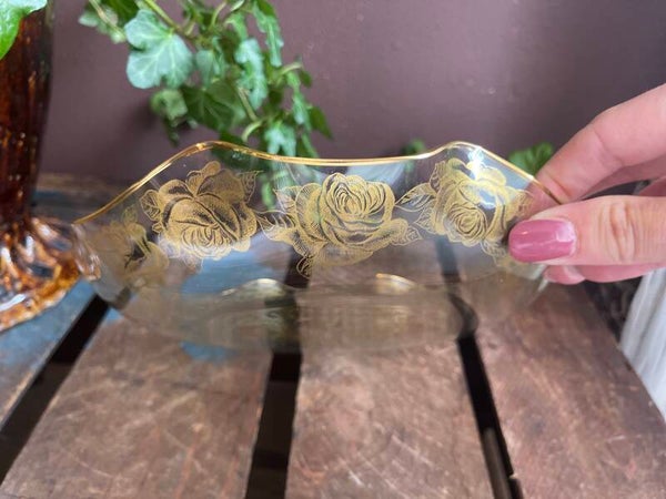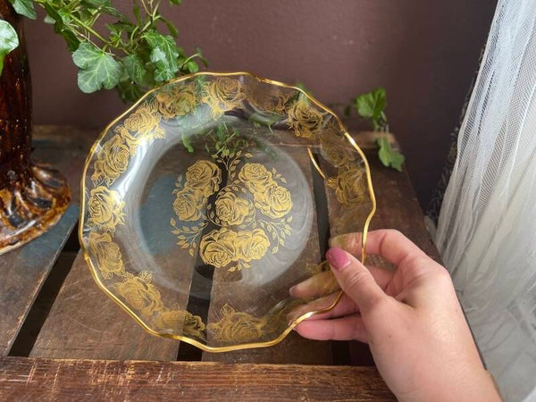 In klassieke stijl glazen serveerschaal met goudkleurige rozen er op verwerkt. Inclusief prachtig golvende rand! Hoe mooi.