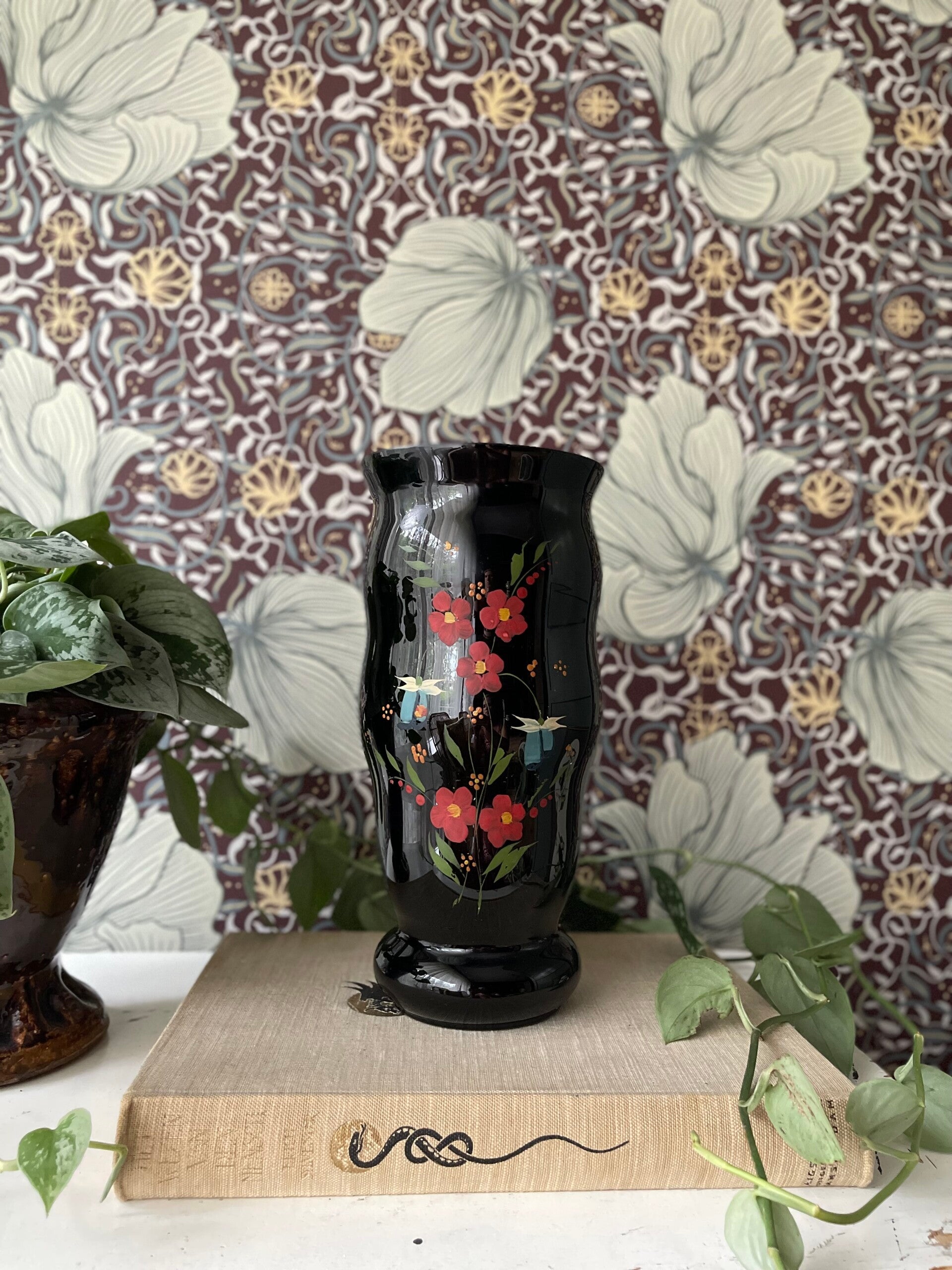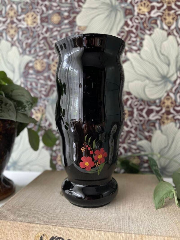 Prachtige zwarte glazen vaas met schildering van bloemen. De vaas heeft mooie sierlijke vormen, bos bloemen er in en klaar ben je! Pas op met water, het verf zou kunnen vervagen.