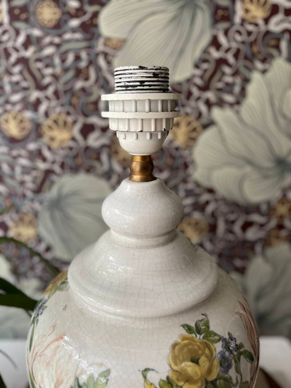 Mooie vintage lampvoet met craquelé basis beschilderd met bloemen. Hoe je ook kijkt, vanuit elke hoek een ander aanzicht. Met een kleur kap kun je door de verschillende kleuren ook alle kanten op. Zelfs een geprinte variant zal niet misstaan!