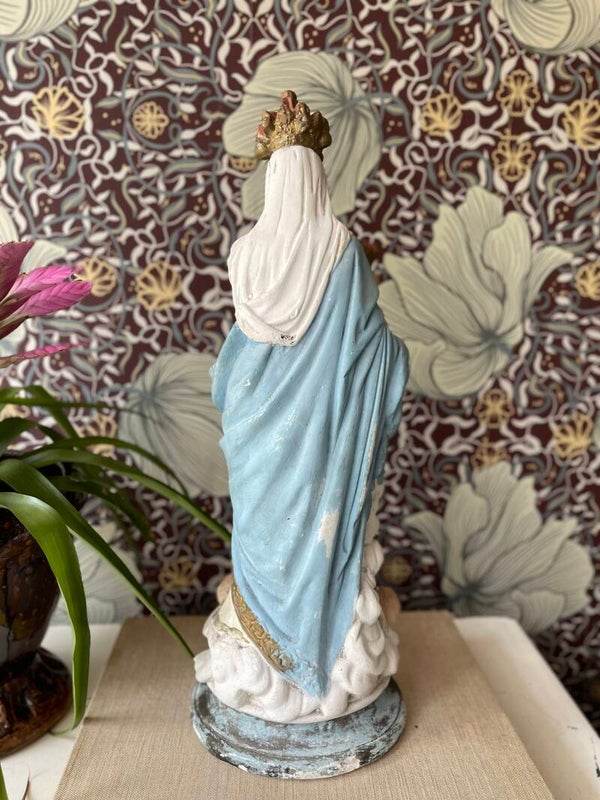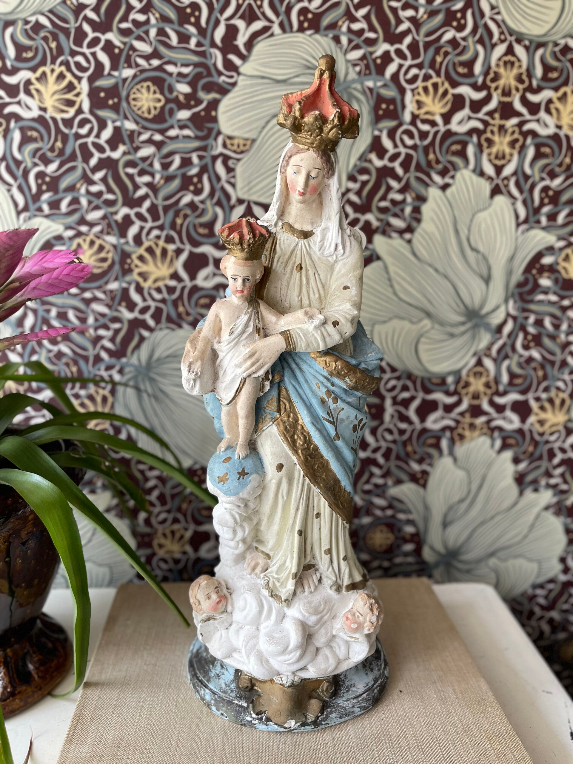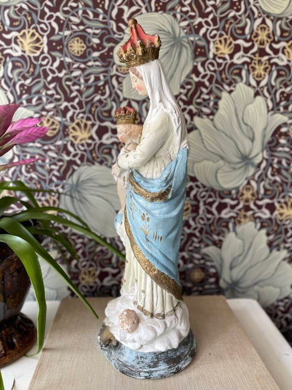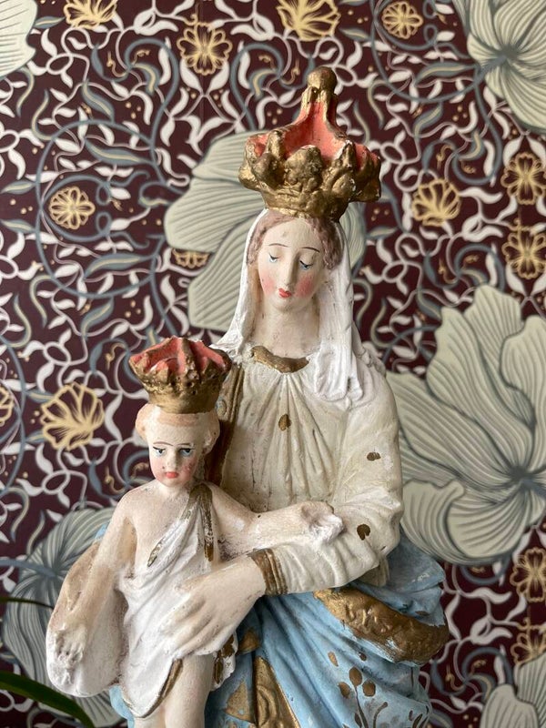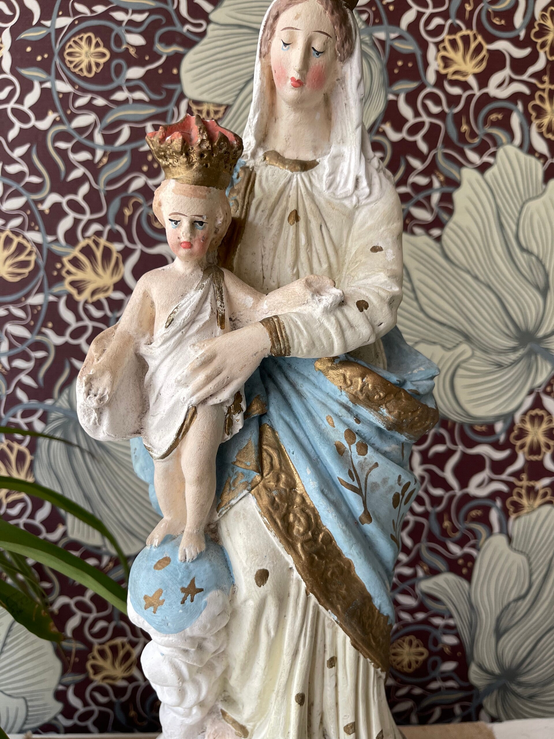 Hoe mooi is dit gipsen beeld van Maria met kind. Ja, ze is niet in perfect staat. Maar dat is te verwachten met een vintage beeld. In dit geval máákt het juist het beeld. Wij zijn in love!