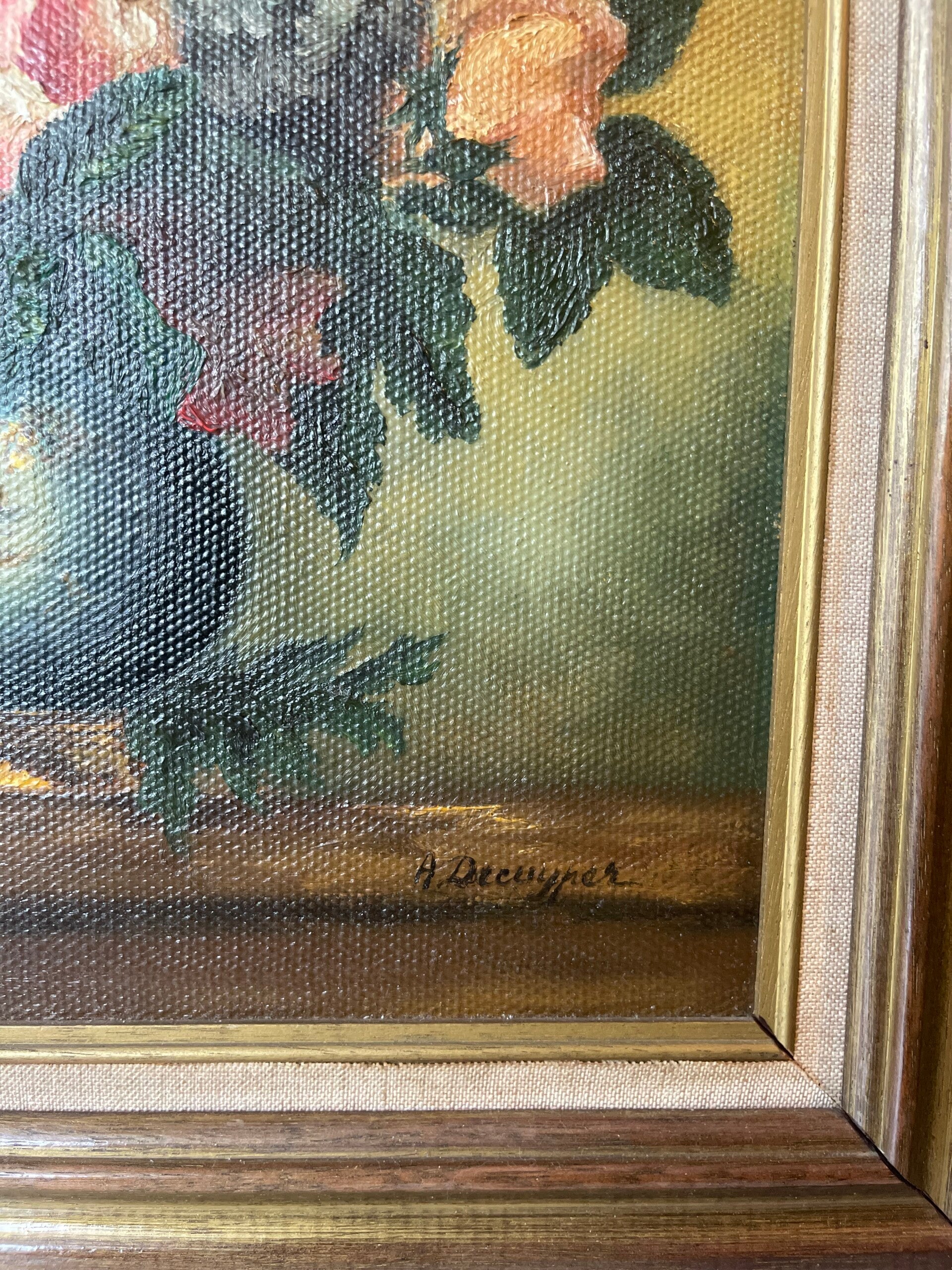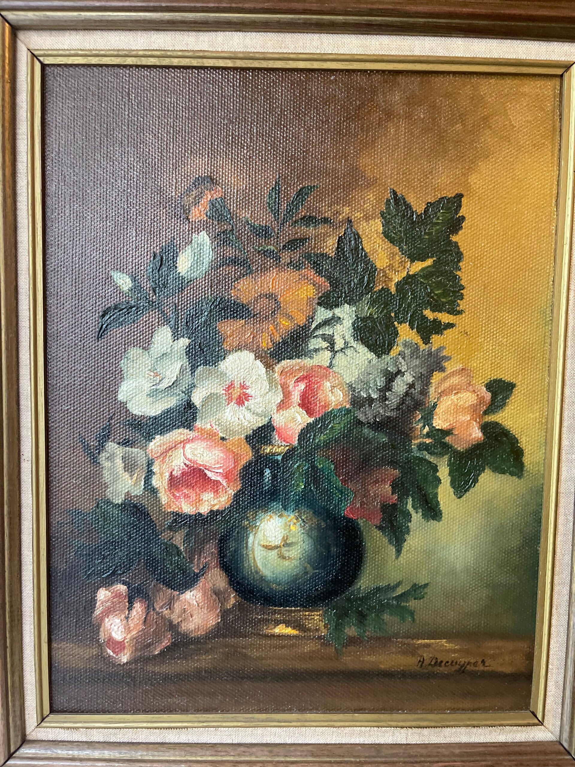 Olieverfschilderij van rozen, geschilderd op doek. Gezet in mooie bijpassende lijst. Een plaatje als geheel! De rozen staan in een vaas en de ton-sur-ton kleuren matchen heel mooi samen.