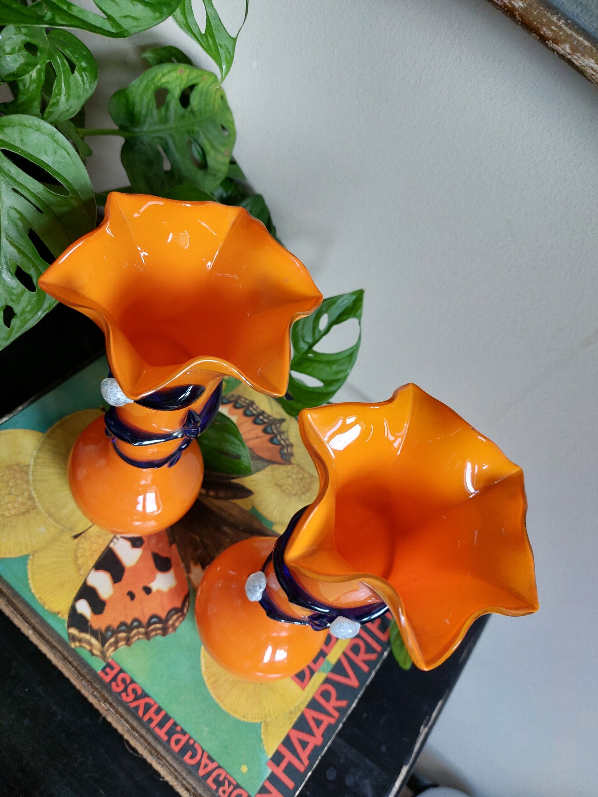 Pareltjes van de avond zijn deze 2 Franse opaline vazen. Echte oudjes en in uitmuntende conditie. Handgeblazen met verassende details in de vorm van ern tak met kleine witte bloemetjes. One of a kind😍.