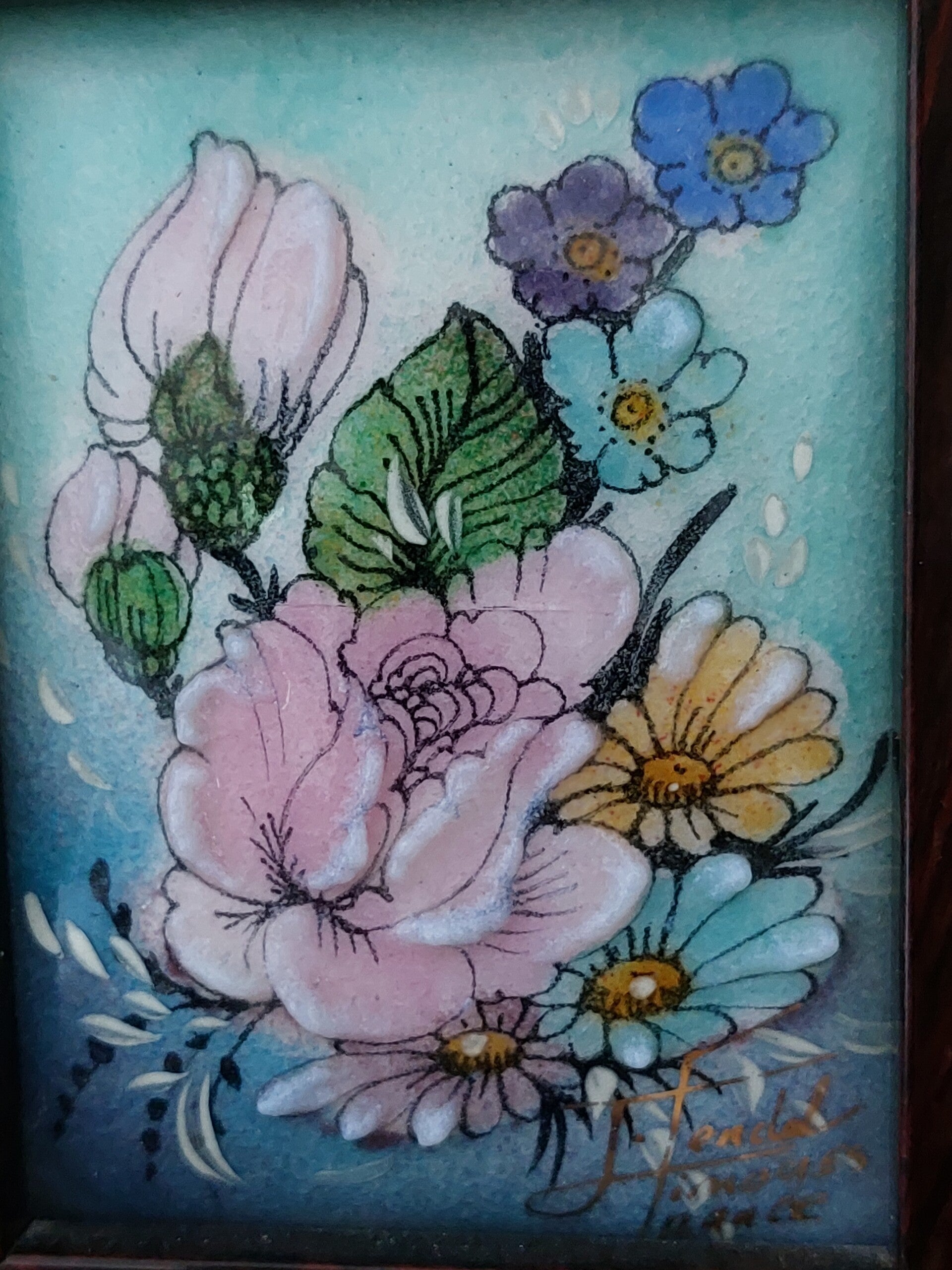 Wat een pareltje is dit emaille schilderijtje van Limoges. Gemaakt door F. Fendal rond 1930. Emaux d'art. Een fleurig geheel van roze bloemetjes.