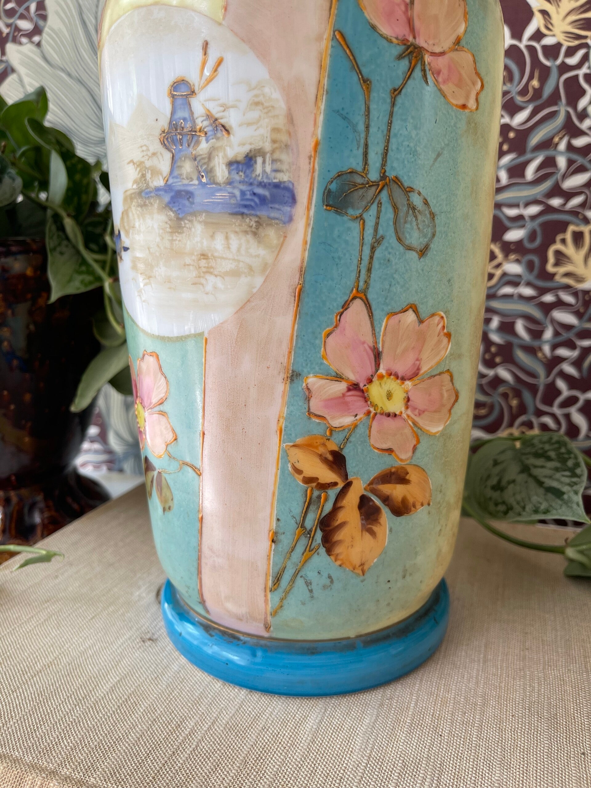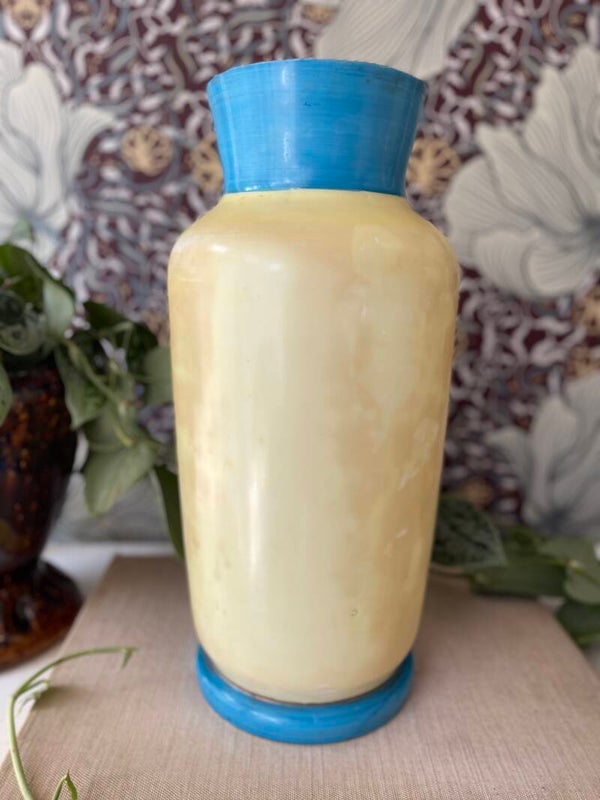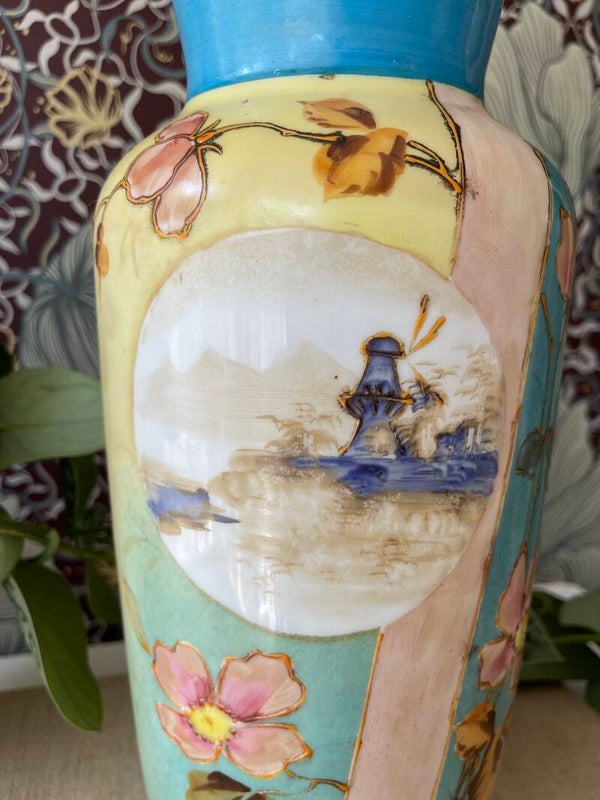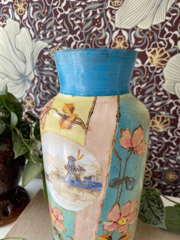 Wat blijft opaline toch een mooi product. Deze vaas heeft een prachtige Hollandse beschildering van bloemen en een molen. In mooi blauw met bijpassende kleuren. Handgeschilderd!
