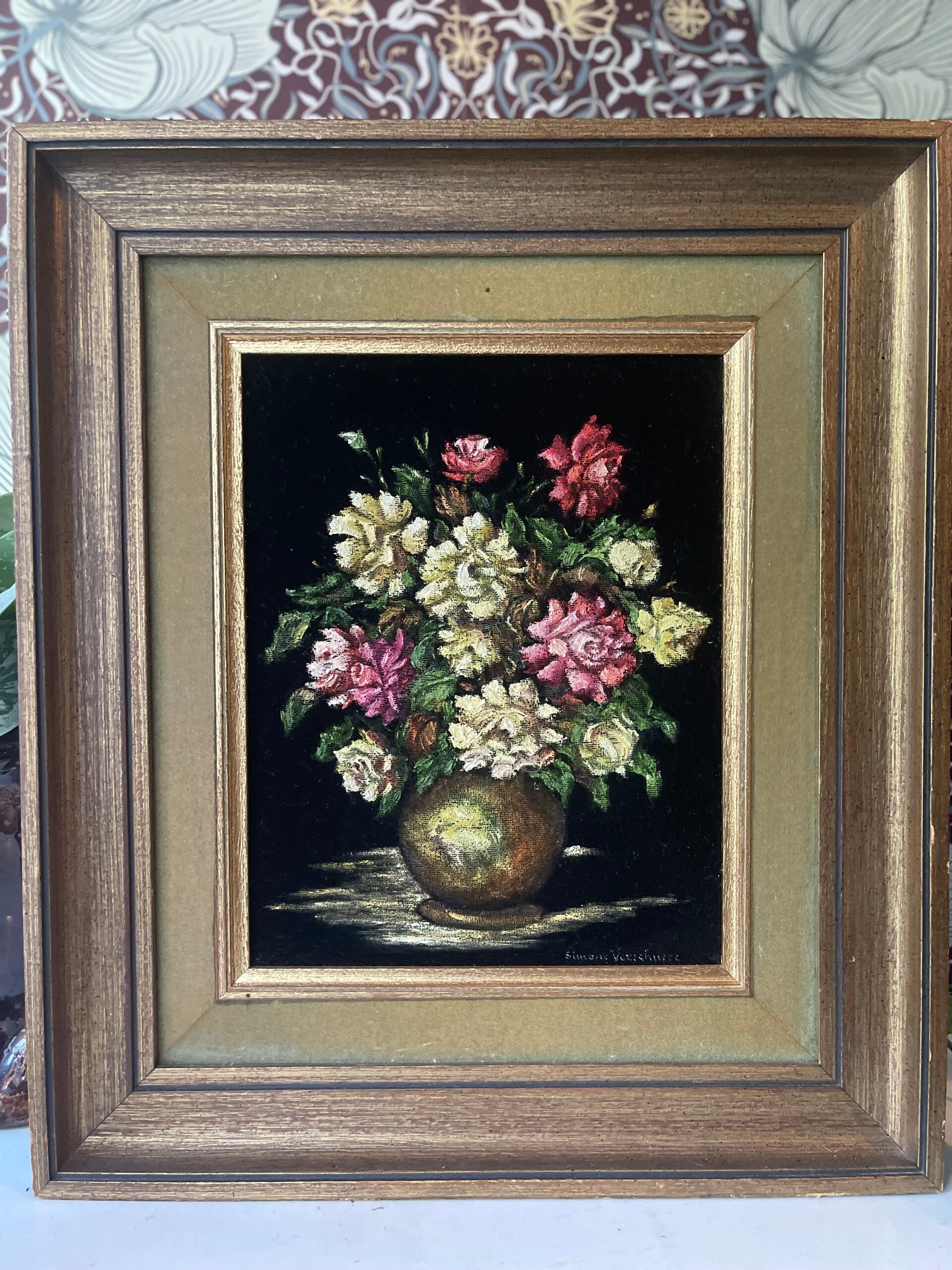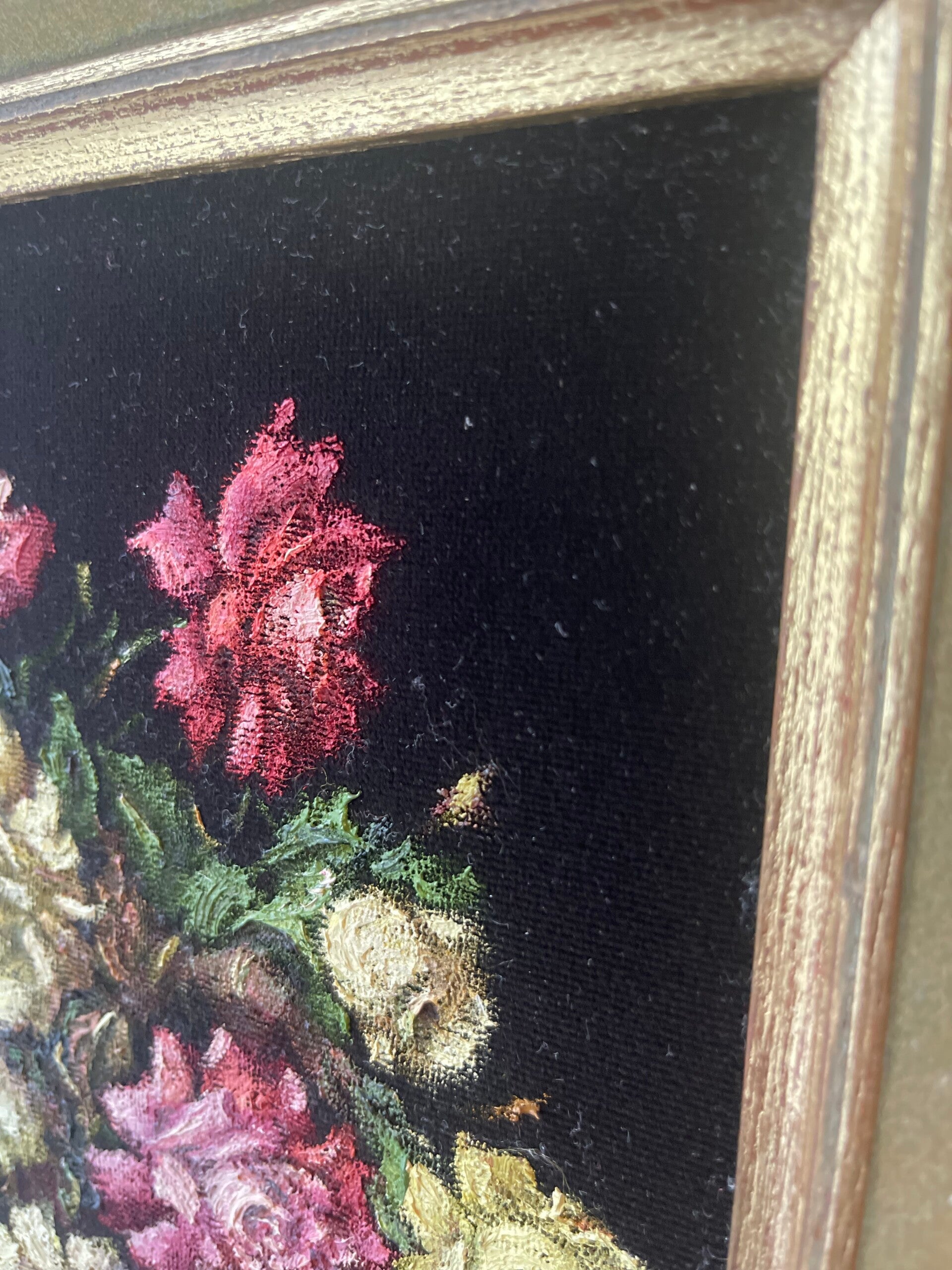 Dit schilderij is gemaakt op velours. Weer eens wat anders dan op doek. Door het zwarte velours steken de geschilderde bloemen er mooi vanaf. De gouden lijst maakt het geheel compleet!