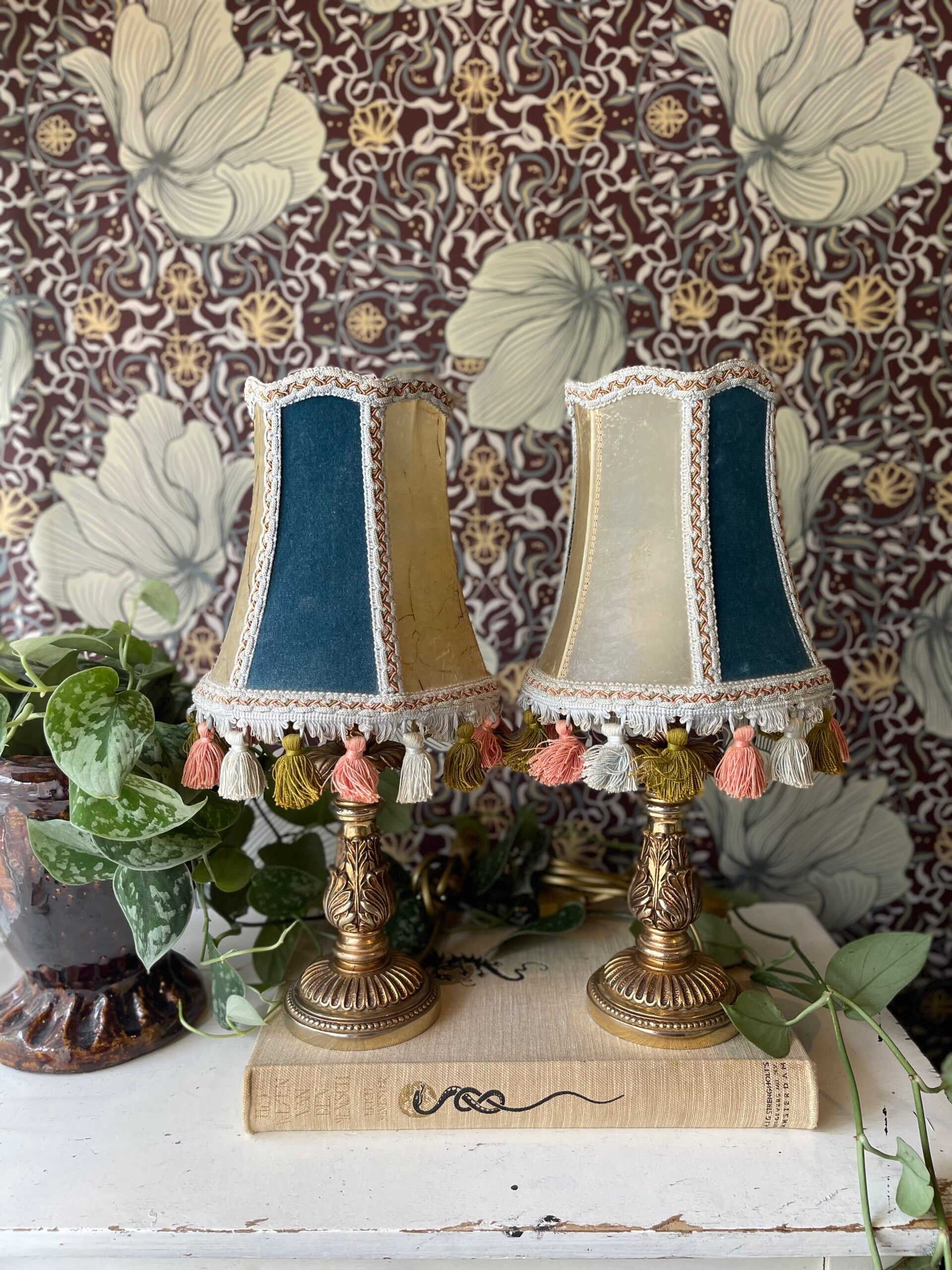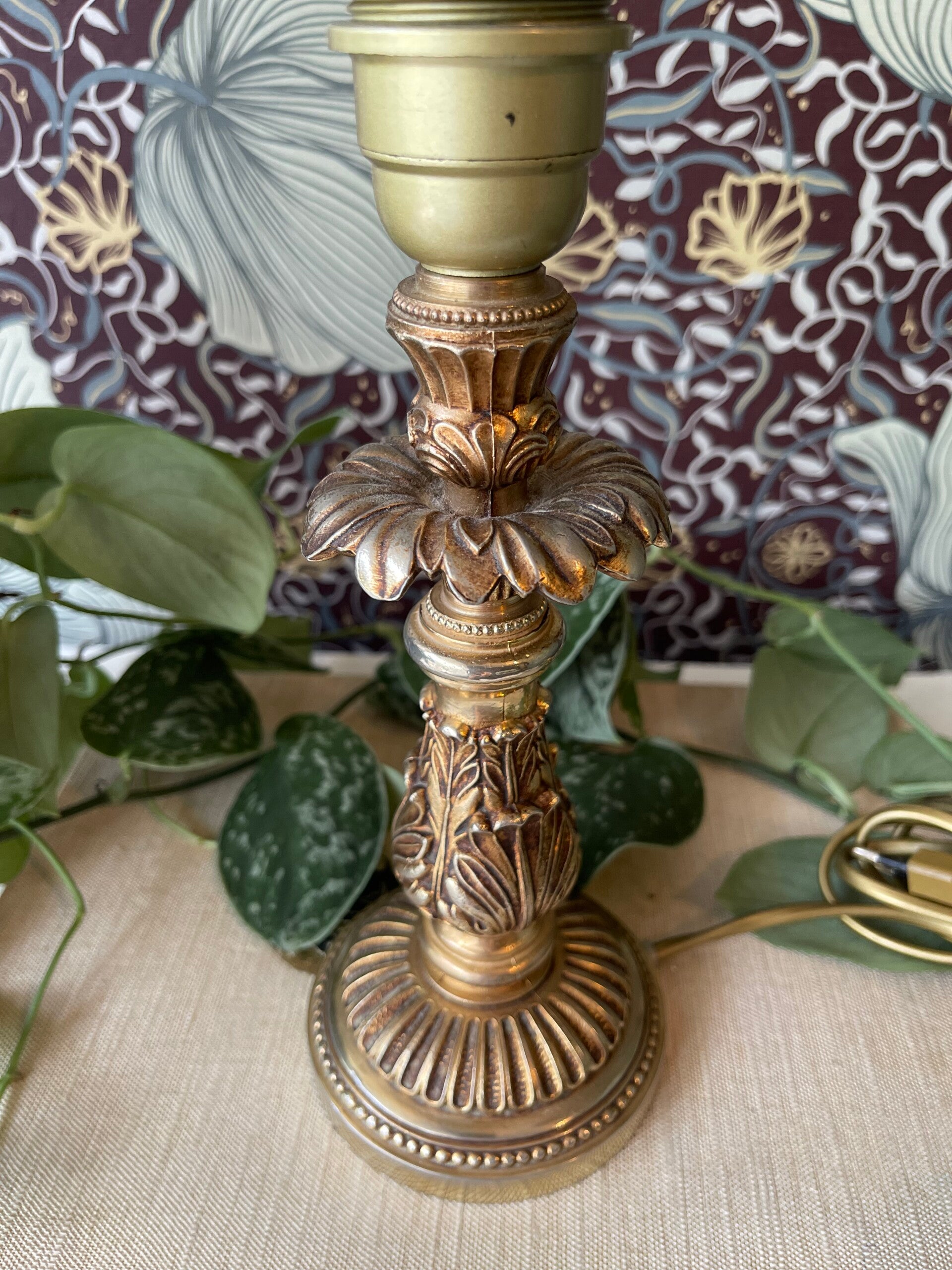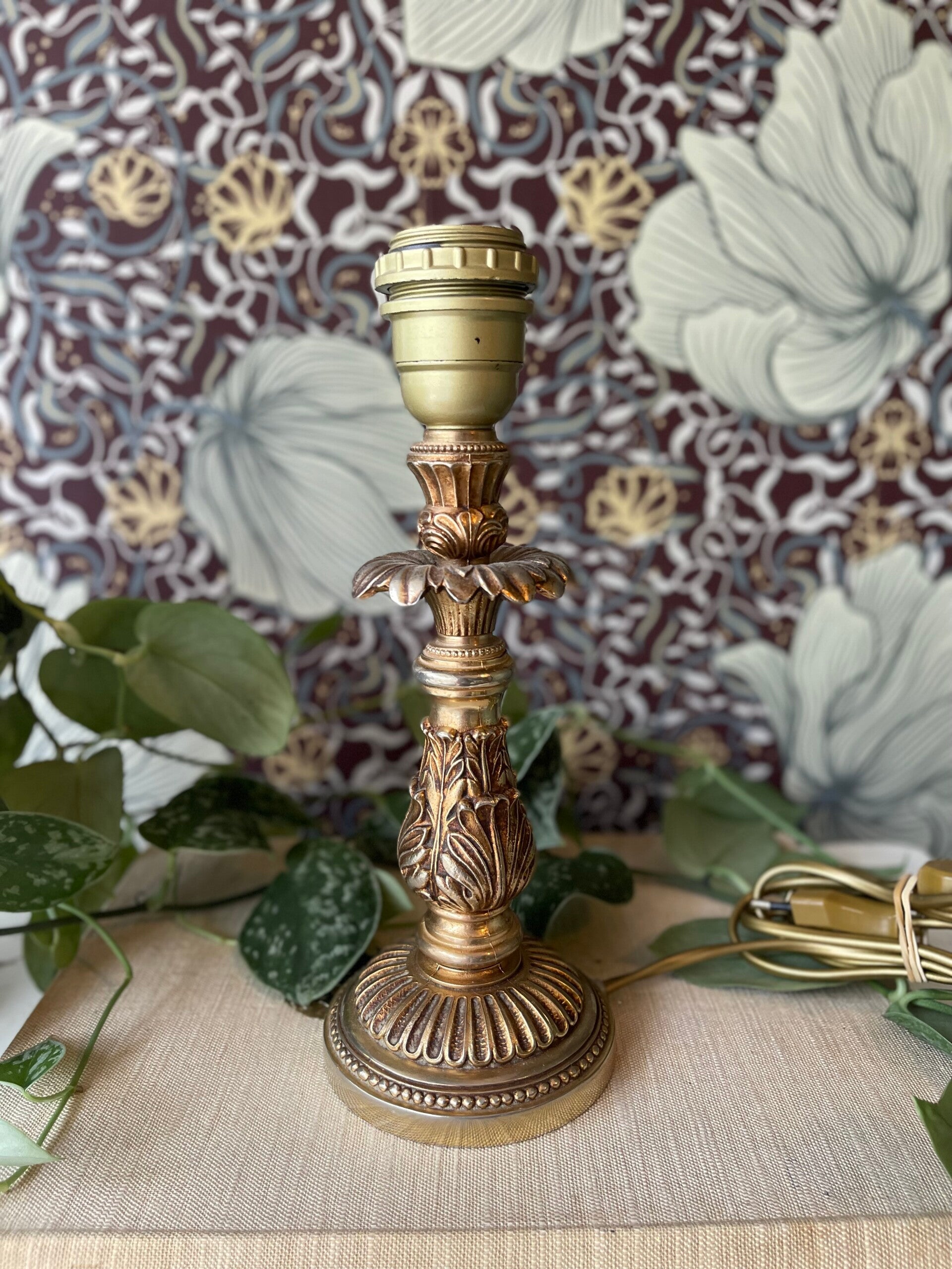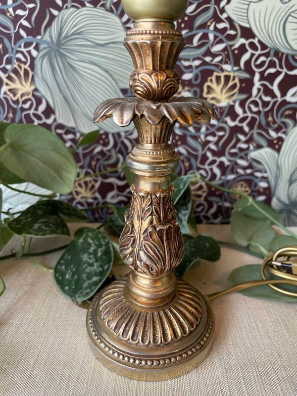 Goudkleurig lampvoetje in Art Nouveau stijl. Met bloemige randen en sierlijke vormen op de poot. Inclusief kap in blauw met beige en franjes. We hebben er 2, maar ook los te bestellen.