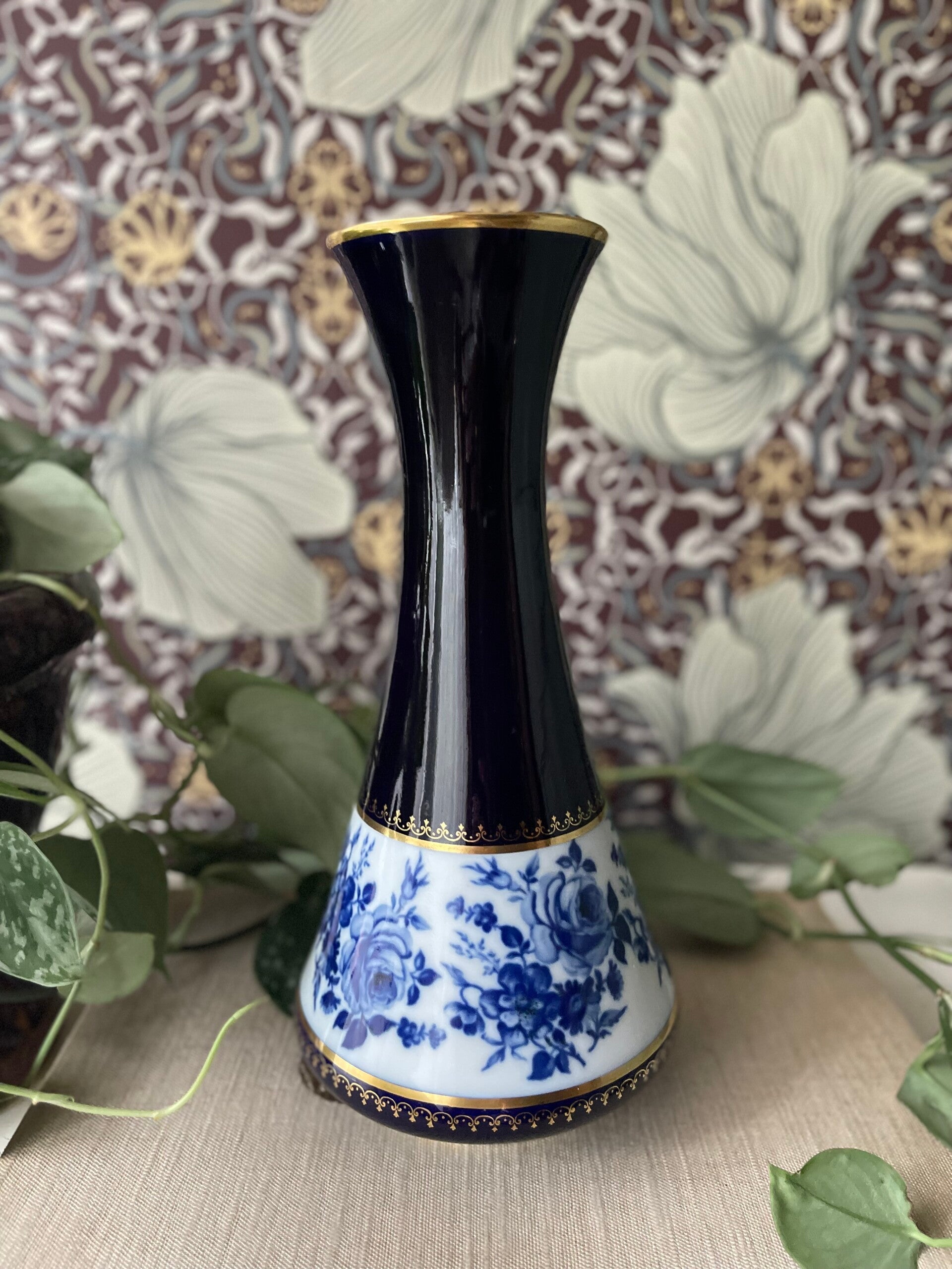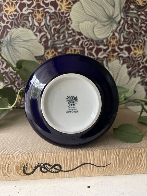 Mooie blauwe vaas in langwerpige vorm van Royal Porzelain Bavaria. Met onderop een band van blauwe bloemen en afgewerkt met goud. Mooi van eenvoud en geschikt voor een klein boeket of enkele bloemen. Onderop gesigneerd.