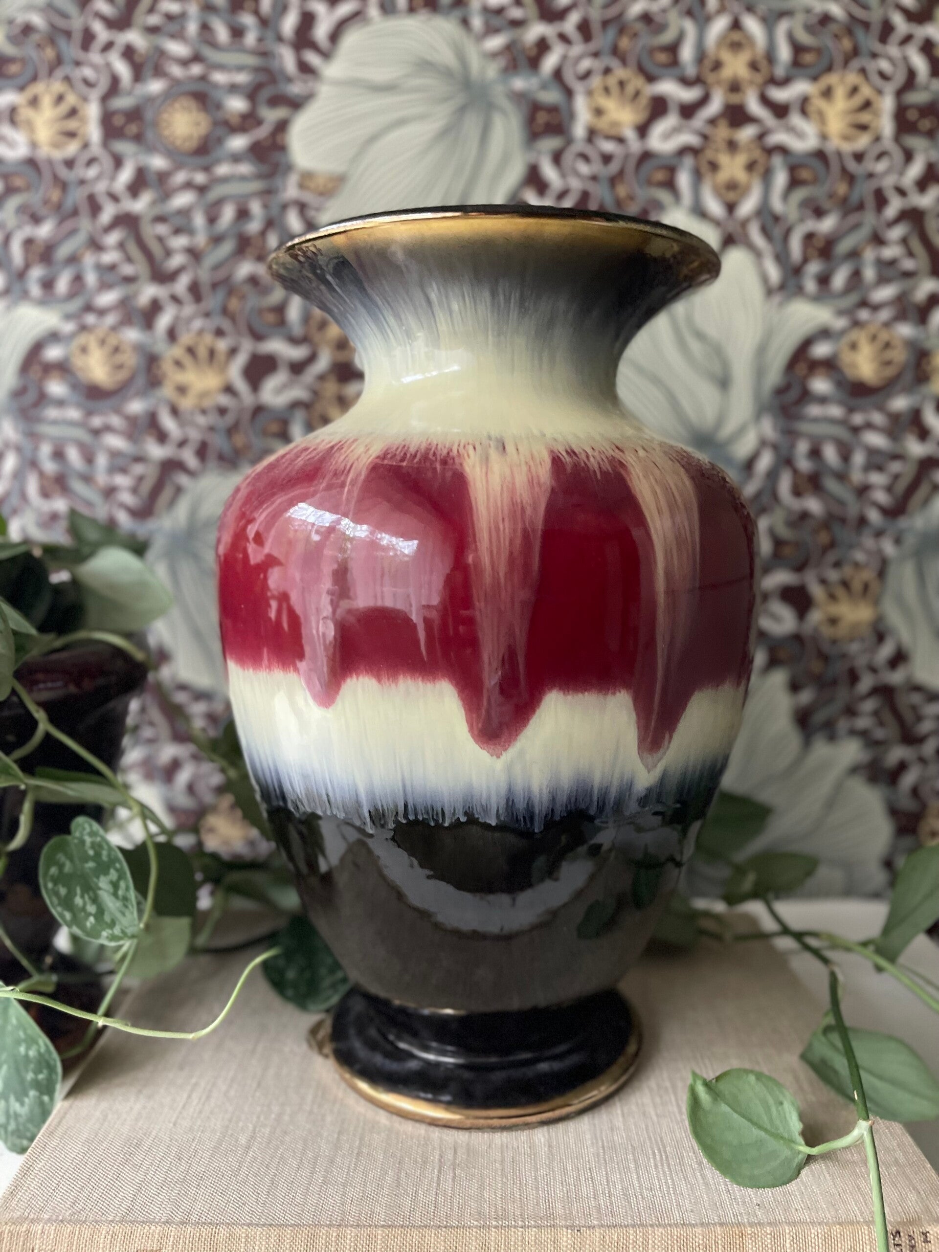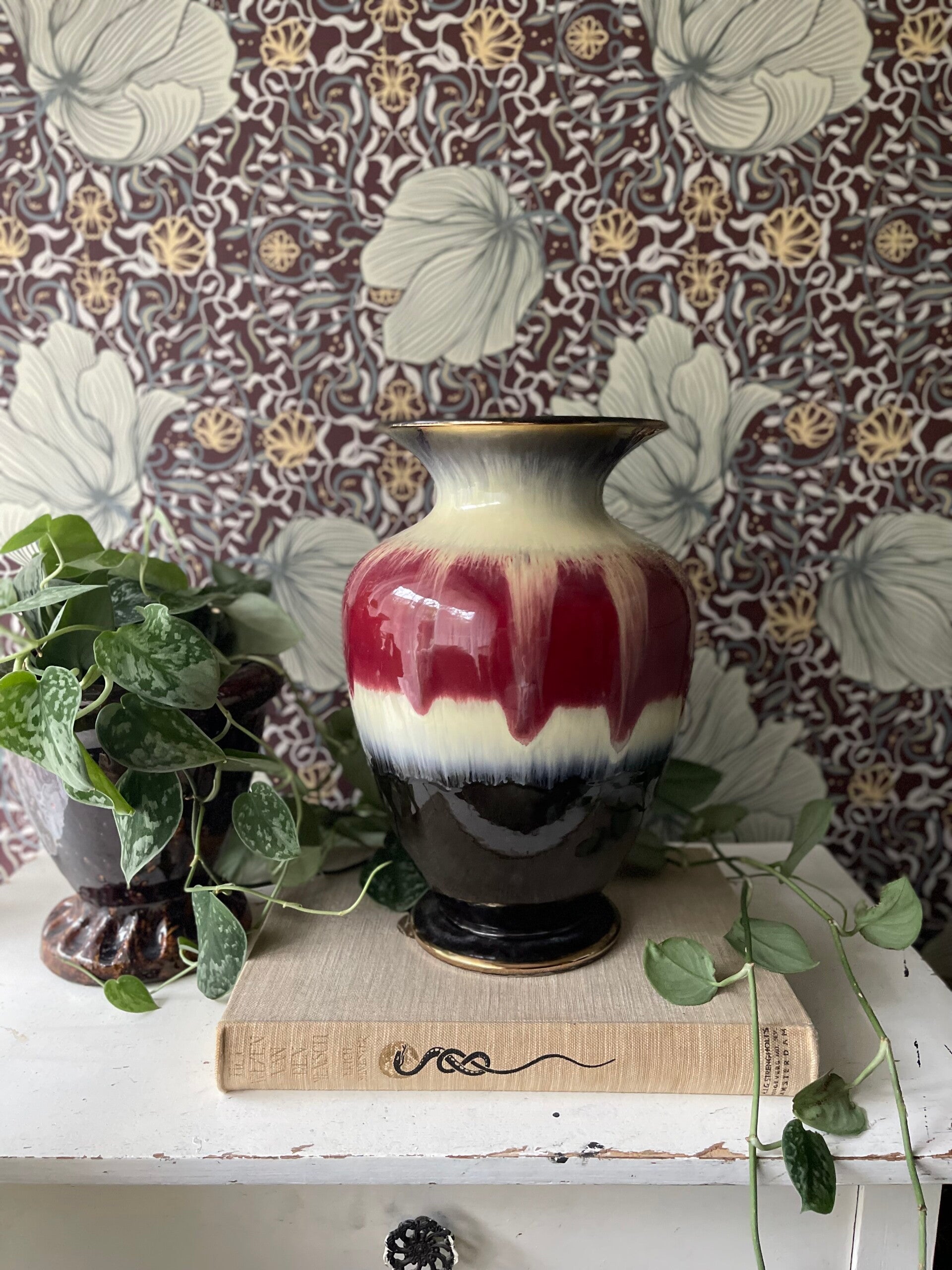 Grote West Germany look vaas. Wat een prachtige combinatie van ombré kleuren. Wij zijn er weg van! Met bloemen er in leuk, maar zo zonder doet ze ook niet onder. Onderop gesigneerd.