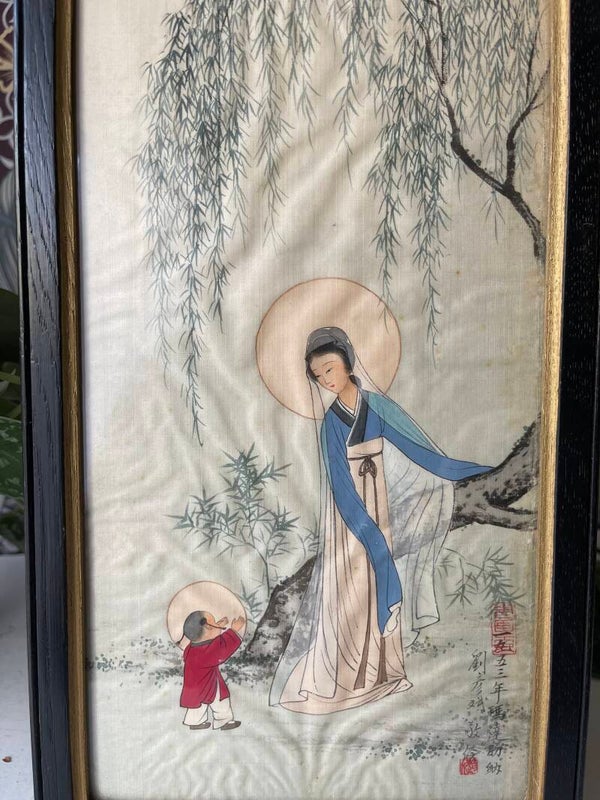 Prachtig kadertje met geisha geschilderd op zijde. Een sereen plaatje zo, door de kleuren en het tafereel. Altijd wel ergens plek voor deze!