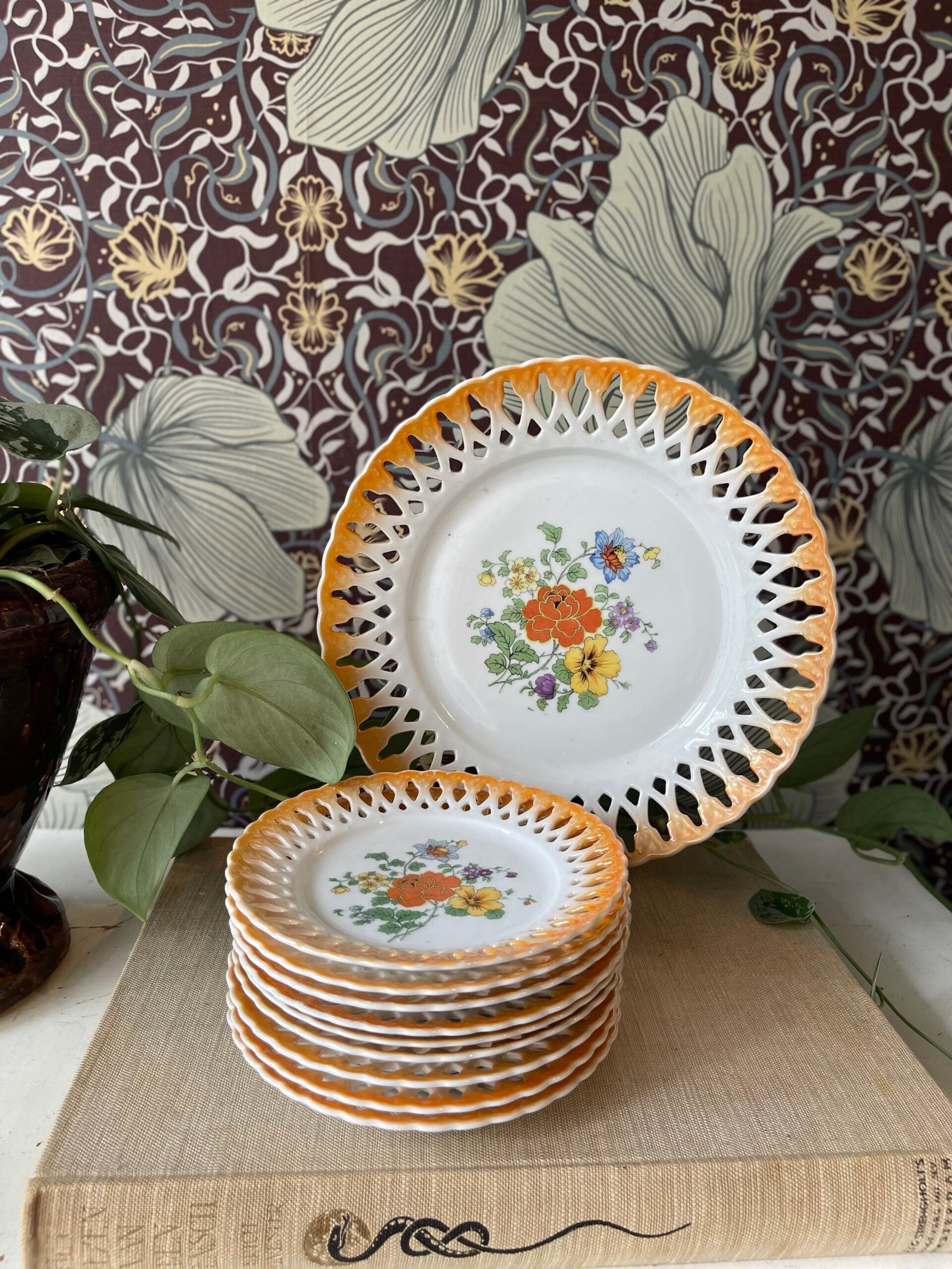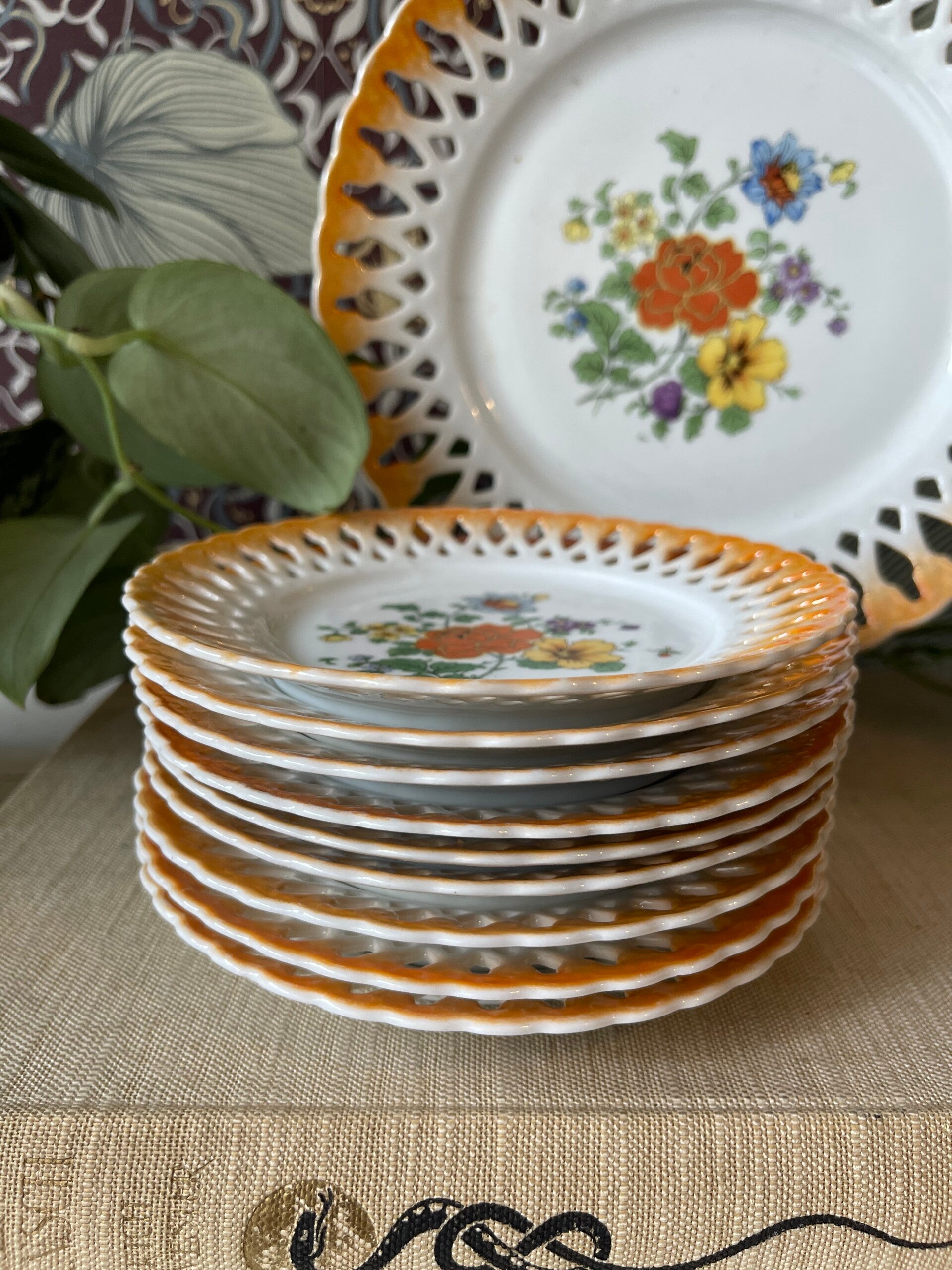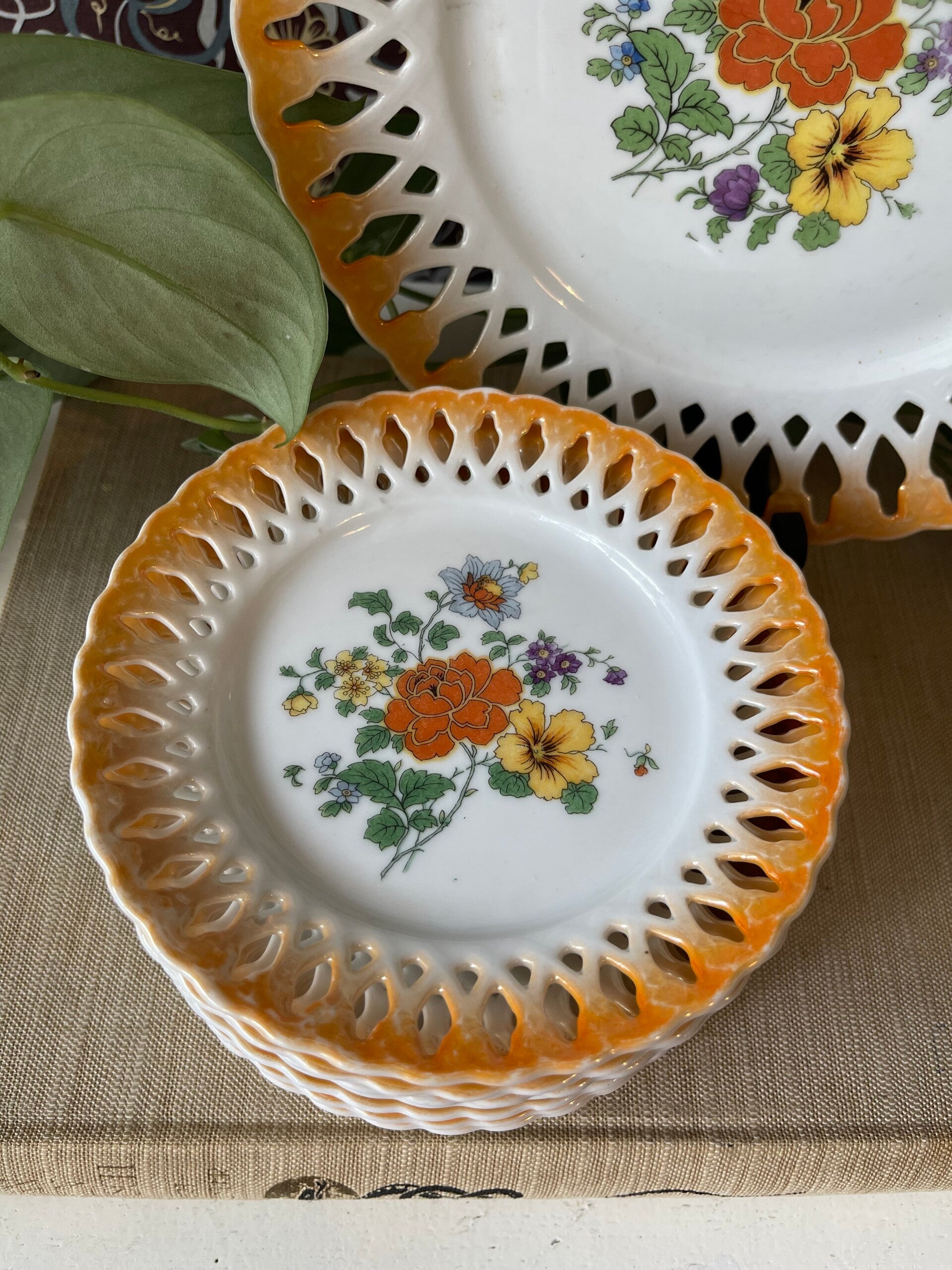Mooie gebaksset met opengewerkte rand. Zowel in het grote bord als de 9 kleine bordjes. Versierd met vintage bloemen en oranje. Leuke set!