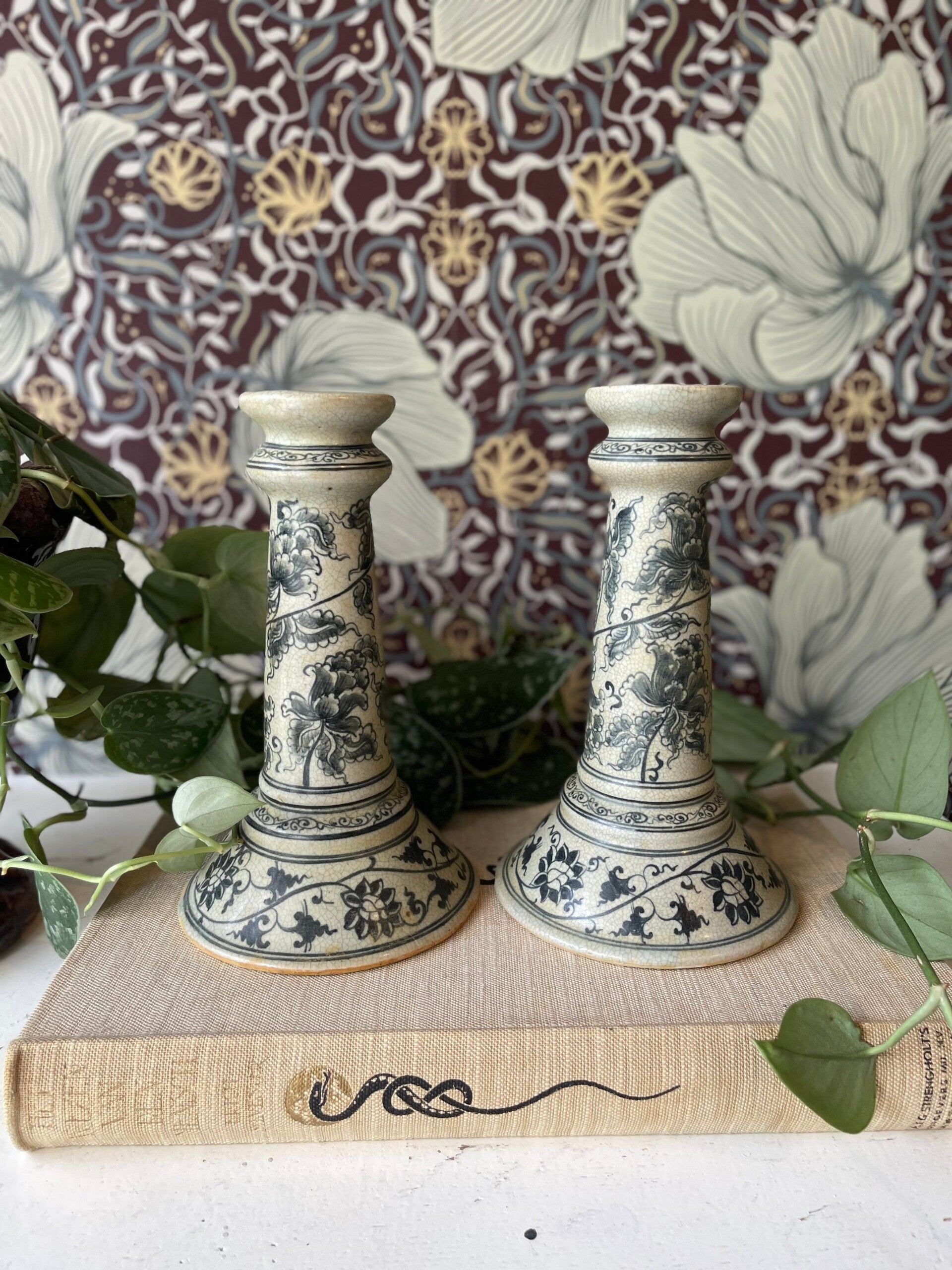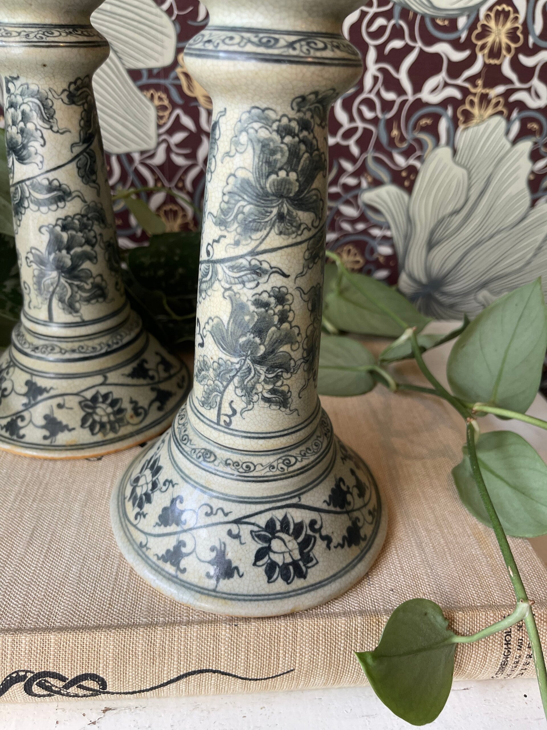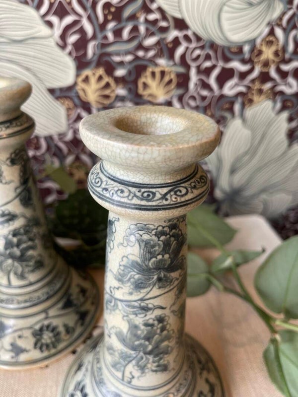 Wat een mooie vintage vondsten zijn dit. Prachtige Satsuma Stijl kandelaren. In grijsblauwe kleur versierd met bloemen. Het craquelé in de kandelaar maakt het sfeertje helemaal af. Mooi! Prijs is per stuk.