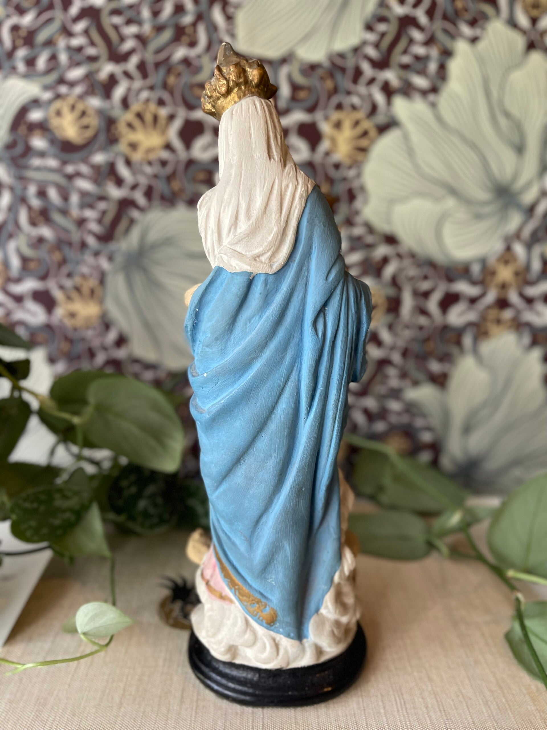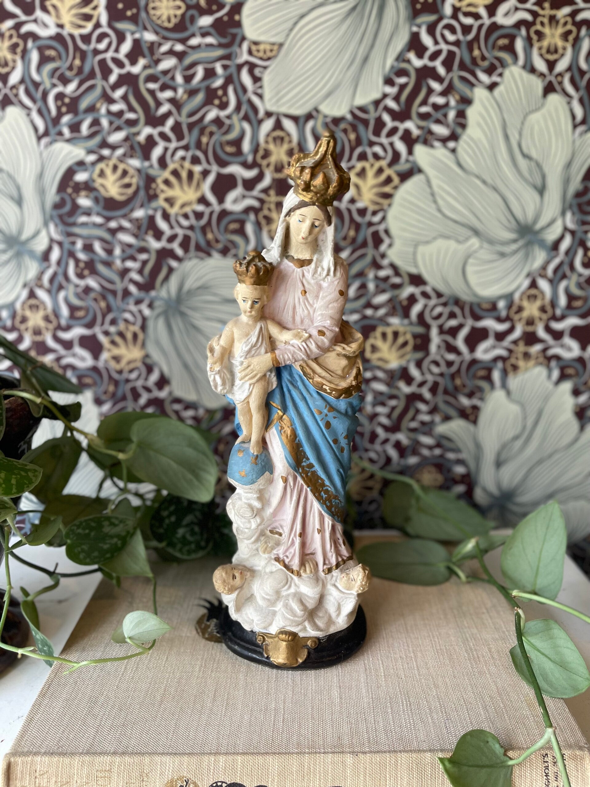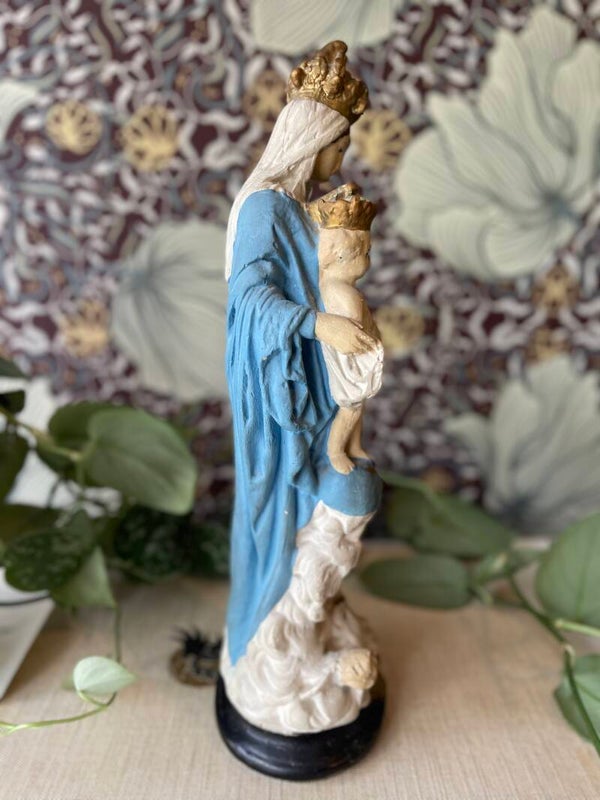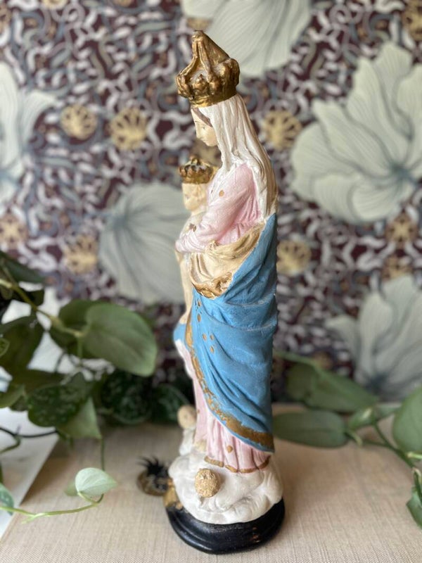 Prachtig gipsen beeld van Maria met kind. In mooie kleuren blauw en roze met een touch of gold om het geheel af te maken. Te mooi!