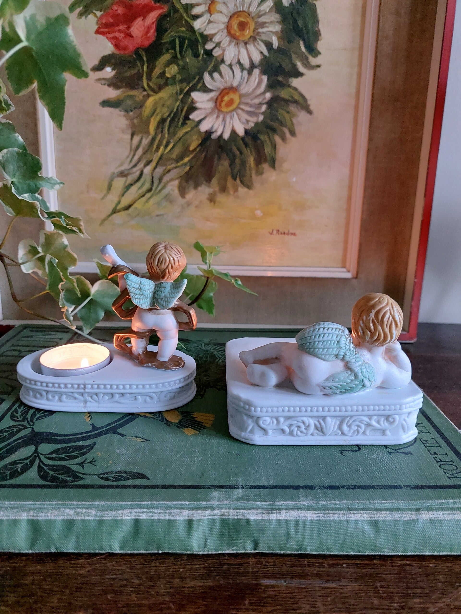 How cute zijn deze oude biscuit engeltjes. 1 op de gitaar en 1 liggend. Met hun schattige koppies en groene vleugels stelen ze de show op tafel. koppies. Prachtig bewerkt op de zijkanten.