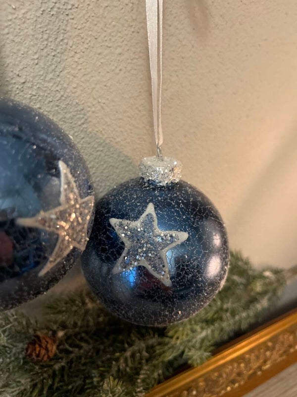 Set blauwe kerstballen met glitter sterren. De kerstballen zijn van glas. ♛ Set van 2 / 3 sets beschikbaar