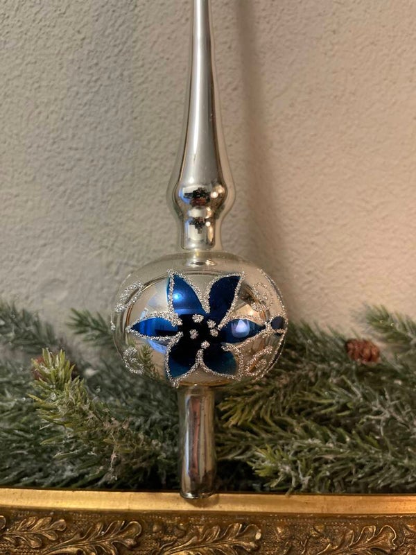 Piek met glitter bloem in het blauw. De piek is van glas.