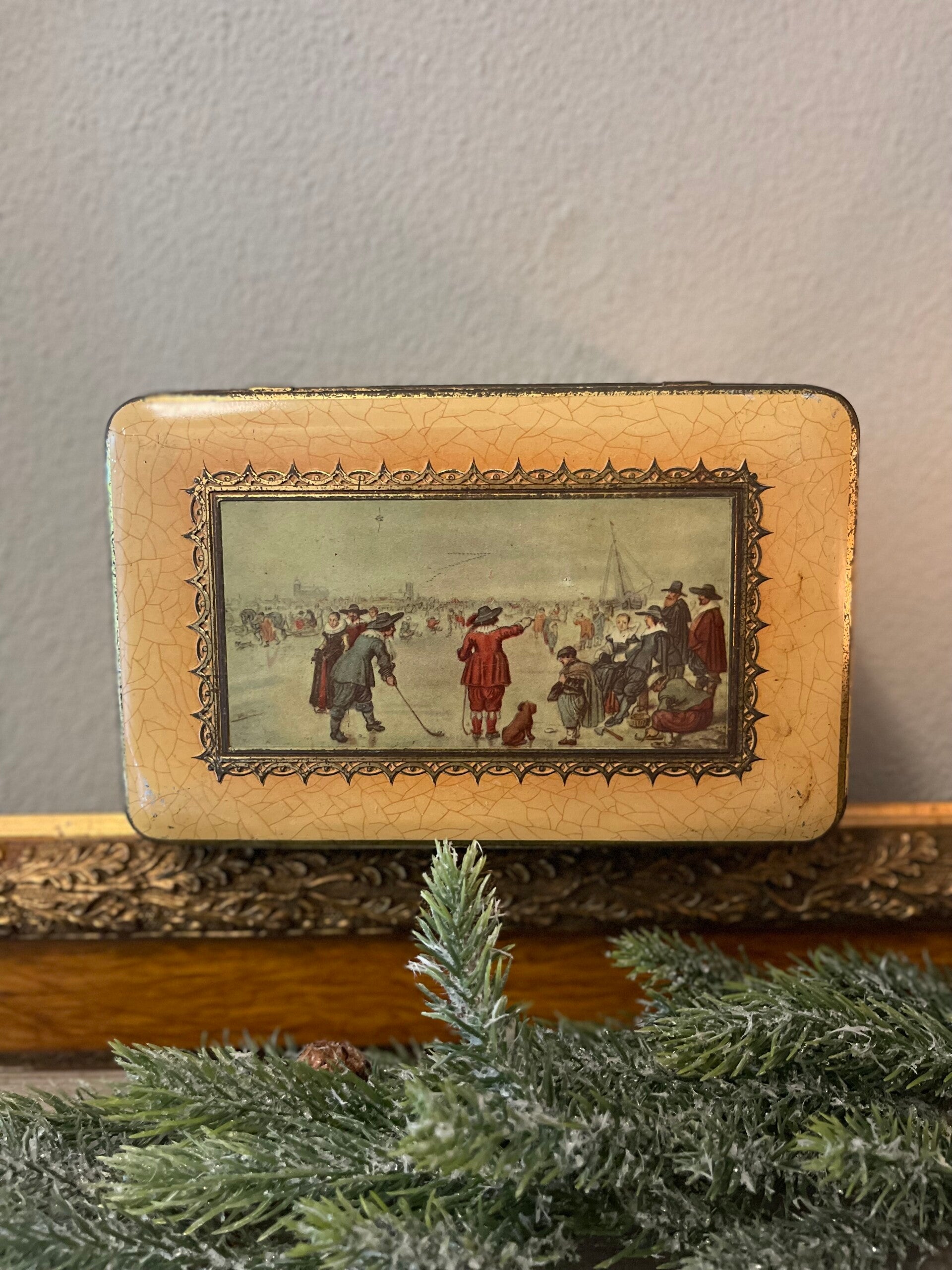 Blik met winters tafereel in kerst kleuren