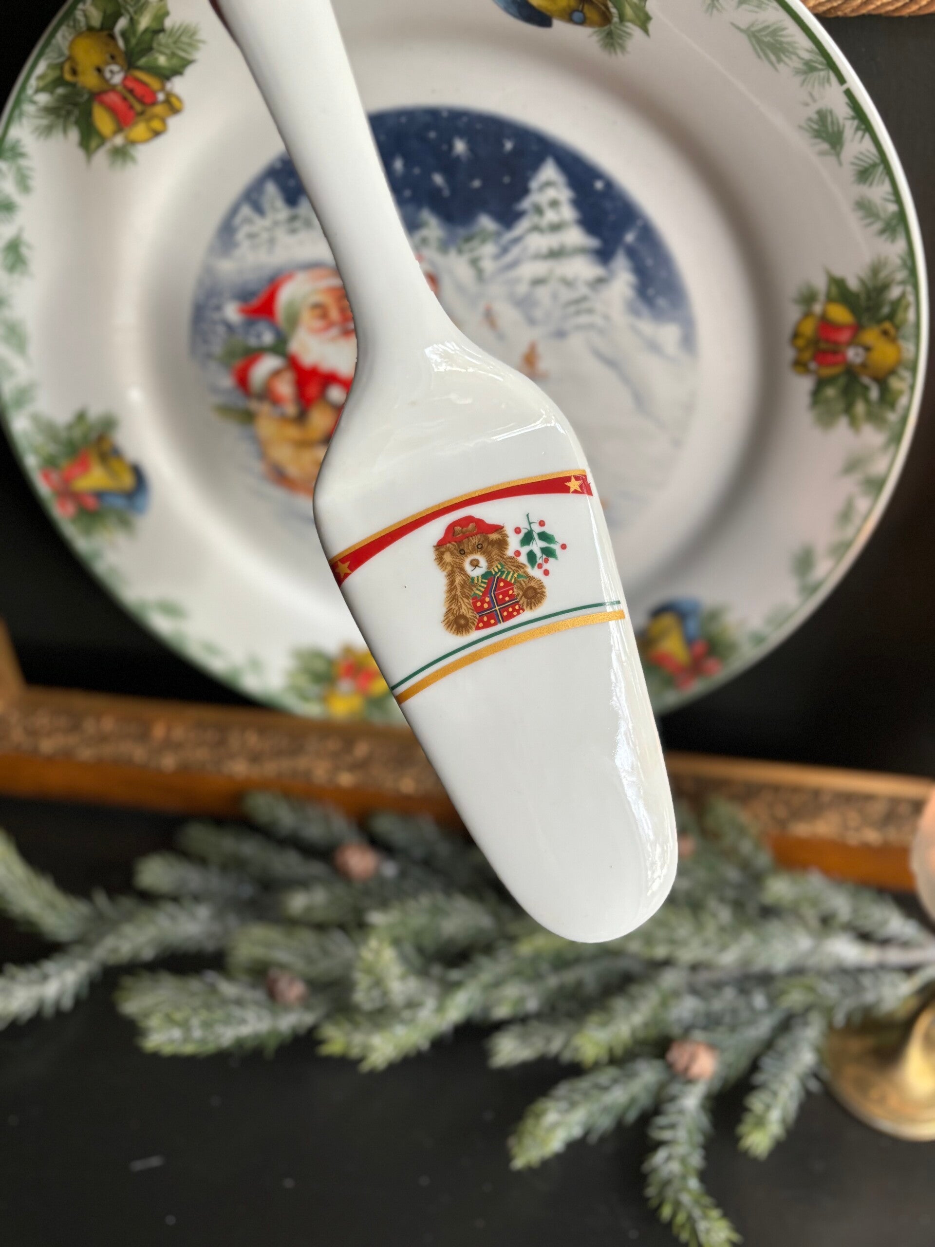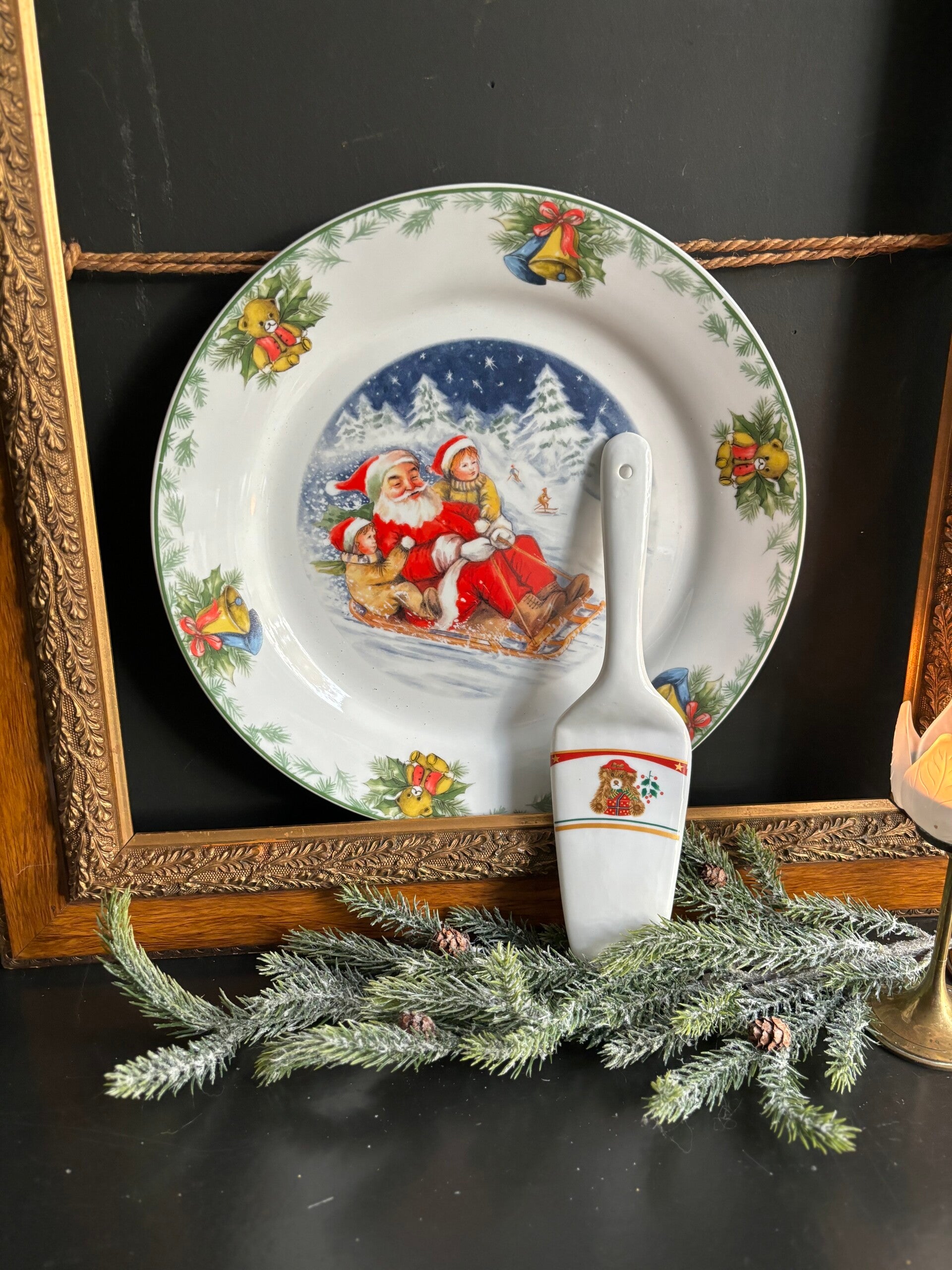 Mooie taartschaal met bijpassende taartschep van het Italiaanse Siaki porselein. De kerstman is in leuk tafereel met kindjes, beertjes en Hulst afgebeeld. In de originele doos.