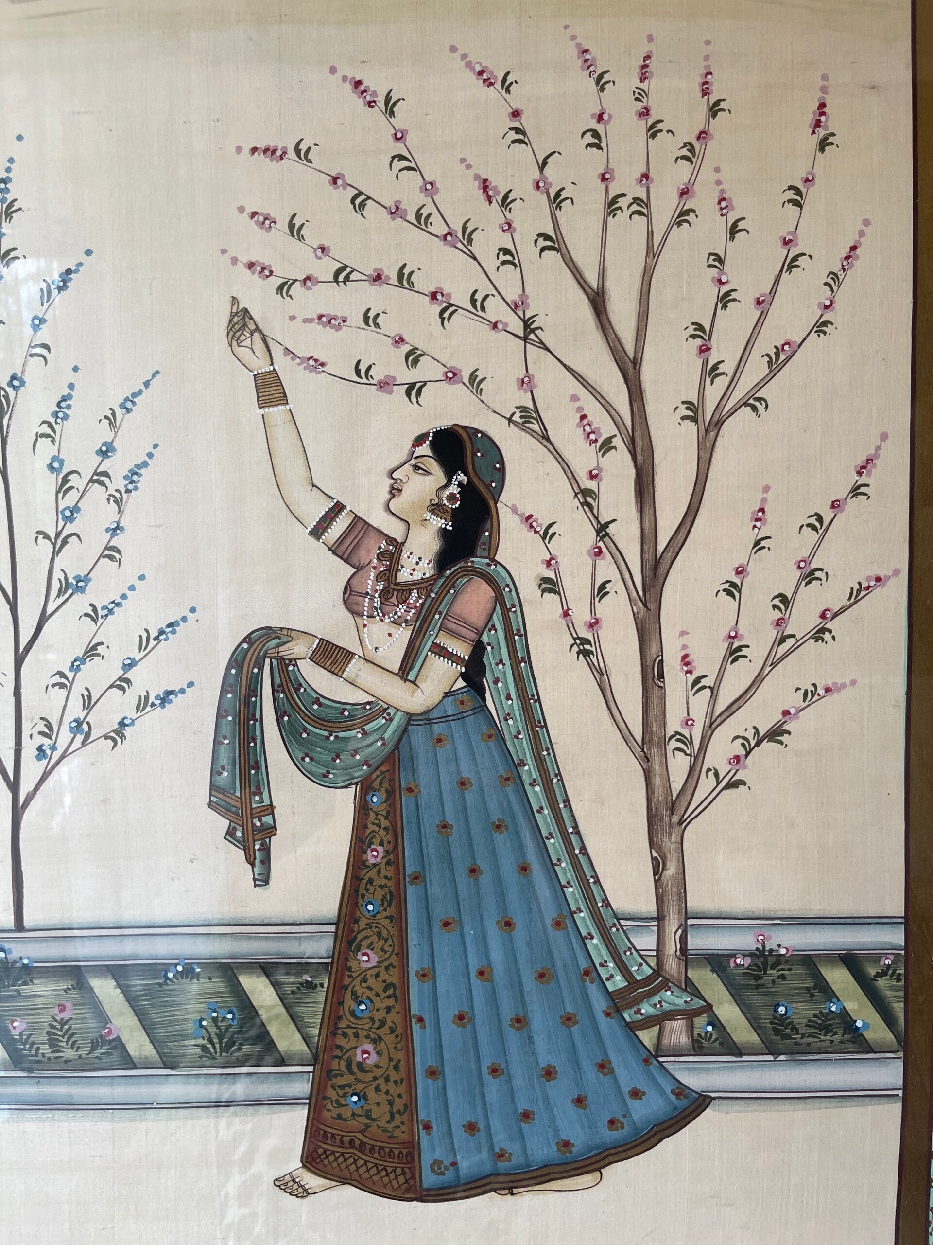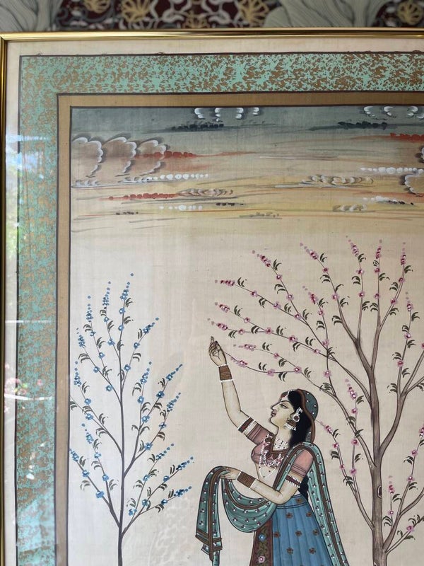 Wat een beauty van een doek is dit. Een Indiase vrouw, waarschijnlijk uit het harem van Tana Shah van Golconda, rond 1800. De zachte kleuren en mooi afgebeelde vrouw plukkend aan de bloesembomen maken het een doek waar je naar blijft kijken.