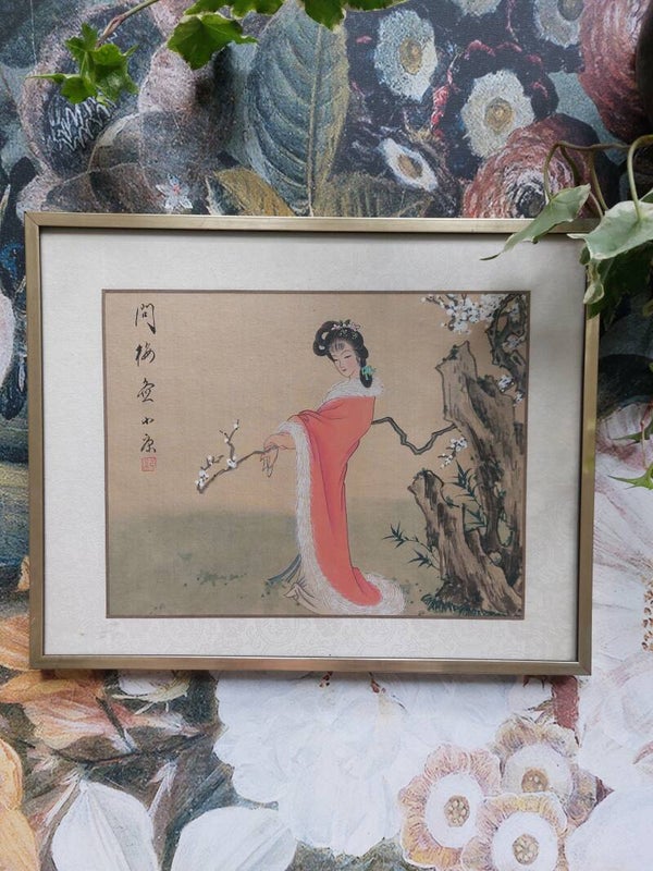 Twee prachtige Geisha tekeningen gezet in een gouden lijst. Met hun mooie rode gewaden bij de bloesemboom stelen ze de show. Gesigneerd.