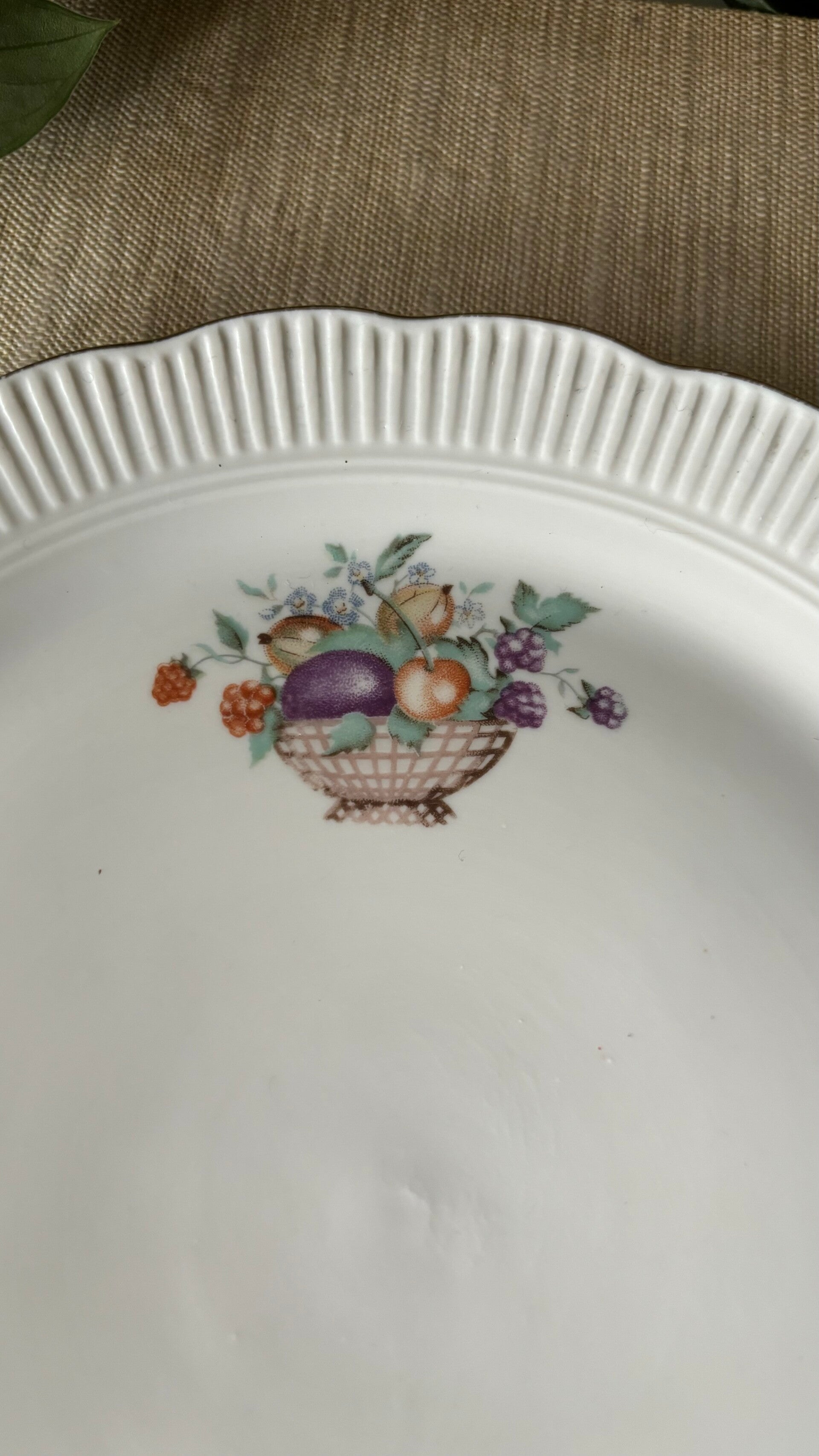 Fruittest van Pools porselein, porseleinfabriek Chodziez. Met zowel op het vergiet als het onderbord mooie afbeeldingen van fruit. Het porselein heeft een geribbelde rand. Plaatje voor in de keuken. Onderop gesigneerd en genummerd.