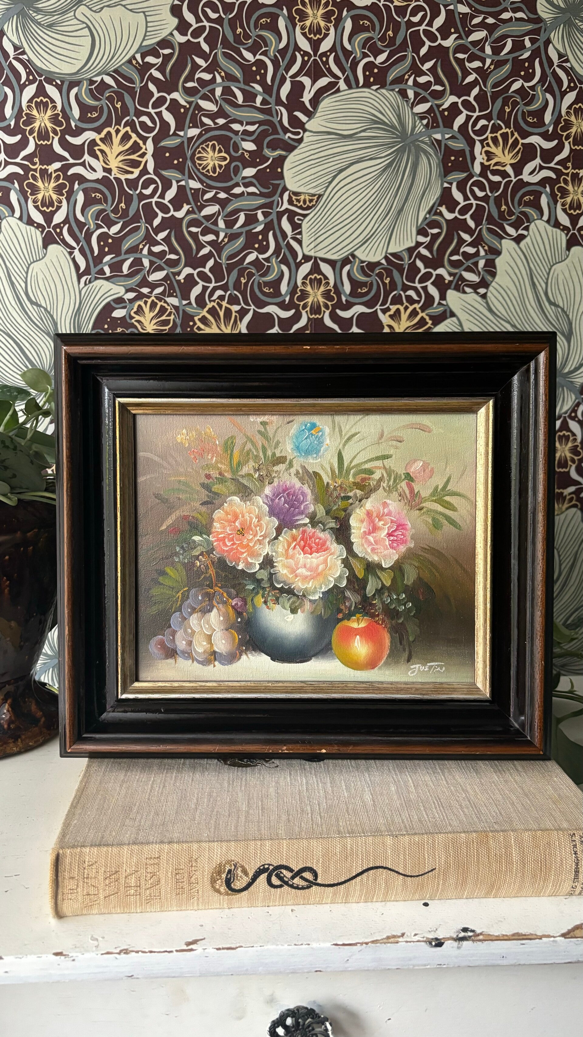 Prachtig olieverf schilderij in houten lijst. Met kleurige bloemen in vaas en fruit. Ook het formaat is perfect, heel mooi tussen een schilderijen wand maar ook als eyecatcher los op een lege wand.