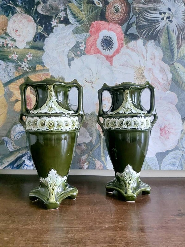 Prachtige antieke Art Nouveau vazen van Gustave de Bruyn. Handgemaakt en beschilderd. De antiek groene kleur met daarop madeliefjes maakt de vaas erg bijzonder. Gemaakt in 1900. Gemerkt en gesigneerd op de onderkant en in een goede conditie.