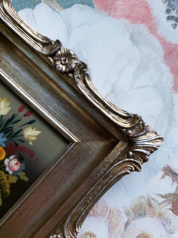 Twee prachtige Italiaanse olieverf schilderijtjes in een adembenemende houten lijst. Vrolijk boeket in frisse kleuren. Geschilderd op hout en gesigneerd onder de pot. Hoe leuk op een schilderijenwand.