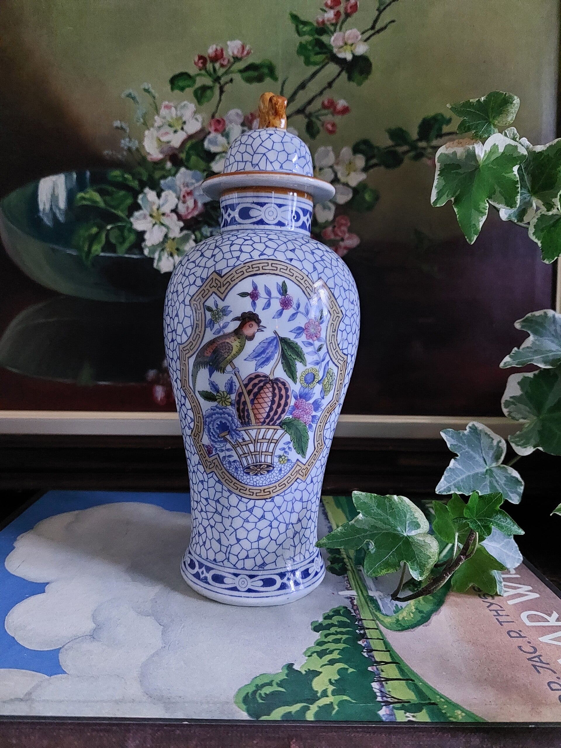 Wat een cutey is deze mooie Oosterse dekselvaas. Prachtige blue&white effecten met in het midden een vogel en floral.