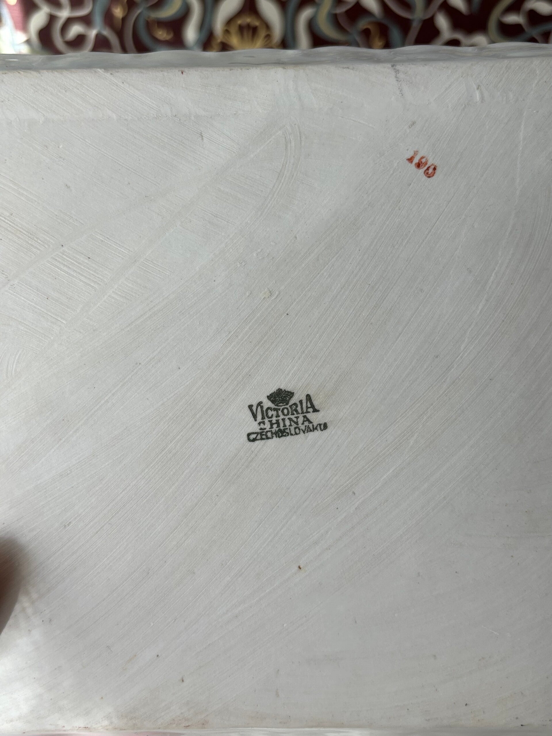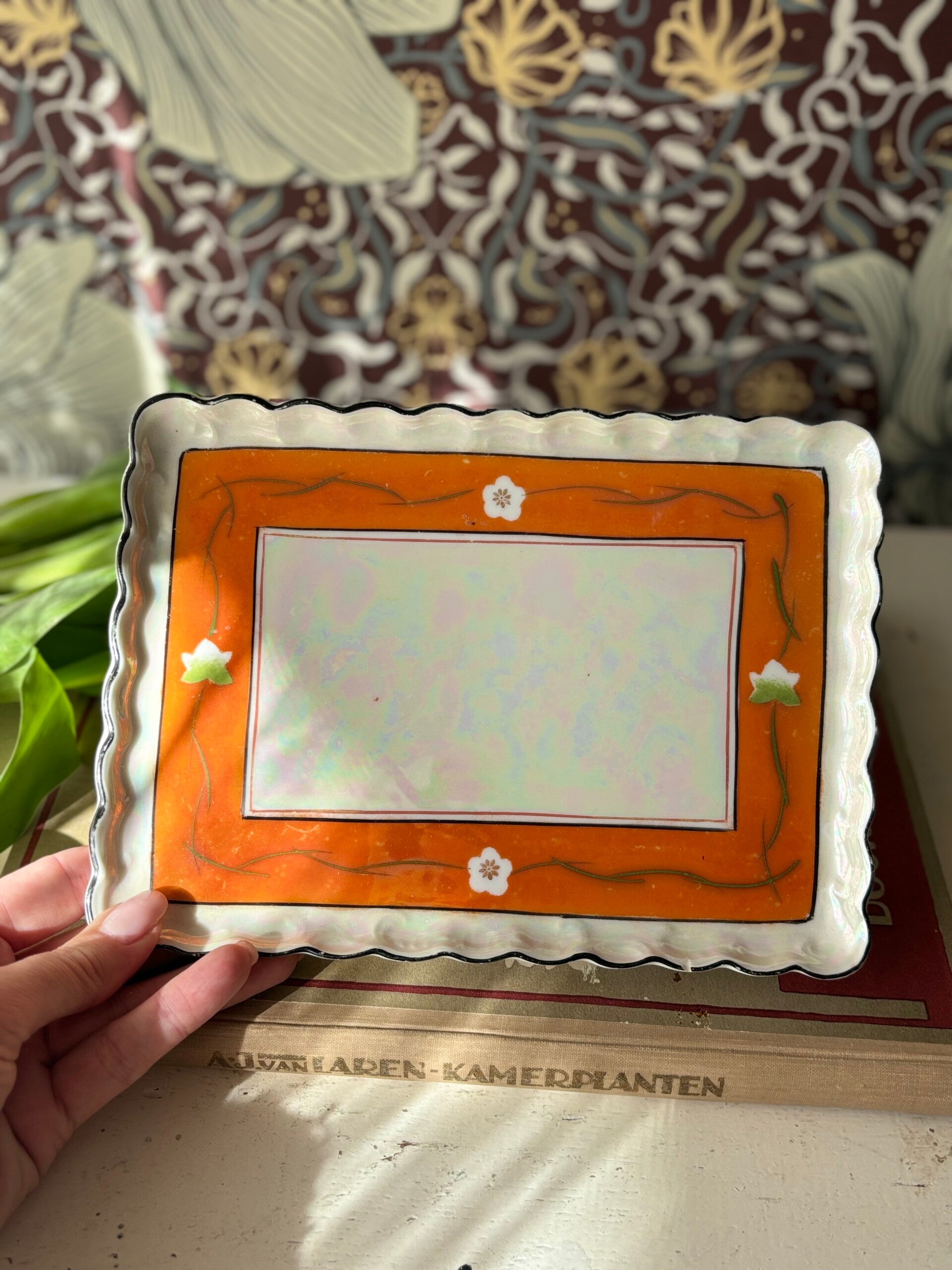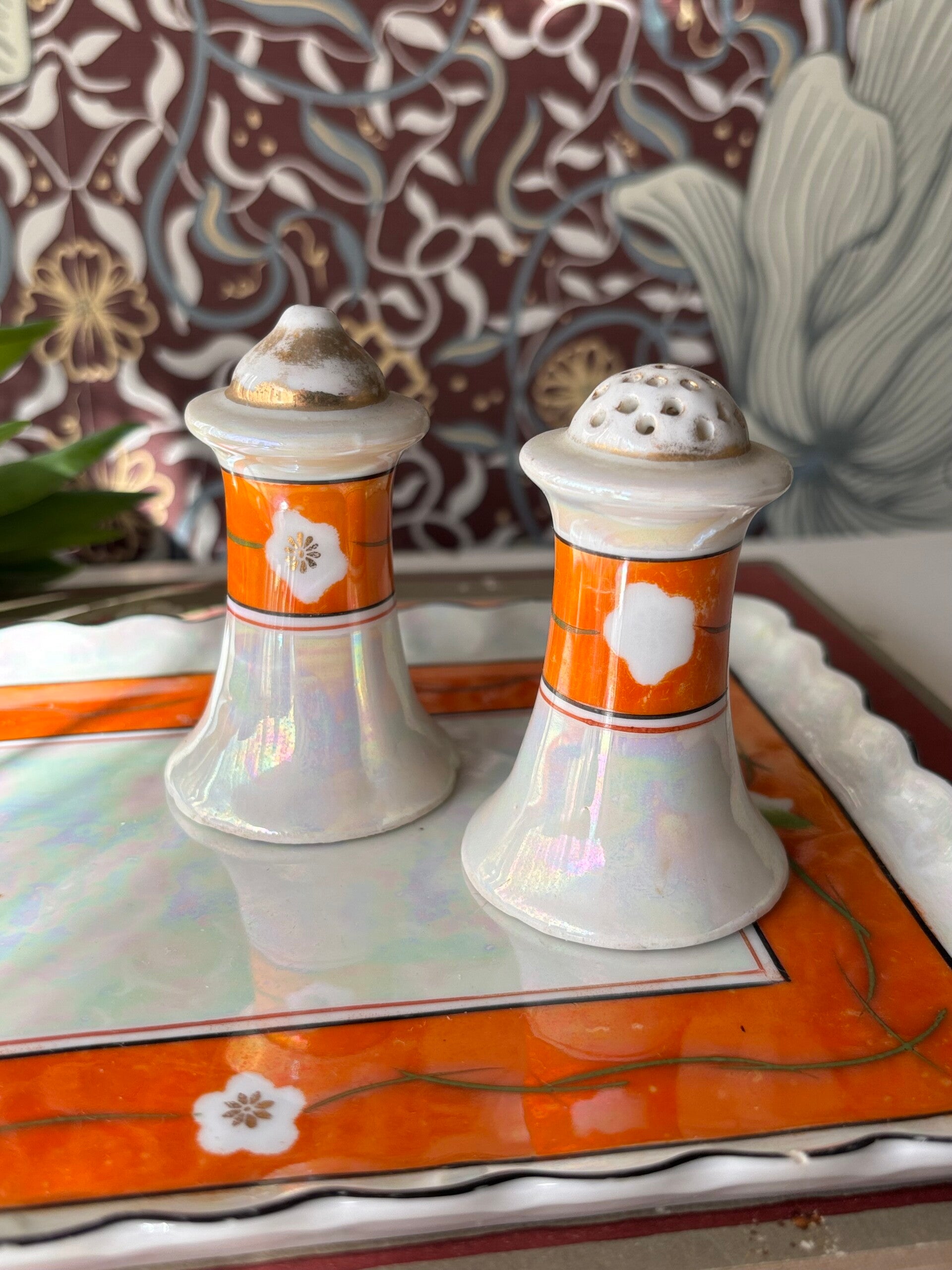 Prachtig setje dit oranje met parelmoer glans! Bestaande uit een schaal, 4 eierdoppen en een peper & zout stel. Gemaakt van Chinees porselein, onderop gesigneerd.