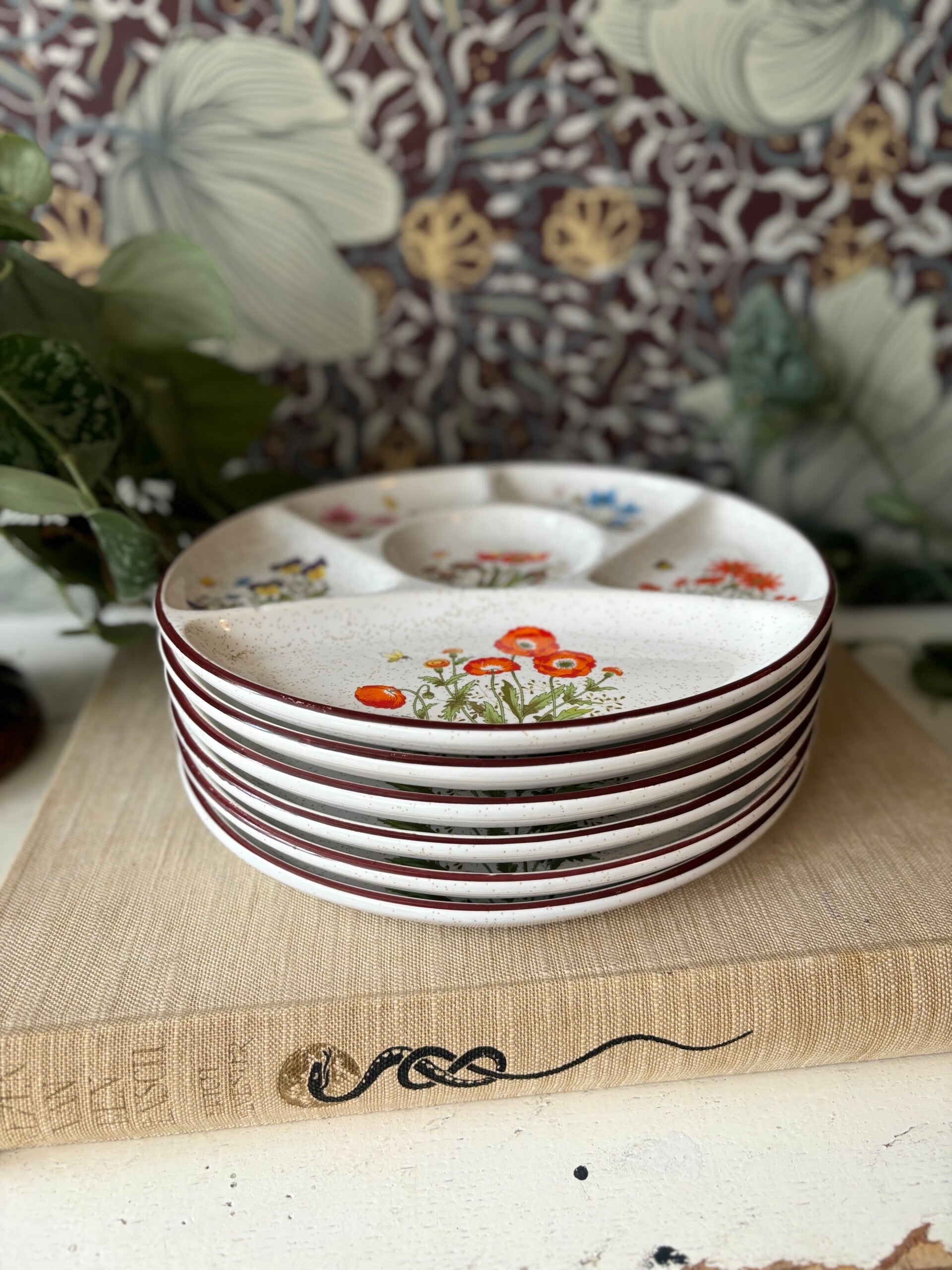 Set van 6 Botanica gourmetborden. Vintage uit de jaren '70. Met 6 vakjes en in elk vakje een veldbloem. Te leuk voor met Pasen!